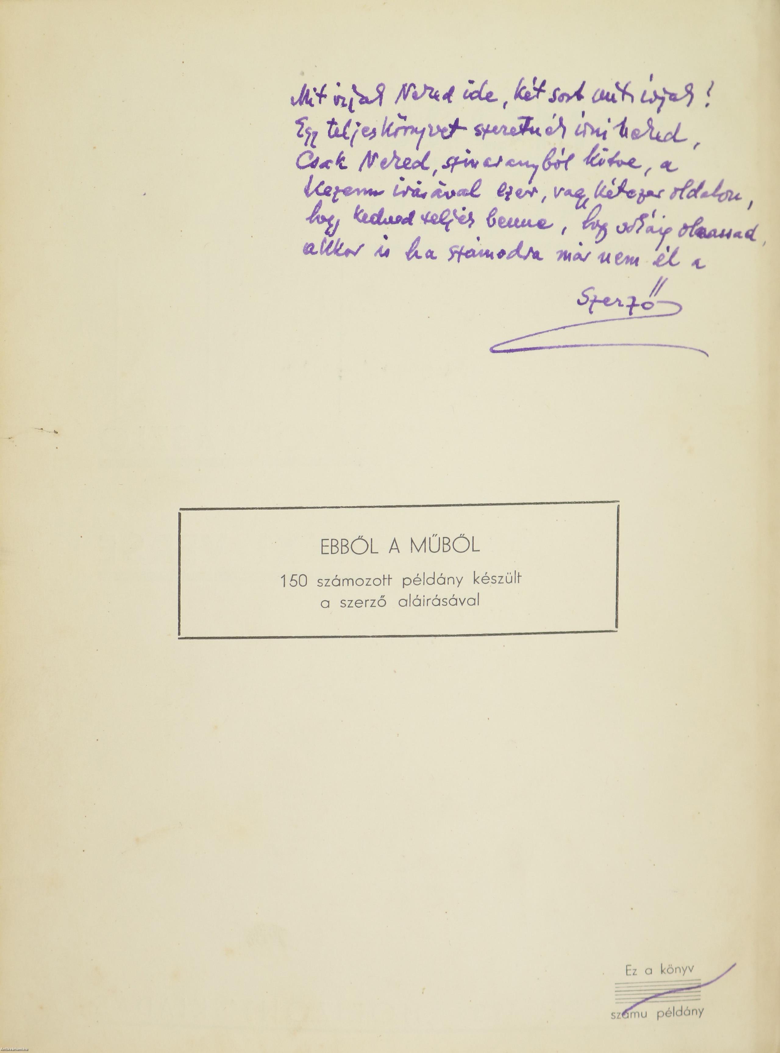 A címlap verzóján a szerző, Jávor László tollal írt, névre szóló dedikációja olvasható: "Mit írjak Neked ide, két sort mit írjak? Egy teljes könyvet szeretnék írni Neked. Csak Neked, színaranyból kötve, a Kezem írásával ezer, vagy kétezer oldalon, hogy kedved teljék benne, hogy sokáig olvassad, akkor is ha számodra már nem él a Szerző"