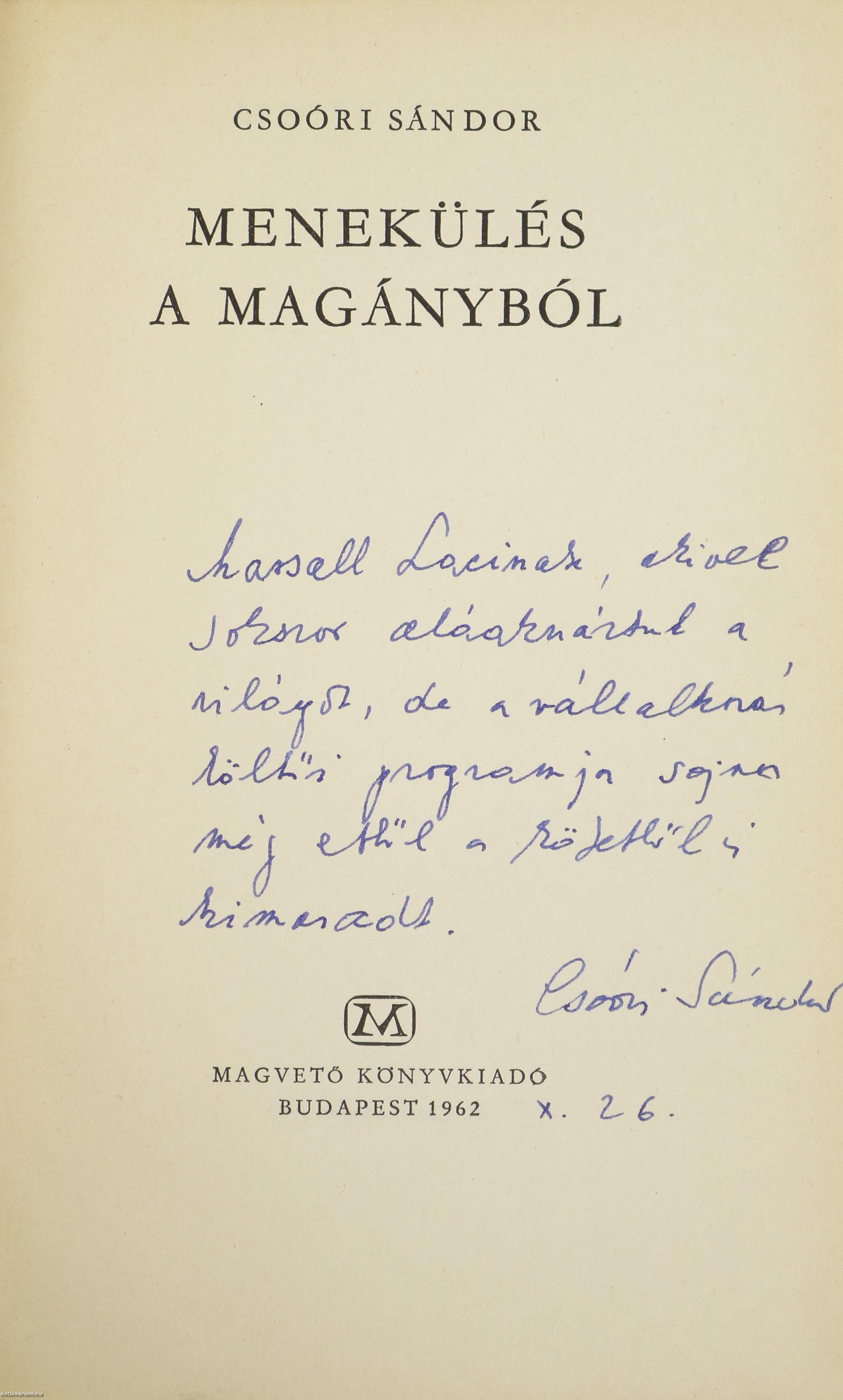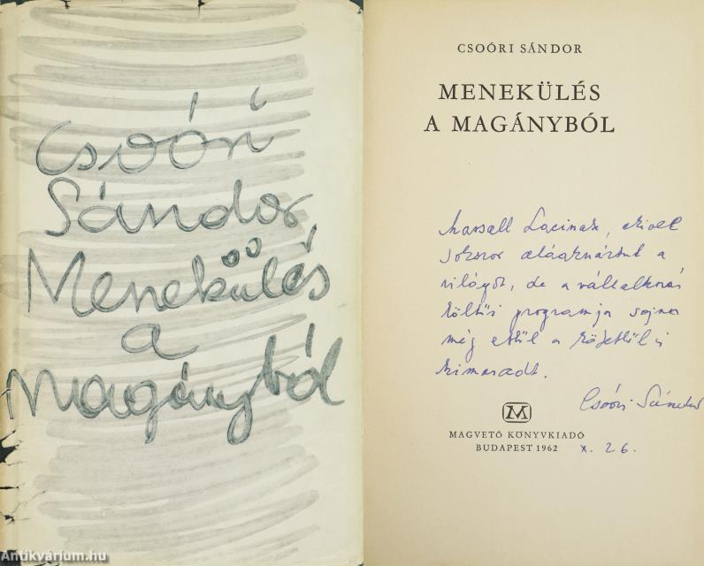 Szerző által dedikált példány. Első kiadás. Menekülés a magányból. Írta: Csoóri Sándor.