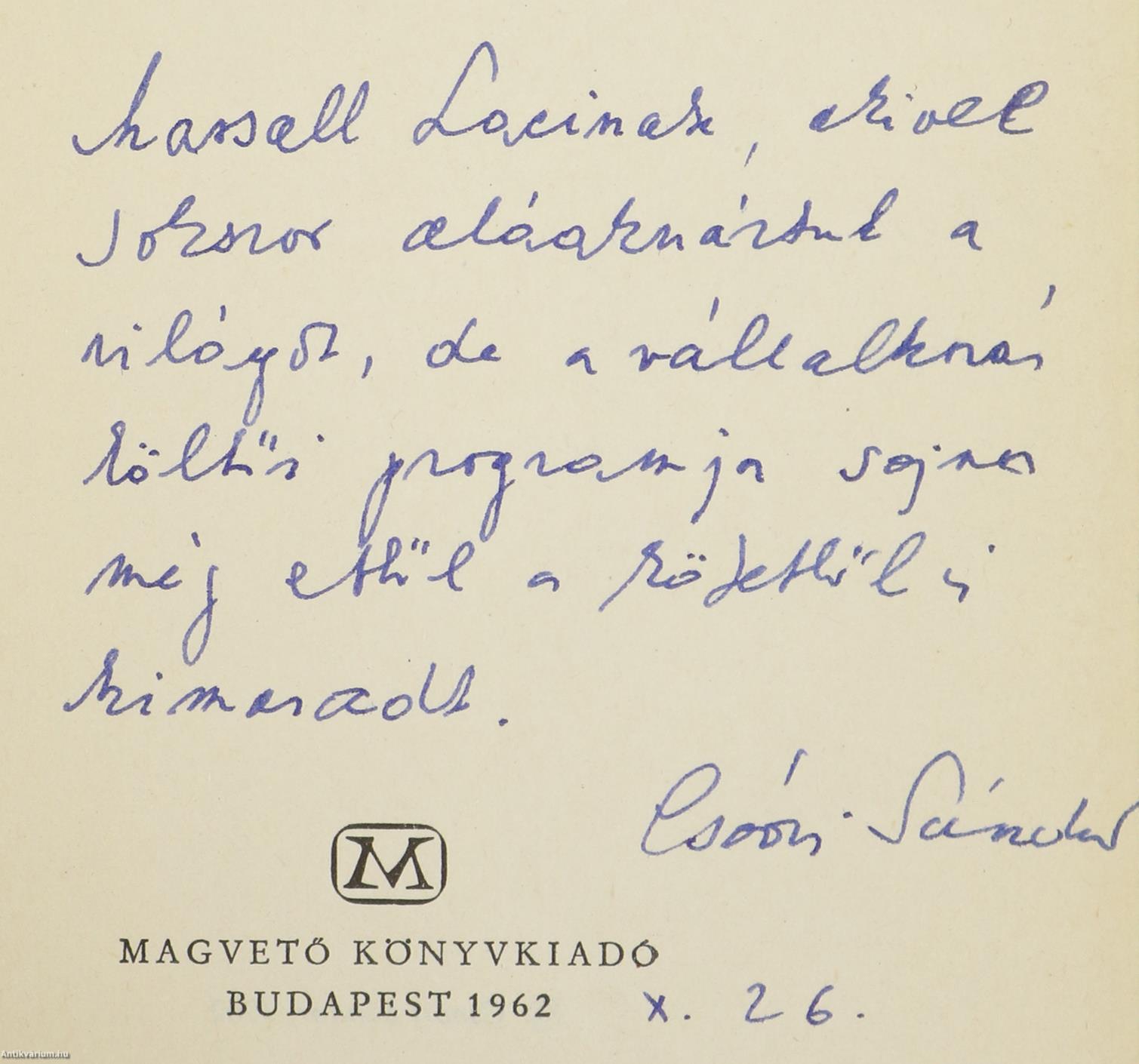 A címlapon a szerző, Csoóri Sándor tollal írt, névre szóló dedikációja olvasható: "Marsall Lacinak, akivel sokszor aláaknáztuk a világot, de a vállalkozás költői programja sajnos még ebből a kötetből is kimaradt. Csoóri Sándor. 1962. X. 26."