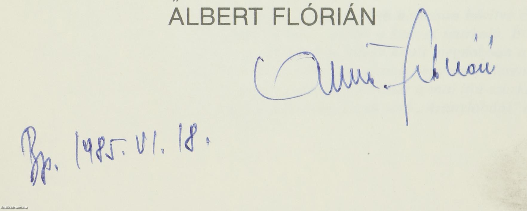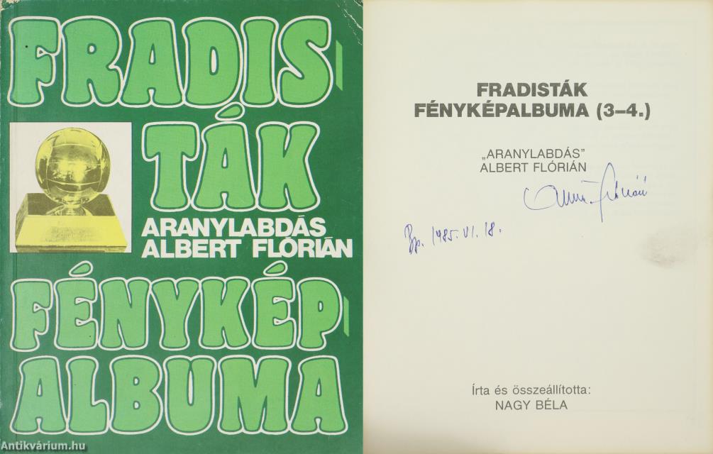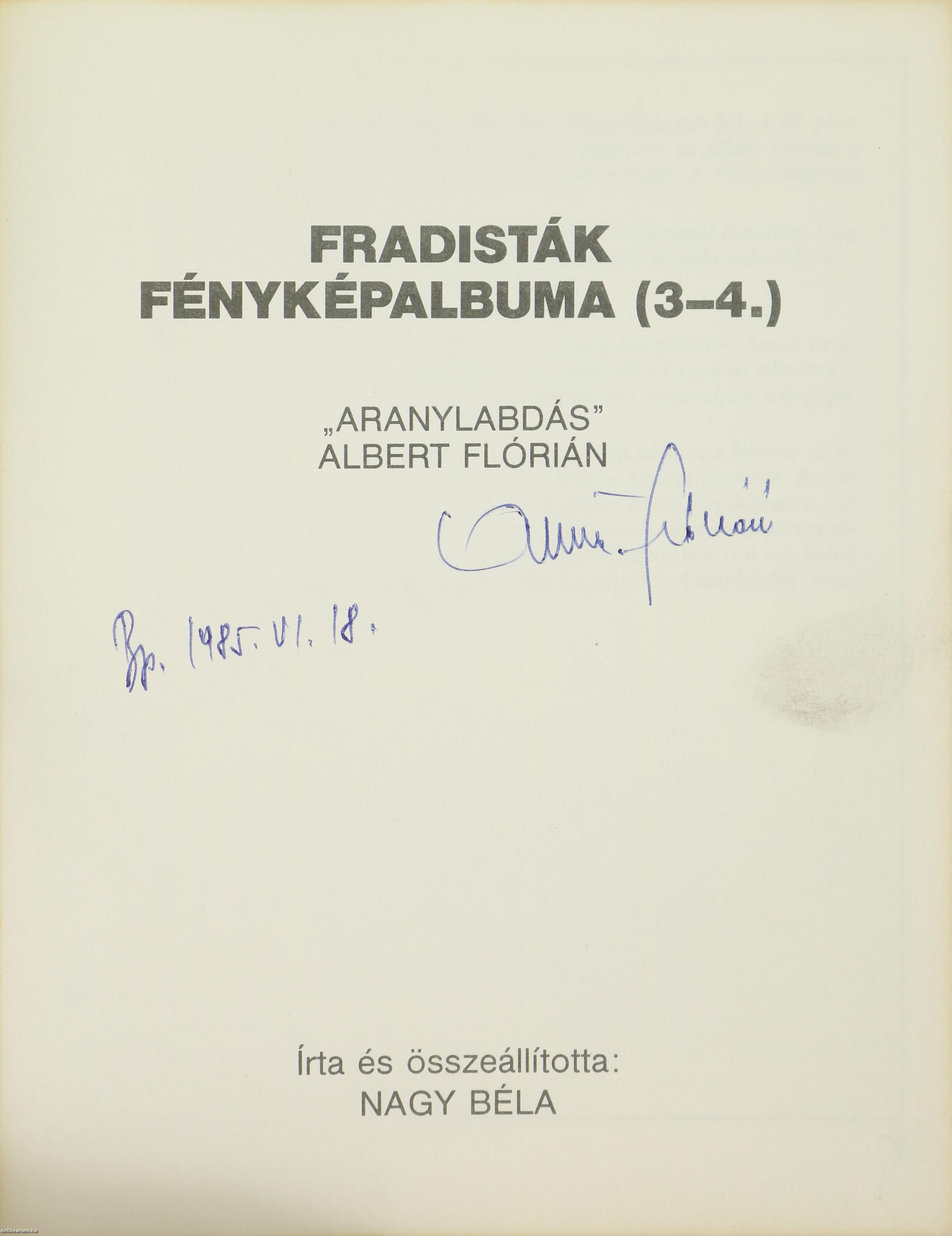 Albert Flórián labdarúgó által aláírt példány. Első kiadás. Fradisták fényképalbuma (3-4.). "Aranylabdás" Albert Flórián. Írta és összeállította: Nagy Béla. A címlapon Albert Flórián labdarúgó tollal beírt, jól olvasható aláírása látható. Szöveg közti, fekete-fehér fotókkal gazdagon illusztrált, valamint egy bevezető résszel és korabeli reklámokkal kiegészített kiadás. Fényképek: Albert Flórián és Nagy Béla gyűjteményéből Almási László, Kovács Gyula, Petrovics László, Pobuda Tibor, Pozsonyi Lajos, Magdics László felvételei. Nyomtatta a Szikra Lapnyomda. Kiadói ragasztott papírkötésben lévő példány két színnel feliratozott, színes illusztrációval ellátott címfedéllel, feliratozatlan könyvgerinccel, Albert Flóriánról készült fényképpel illusztrált hátlappal, hiánytalan állapotban. "A héten nagy sikerű sportkiadvány jelent meg. Nagy Béla: Aranylabdás Albert Flórián című könyve a fradisták fényképalbum-sorozatában került kiadásra. Albert Flórián pályafutását magánéletének egy-egy pillanatát 254 fotó és az „Aranylabdás” visszaemlékezései elevenítik fel színesen." - írta a kötetről a Vasárnapi Hírek c. hetilap (1985. június 16./1. évfolyam/4. szám). A kötetet aláírta, Albert Flórián (Hercegszántó, 1941. szeptember 15. – Budapest, 2011. október 31.) a Nemzet Sportolója címmel kitüntetett magyar válogatott labdarúgó, az egyedüli magyar aranylabdás. Az 1950-es évek végétől az első kiemelkedő képességű hazai játékos. Pályafutása alatt végig, 1952-től 1974-ig a Ferencváros játékosa volt. Háromszor lett gólkirály, négyszer nyert magyar bajnokságot, egyszer Magyar Népköztársaság-kupát. A válogatottban a csatársor ünnepelt csillagává nőtte ki magát. 1967-ben nyerte el az Aranylabdát, az európai labdarúgás legfontosabb egyéni trófeáját.