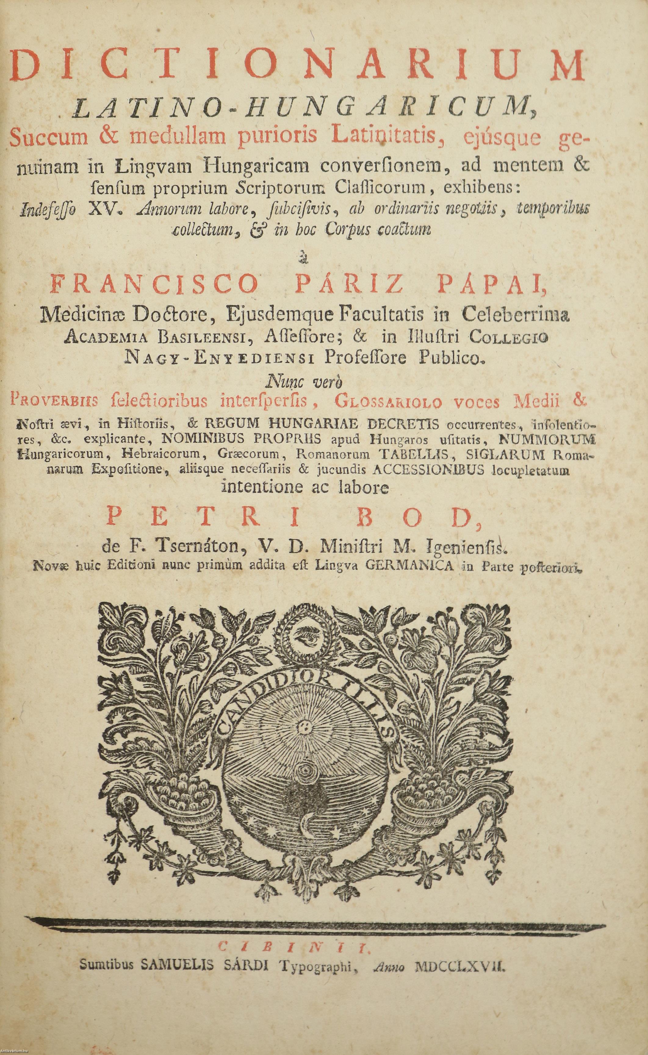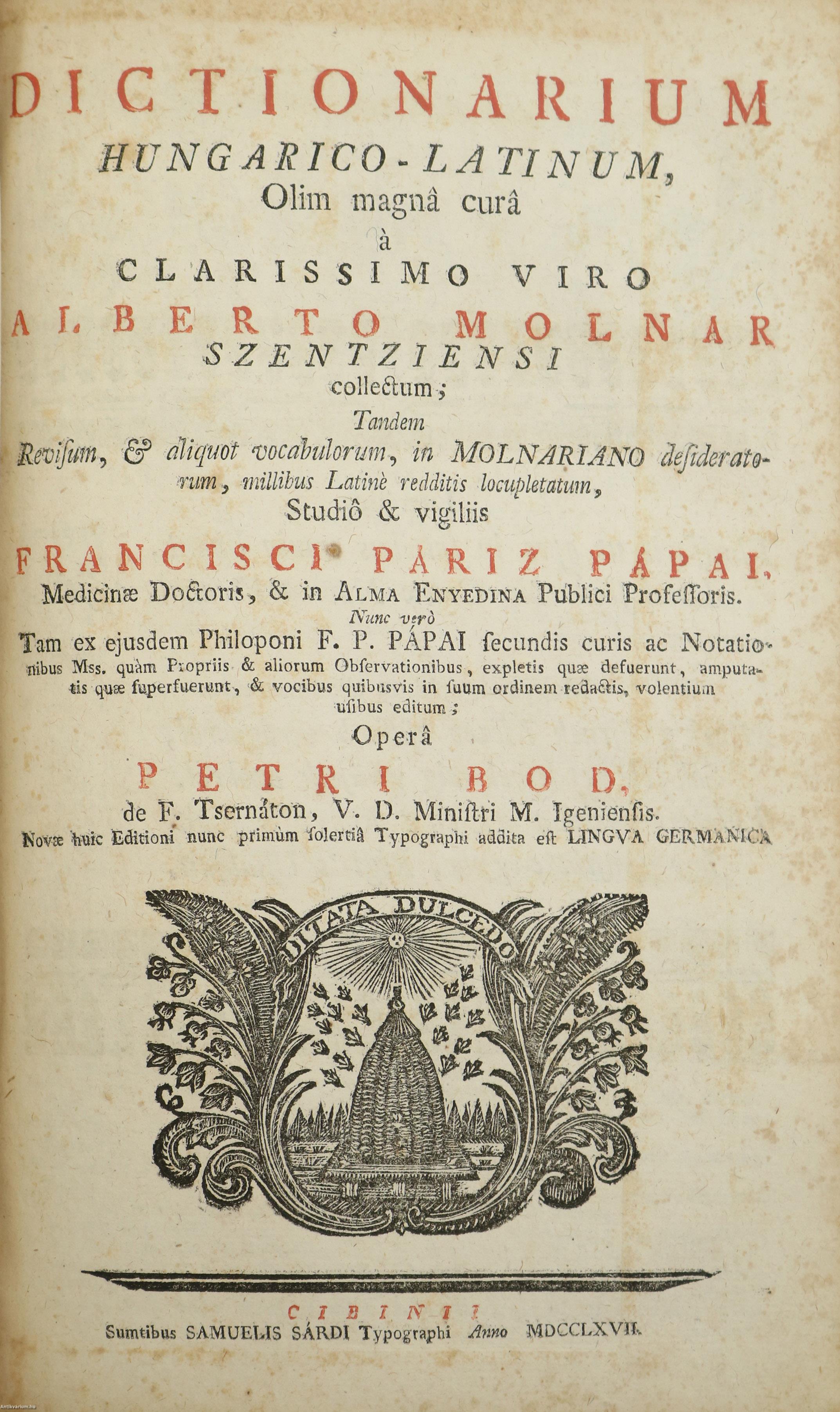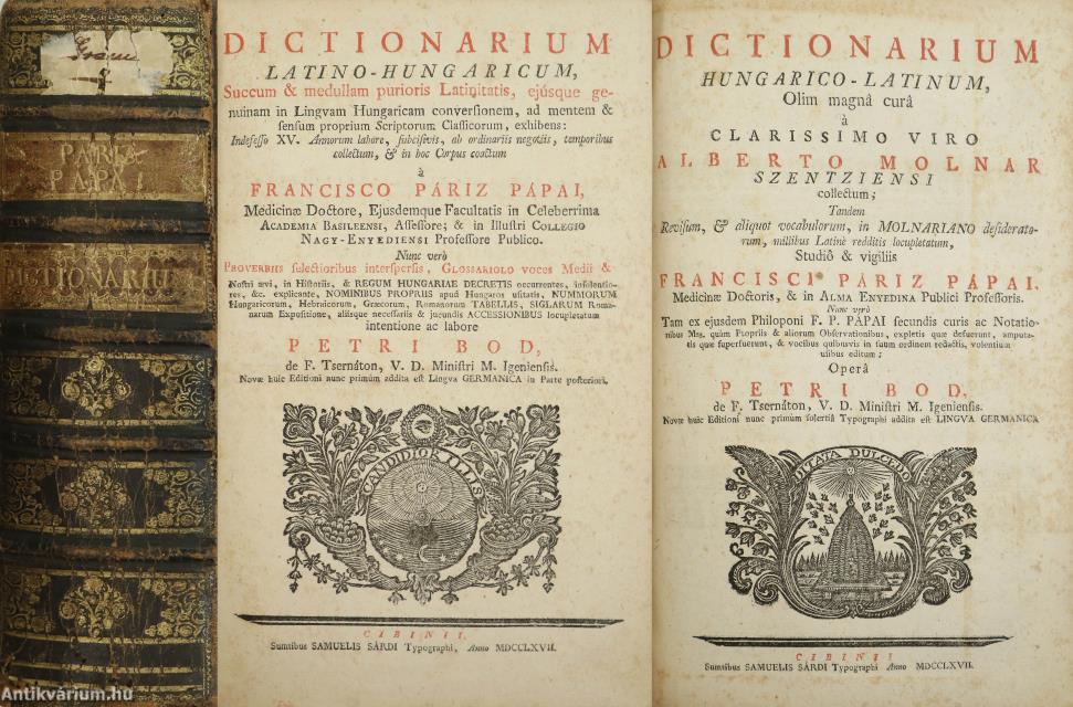 Dictionarium latino-hungaricum. - Dictionarium hungarico-latinum. / Latin-magyar szótár. - Magyar-latin szótár. (két kötet egy könyvben) Írta: Francisco Páriz Pápai [Pápai Páriz Ferenc].