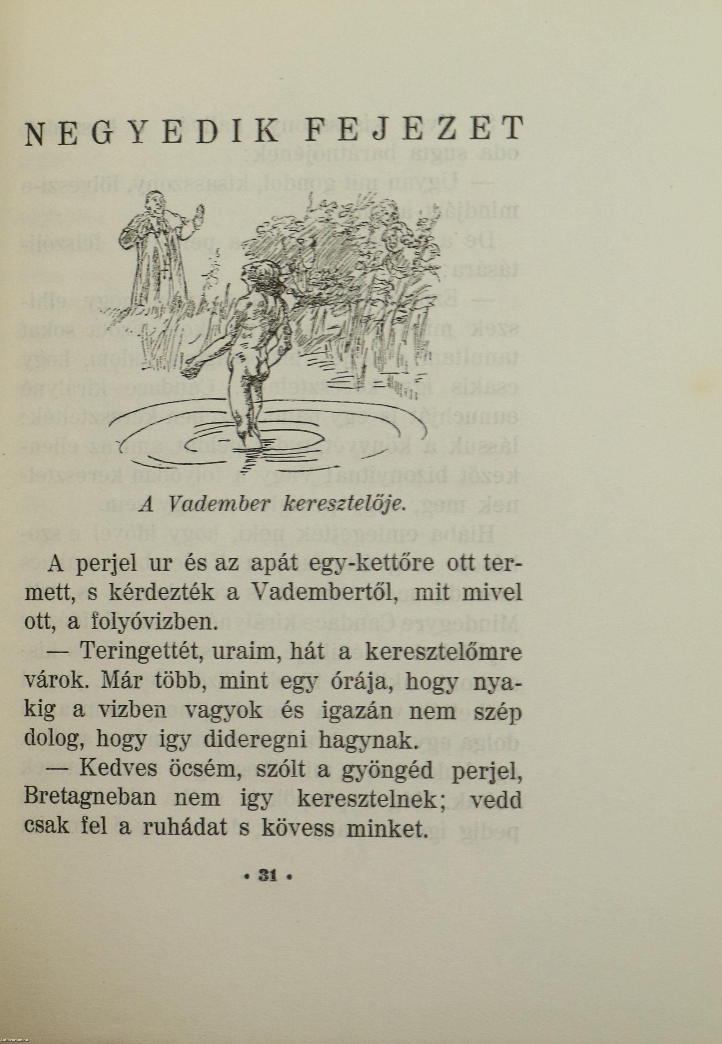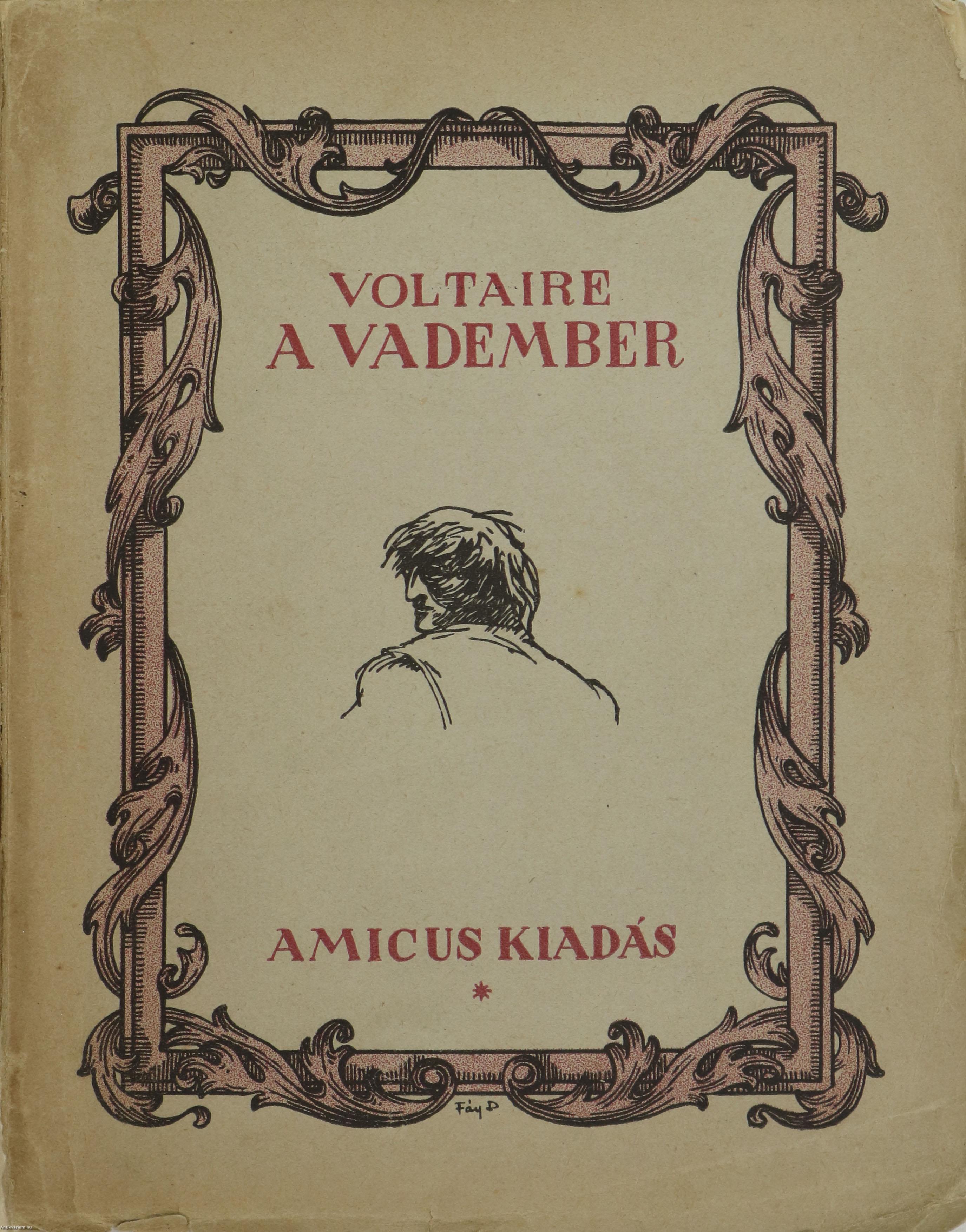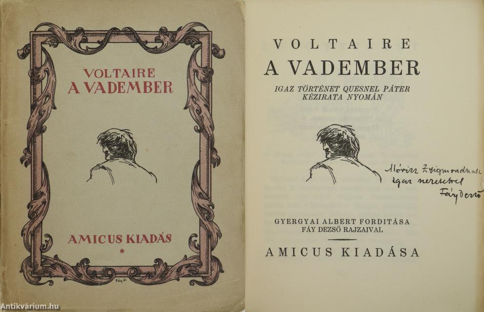 Grafikus által dedikált példány. Régiségek-ritkaságok. No.: 7. Első magyar nyelvű kiadás. A vadember. Igaz történet Quesnel páter kézirata nyomán. Írta: Voltaire. Fordította: Gyergyai Albert. Borítóterv és rajzok: Fáy Dezső.