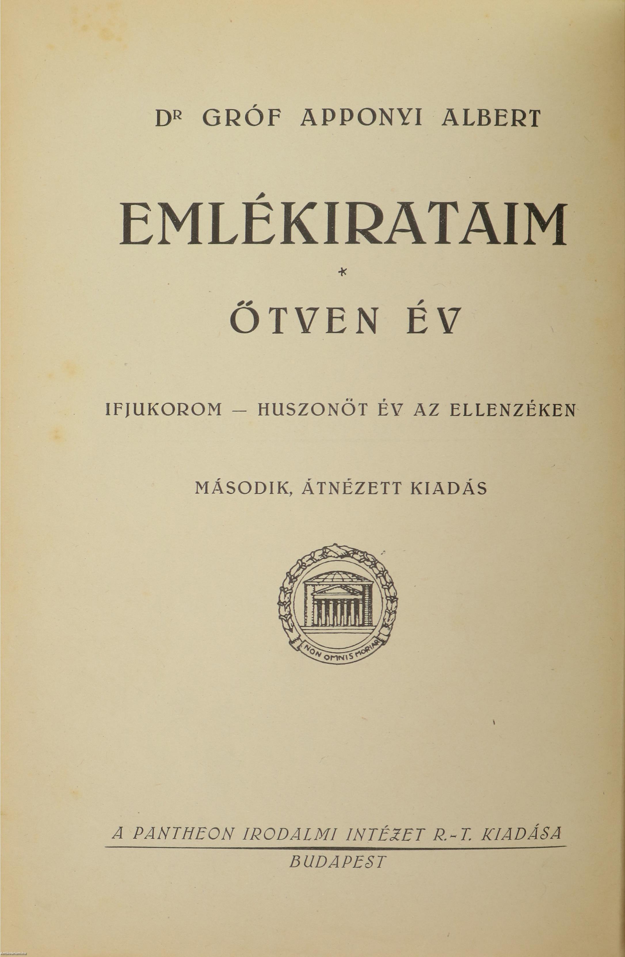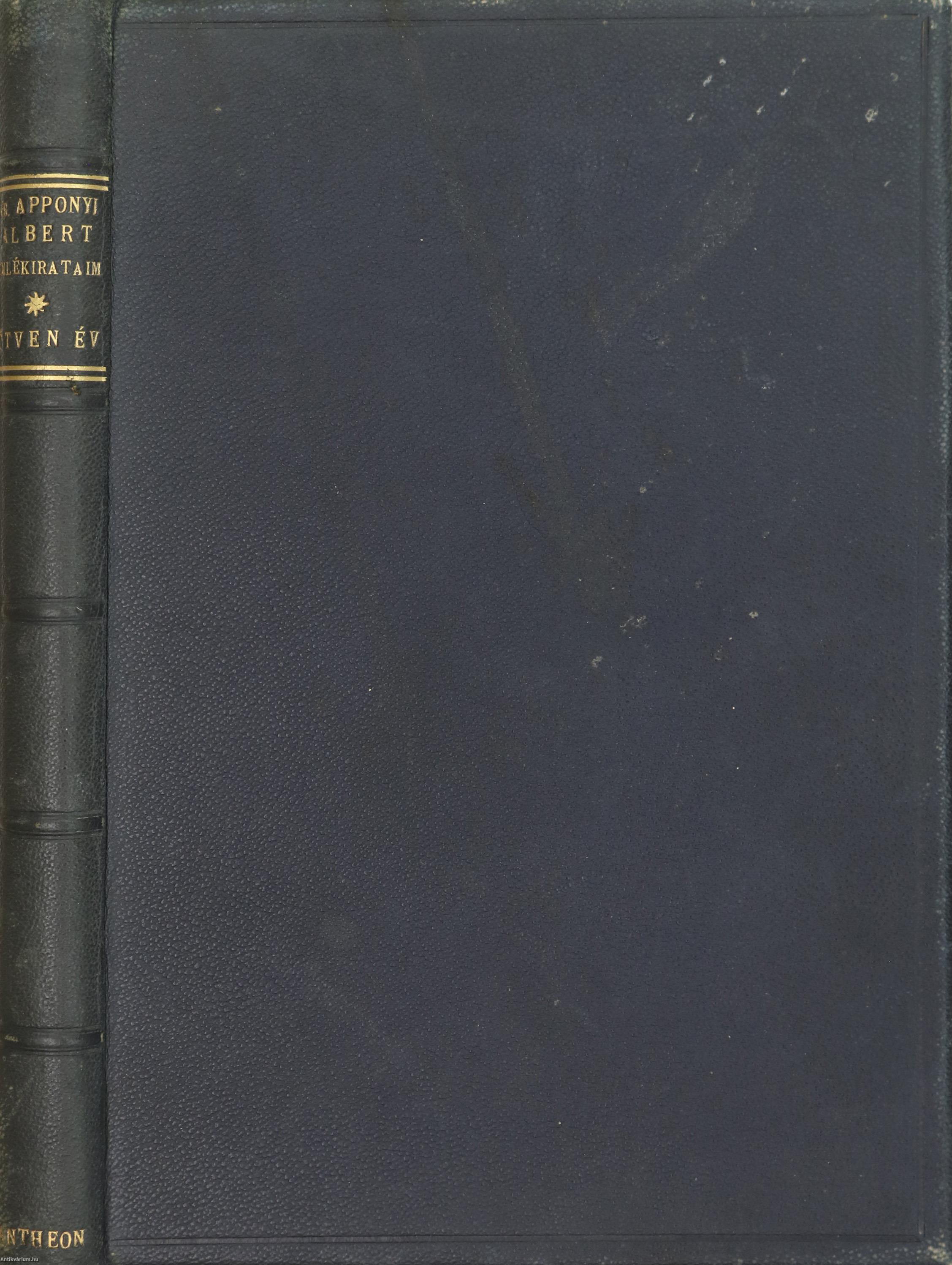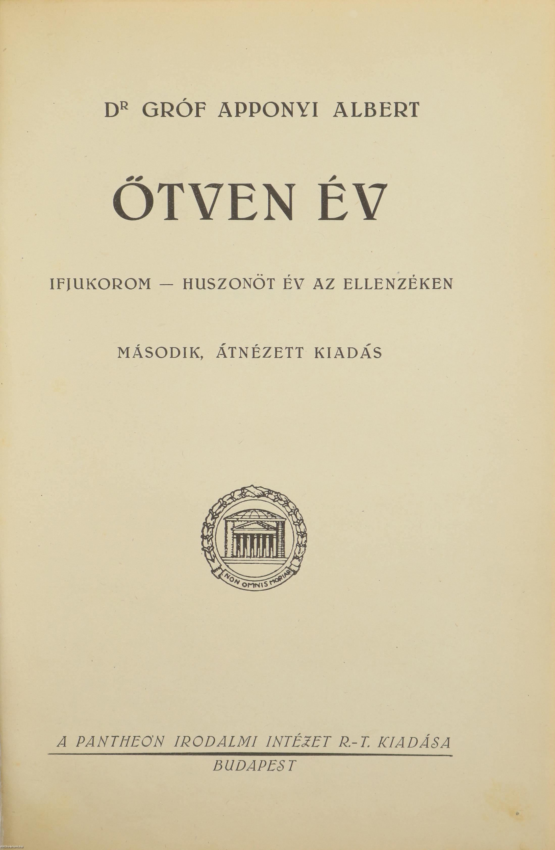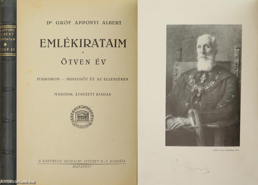 Szerző által aláírt példány. Ötven év. Ifjúkorom - huszonöt év az ellenzéken. Írta: Gróf Dr. Apponyi Albert. A címlapkép alatt a szerző, Gróf Apponyi Albert tollal beírt aláírása látható. Második, átnézett kiadás. Glatter Gyula a szerzőt ábrázoló festményéről (1925) készült reprodukcióval illusztrált, tartalomjegyzékkel és névmutatóval ellátott kötet. Nyomtatta a "Globus" Nyomdai Műintézet, Budapesten. Kiadói bőrkötésben lévő példány, feliratozatlan címfedéllel és hátlappal, aranyozott feliratozású könyvgerinccel, színes előzéklapokkal, felül színezett lapélekkel, hiánytalan állapotban. A kötet szerzője, Gróf Apponyi Albert (1846-1933) politikus, nagybirtokos, a Magyar Tudományos Akadémia igazgatósági tagja. Apponyi a Monarchia hazai politikai életének egyik meghatározó szereplője volt: két alkalommal vallás- és közoktatásügyi miniszter (1906-1910, 1917-1918), belső titkos tanácsos, az ellenzék vezére. Az első világháború után ő vezette az 1920-as párizsi békekonferencián részt vevő magyar delegációt, ahol emlékezetes védőbeszédben szólalt fel a béketervezet ellen.