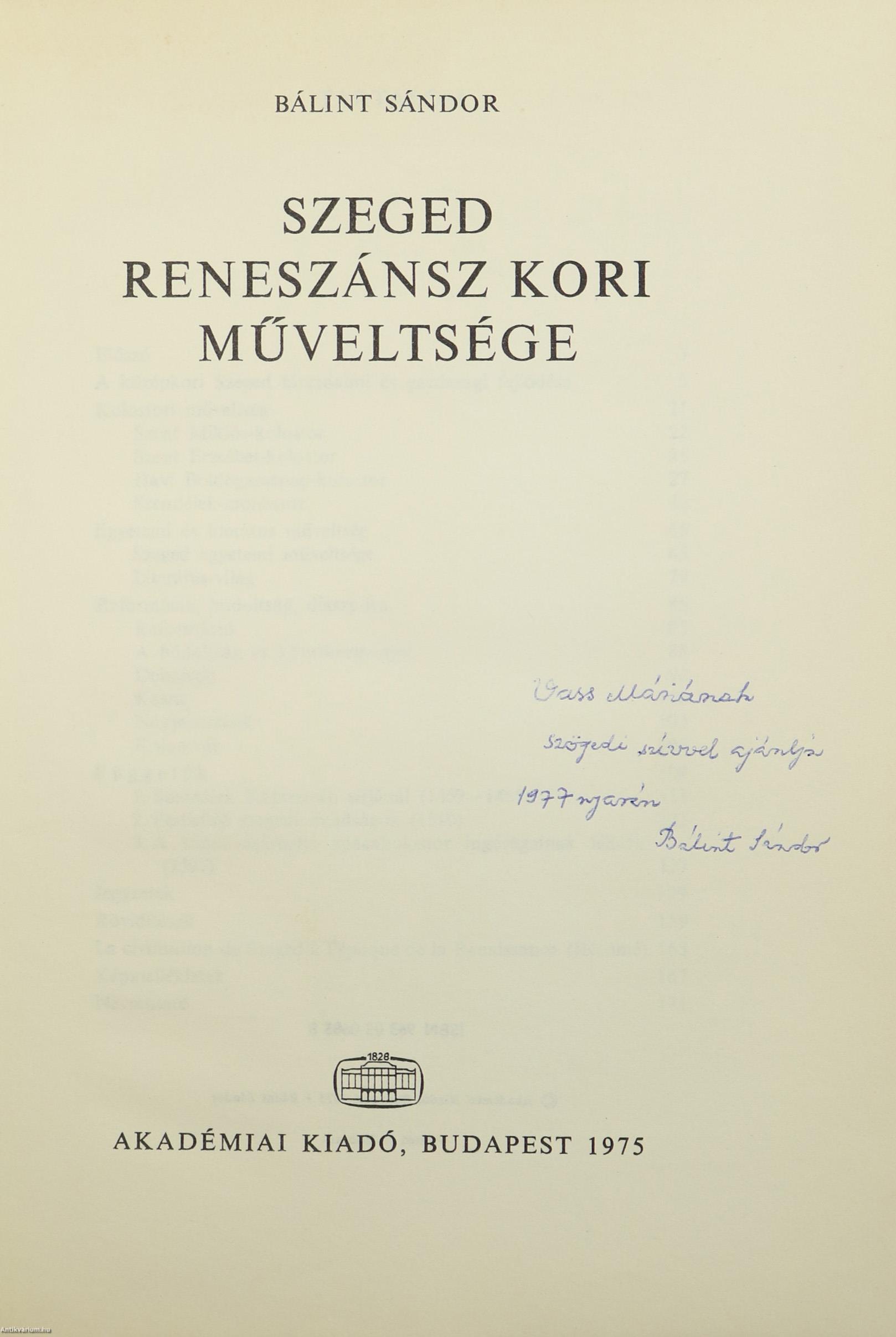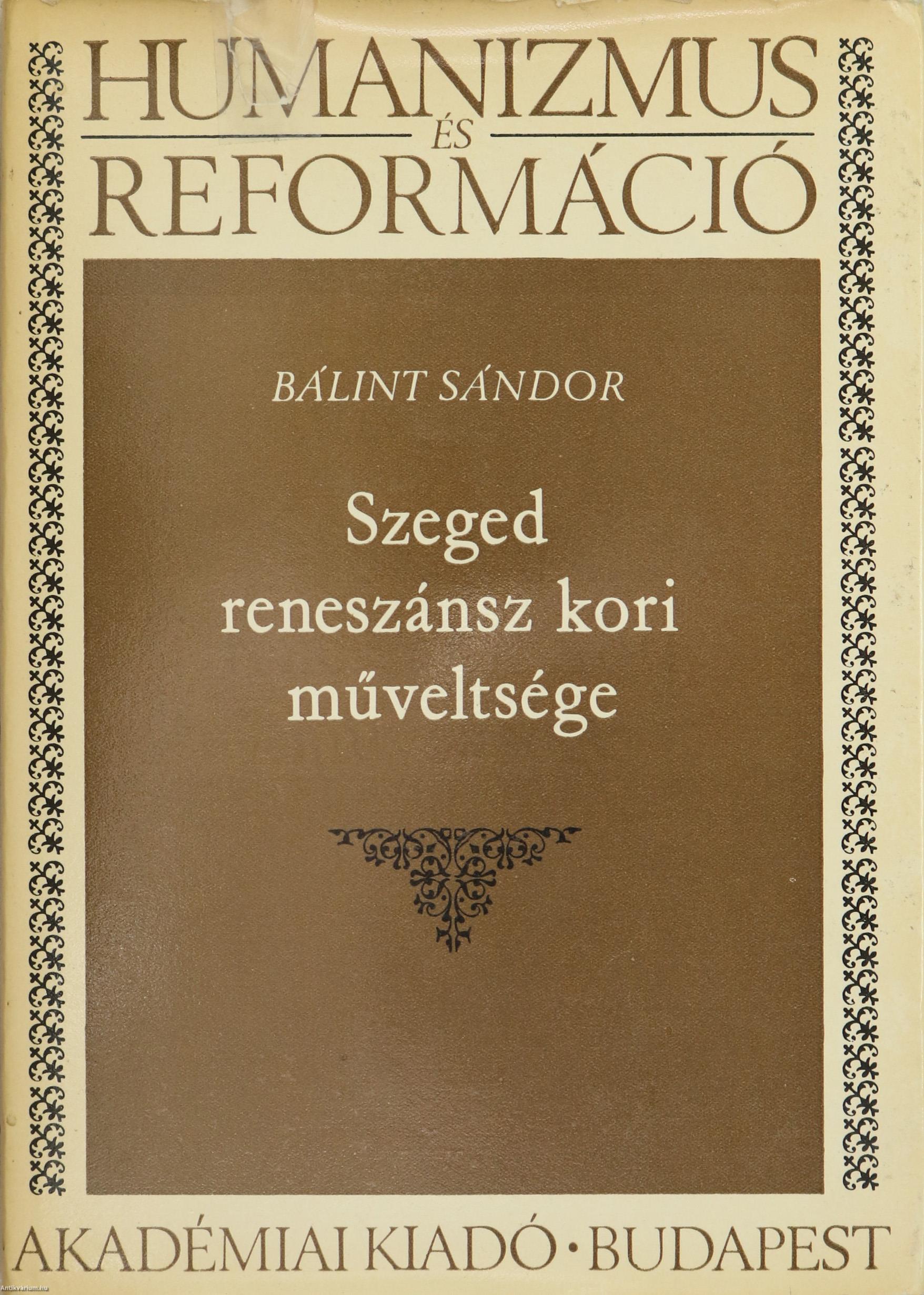 Szerző által dedikált példány. Első kiadás.Humanizmus és Reformáció c. sorozatban megjelent mű. No. 5. sz. Szerkesztette: Klaniczay Tibor. Szeged reneszánsz kori műveltsége. Írta: Bálint Sándor. A címlapon a szerző, Bálint Sándor tollal írt, névre szóló dedikációja olvasható: "V. M.-nak szögedi szívvel ajánlja 1977. nyarán Bálint Sándor." Szöveg közti, fekete-fehér képekkel illusztrált, valamint szerzői előszóval, a rövidítések jegyzékével, francia nyelvű összefoglalóval, betűrendes névmutatóval és tartalomjegyzékkel ellátott tanulmánykötet. Nyomtatta az Akadémiai Nyomda Budapesten. Kiadói egészvászon kötésben lévő példány, feliratozatlan címfedéllel és hátlappal, aranyozott feliratozású könyvgerinccel, hiánytalan állapotban, feliratos, könyvdíszekkel gazdagított fülszöveges, javított kiadói borítófedélben. A kötet szerzője, Bálint Sándor (Szeged, 1904. augusztus 1. – Budapest, 1980. május 10.) magyar néprajzkutató, művészettörténész. A 20. századi magyar néprajz és folklorisztika egyik legnagyobb alakja, rövid ideig nemzetgyűlési képviselő. Fő kutatási területei: az Alföld néprajza, a vallási néphagyományok, Szeged néprajza.