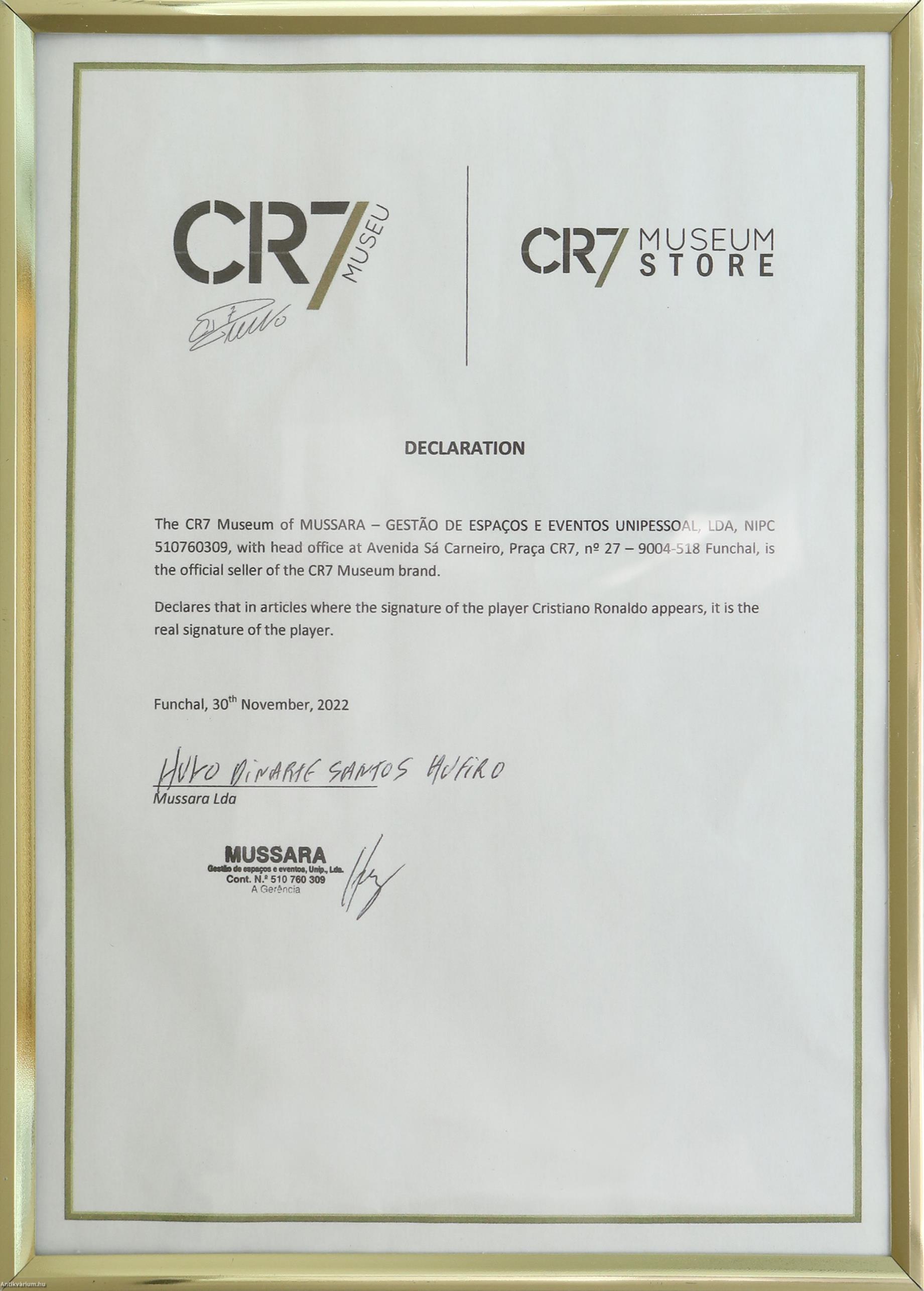 The CR7 Museum of MUSSARA - GESTAO DE ESPAÇOS E EVENTOS UNIPESSOAL, LDA, NIPC 510760309, with head office at Avenida Sá Carneiro, Praça CR7, no 27 - 9004-518 Funchal, is the official seller of the CR7 Museum brand.Declares that in articles where the signature of the player Cristiano Ronaldo appears, it is the real signature of the player. Funchal, 30th November, 2022"