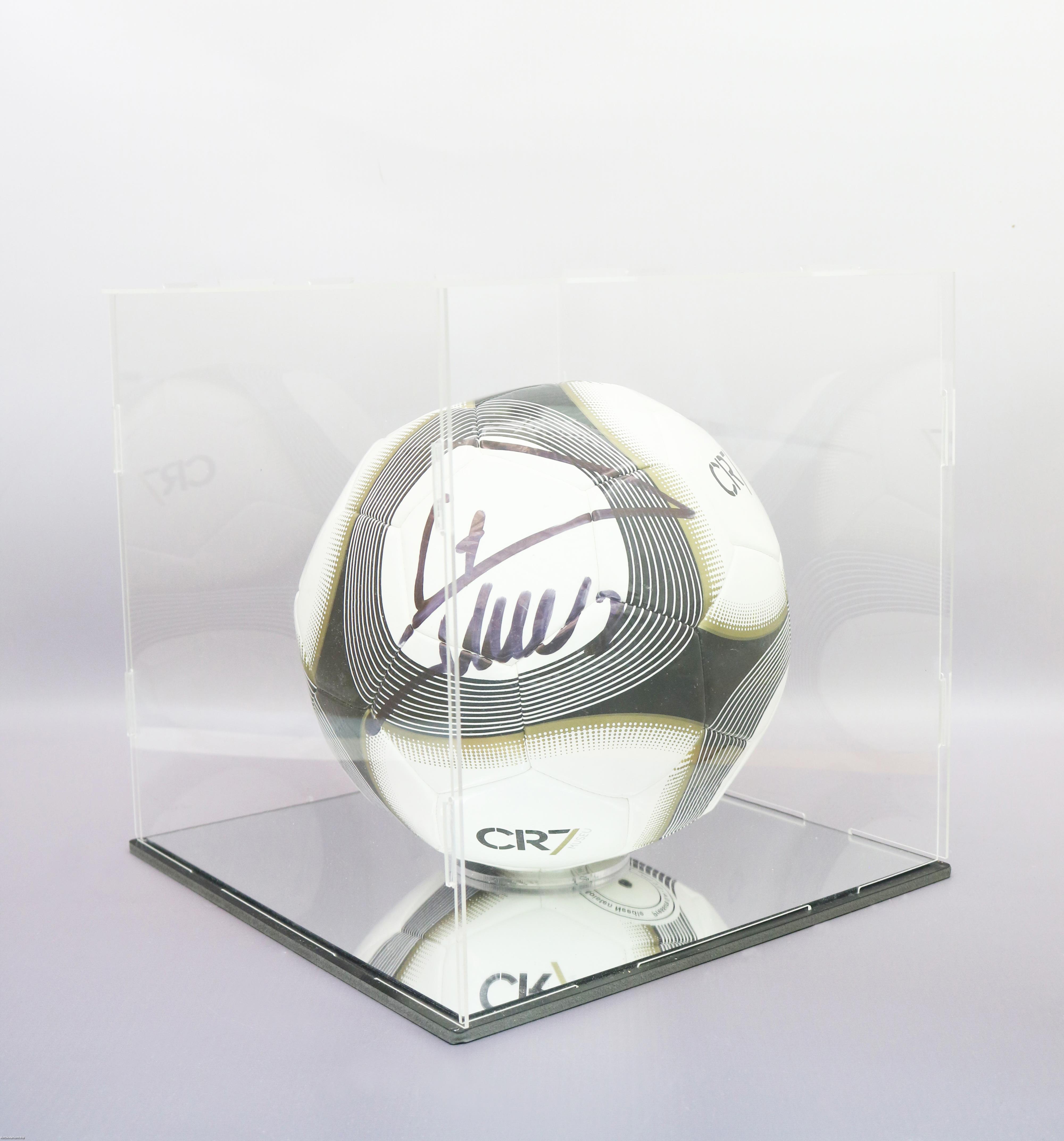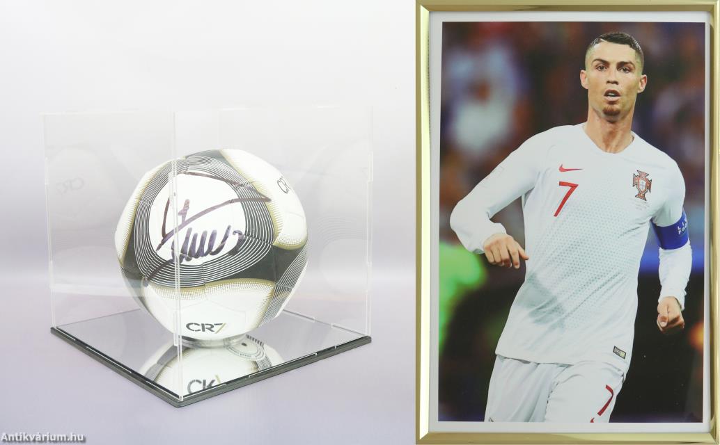 Cristiano Ronaldo legendás portugál labdarúgó által aláírt bőr futball labda - Tükrös aljú, focilabda-kiállító vitrinben.