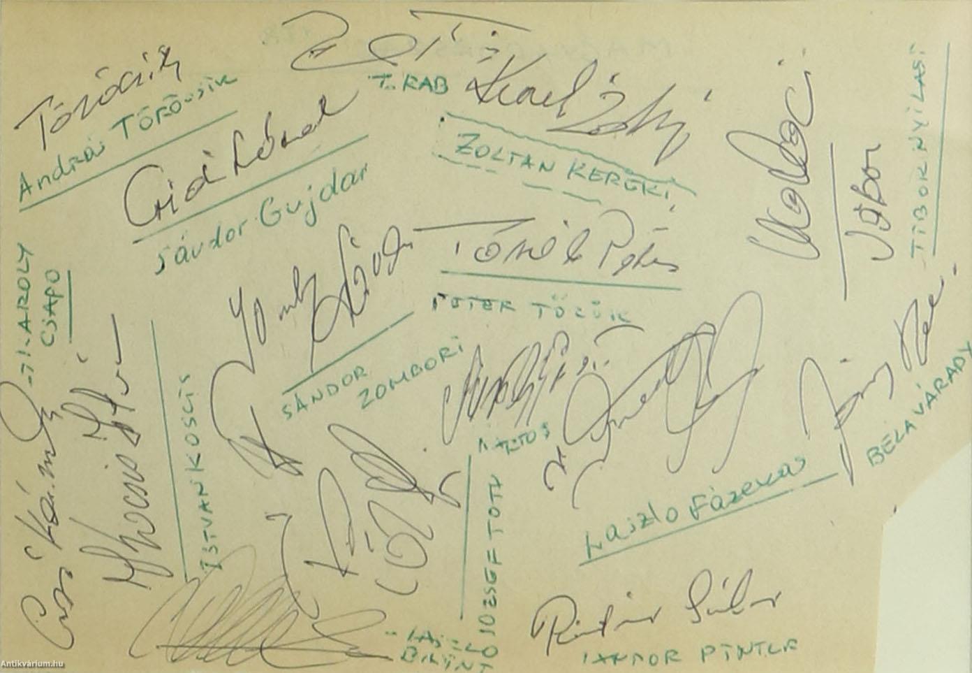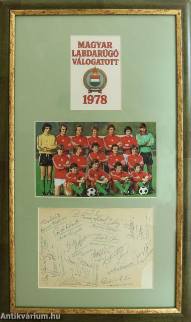 Az 1978-as Magyar Labdarúgó Válogatott tagjai által aláírt lap, valamint a róluk készített színes kép.