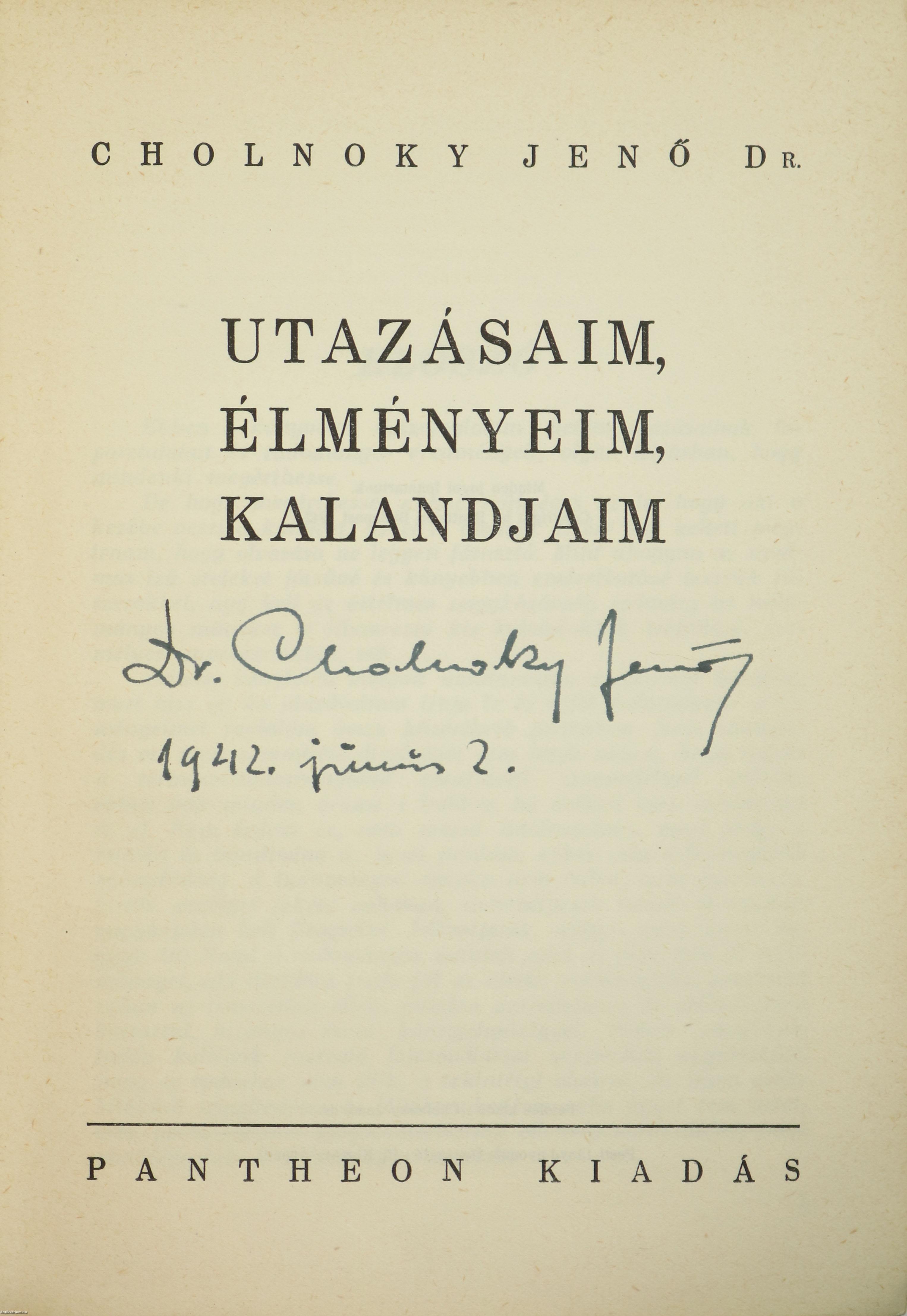 Szerző által aláírt példány. Első kiadás. Utazásaim, élményeim, kalandjaim. Írta: Dr. Cholnoky Jenő. A címlapon a szerző, Dr. Cholnoky Jenő tollal írt, jól olvasható aláírása látható. 135 szöveg közti, fekete-fehér ábrával (rajzok, térképek) és 47 fekete-fehér, feliratozott fotóval illusztrált, valamint szerzői előszóval, bevezetéssel és részletes tartalomjegyzékkel kiegészített kötet. Nyomtatta a Pesti Lloyd Nyomda. Kiadói félvászon kötésben lévő példány, feliratozatlan, a kiadó aranyozott emblémájával ellátott címfedéllel, aranyozott feliratozású könyvgerinccel, hiánytalan állapotban. A kötet szerzője, Cholnoky Jenő (Veszprém, 1870. július 23. – Budapest, 1950. július 5.) nemzetközi hírű, magyar földrajztudós, szakíró, szerkesztő, egyetemi tanár, MTA tag. Magyarország Területi Épségének Védelmi Ligájának aktív, megbecsült tagja, a Magyar Tudományos Akadémia levelező tagja. Egyetemi tanulmányait Budapesten végezte a Műegyetem vízépítési szakán, később filozófiai doktorátust is ott szerzett. A Műegyetem Vízépítési Tanszékének kiváló tanársegédje a méltán híres Klimm Mihály professzor mellett. Időközben megismerkedett id. Lóczy Lajossal, az akkor már világhírű földrajztudóssal és Ázsia-kutatóval, aki 1894-ben meghívta őt maga mellé asszisztensnek a Tudományegyetem Földrajzi Tanszékére. 1905-ben a Kolozsvári Tudományegyetemre nyilvános rendes tanárnak nevezték ki és megbízták az új tanszék vezetésével. 1919-ben a románok bevonulása után menekülnie kellett Kolozsvárról. Budapesten földrajzi szakértőként beosztották a béketárgyalásokat előkészítő bizottságba is. Hetvenéves volt, amikor 1940-ben nyugállományba vonult. Gazdag és értékes életművet hagyott hátra.