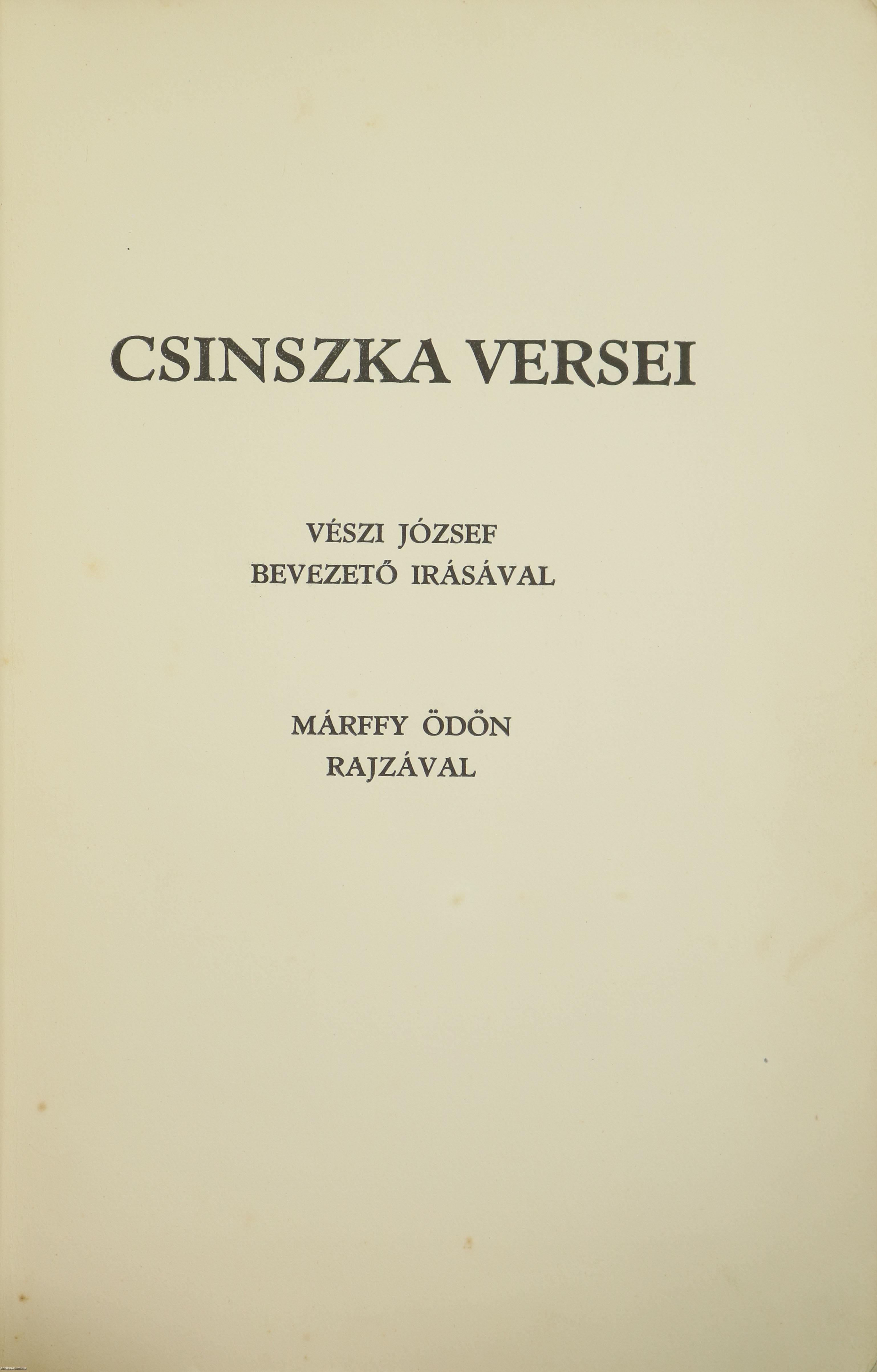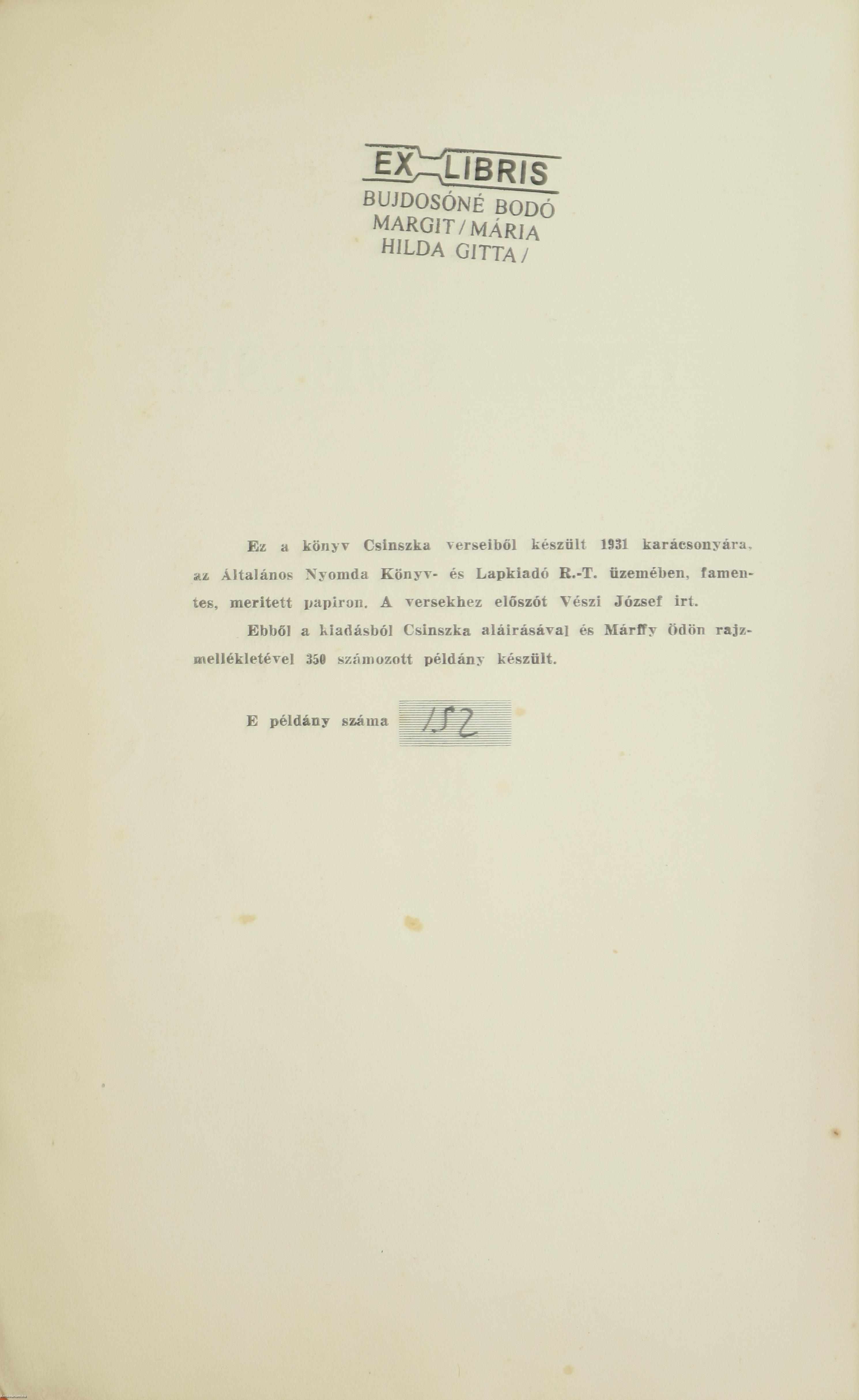 Szerző által aláírt példány. Első, számozott, bibliofil kiadás. Csinszka versei. Írta: Boncza Berta (Csinszka). A szerzőt ábrázoló portré alatt Boncza Berta (Csinszka) jól olvasható aláírása látható. "Ez a könyv Csinszka verseiből készült 1931 karácsonyára, az Általános Nyomda Könyv- és Lapkiadó R.-T. üzemében, famentes, merített papíron. A versekhez előszót Vészi József írt. Ebből a kiadásból Csinszka aláírásával és Márffy Ödön rajzmellékletével 350 számozott példány készült." E példány száma 152. Csinszkát ábrázoló fekete-fehér rajzzal illusztrált, valamint részletes tartalomjegyzékkel közzé tett verseskötet. A címlap verzóján tulajdonosi bélyegzés látható. Kiadói varrott papírkötésben lévő példány, feliratozott címfedéllel, feliratozatlan könyvgerinccel és hátlappal, hiánytalan állapotban. A szerző, Boncza Berta (költői nevén Csinszka) (Csucsa, 1894. június 7. – Budapest, 1934. október 24.) költőnő, emlékiratíró. Csinszka anyja 1910-től négy éven át svájci Lutryben a "Le Marronier" leány-nevelőintézetben taníttatta, ahonnan a tizenhat éves Boncza Berta túlfűtött hangú leveleivel hódította meg az ekkor Svájcban diákoskodó későbbi erdélyi írót, Tabéry Gézát. Még e románc idején, 1911 novemberében kezdeményezett Berta levelezést Ady Endrével is, de az első személyes találkozásukra csak 1914. április 23-án került sor, amikor a költő ellátogatott Csucsára. Az év május 14-én Lám Béla erdélyi mérnök-író titokban eljegyezte Boncza Bertát, ám a nem egészen egy hónapig tartó mátkaságnak az időközben elmélyülő Ady-szerelem vetett véget. A Csinszka név eredete – szemben a közhiedelemmel – nem Ady leleménye, hanem valójában ő nevezte el Adyt tréfából „lengyel nemesi néven” Csacsinszkynek, röviden Csinszkynek. Erre született válaszul a Csinszka ragadványnév, amelyet aztán megtartott Ady halála után is. Ady Csinszka-versei 1914. július 1-jétől kezdtek megjelenni a Nyugatban. Bár édesapja határozottan ellenezte, Csinszka 1915. március 27-én Budapesten hozzáment Ady Endréhez. Ady Endre halála után Csinszka 1919 kora tavaszától Babits Mihállyal tartott fenn egy évig szerelmi kapcsolatot, majd 1920 augusztusában házasságot kötött Márffy Ödön festőművésszel. Csinszka a XX. század eleji múzsatípus jellegzetes alakja. Versei először 1931-ben, önéletrajzi írásai csak jóval halála után, 1990-ben jelentek meg nyomtatásban. Néhány rajza, fényképe köz- és magángyűjteményekben megtalálható. Csinszka valódi tehetsége abban rejlett, hogy személyisége másokat ösztönzött alkotásra. Ösztönös, érzelemben és hasonlatokban gazdag lírája üde, egyedi színfoltja a magyar lírának.