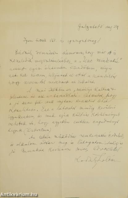 Kodály Zoltán háromszoros Kossuth-díjas zeneszerző autográf levele. (kézirat)