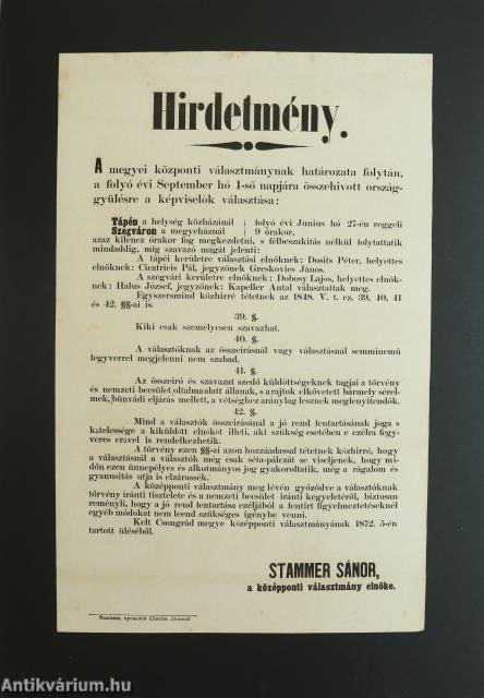 Az 1872. június 27-ére kitűzött országgyűlési képviselőválasztásról (Tápé és Szegvár) szóló hirdetményben Csongrád megye központi választmánya értesíti a választókat a szavazás időpontjáról és helyszíneiről. A szavazás reggel 9 órakor kezdődik és megszakítás nélkül tart. A dokumentum megnevezi a választási tisztségviselőket, hivatkozik az 1848. évi törvénycikkre, valamint előírja a személyes megjelenést és a fegyverviselés tilalmát.