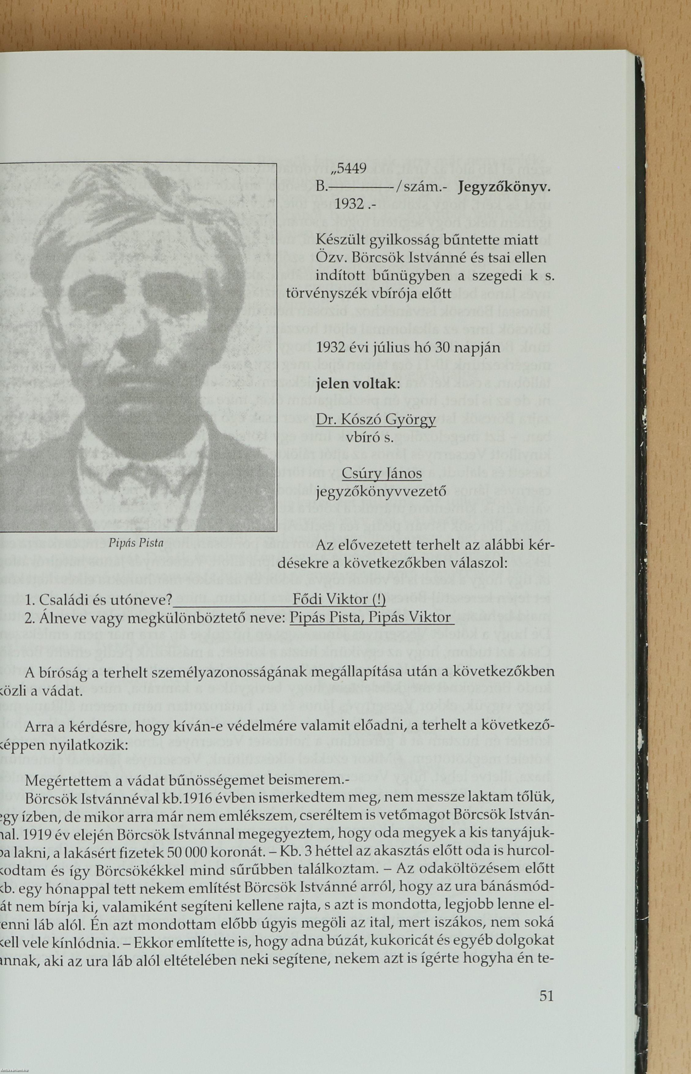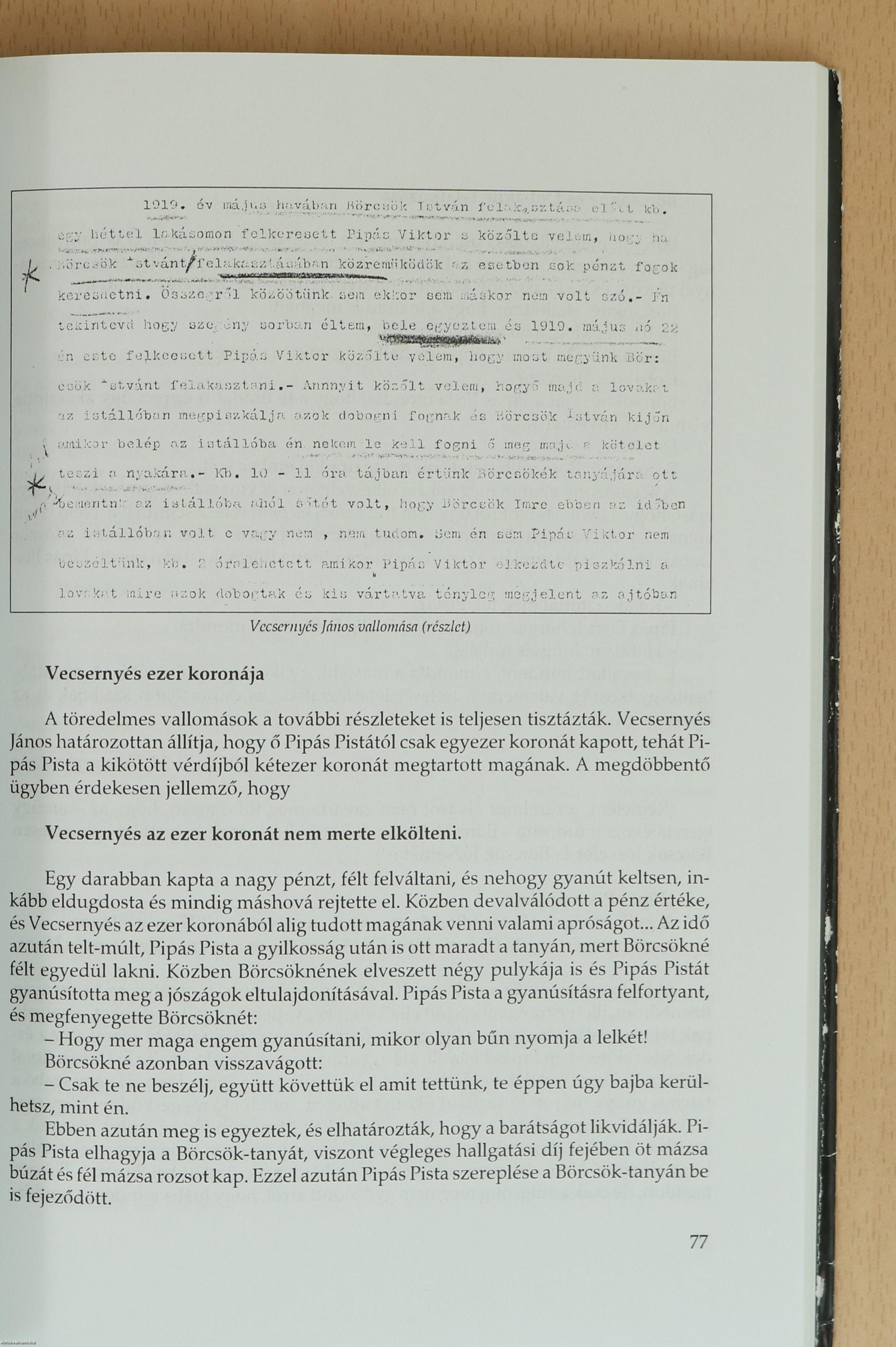 "2004, január harmincegyedikét írjuk. Hosszú szünet után végre úgy éreztem, elég erőt gyűjtöttem, hogy belevágjak ennek a hihetetlen és félelmetes históriának - Pipás Pista históriájának - leírásába, bár a história szó itt talán a valóság megszépítése. Inkább így pontos: Pipás Pista bűnös vagy szerencsétlen (ki-ki döntsön végül lelkiismerete szerint) életének, avagy: a magyar büntetőperek talán egyik leghirhedettebb fejezetének megírásába. Pipás Pista története búvópatakként kísértett eddigi életem során. Hol előbukkant rövid időre, hol meg eltűnt évek hosszú sorára, a feledés jótékony homályába burkolózva. Gyermekként hallottam róla először nevelőapámról, ki egykoron Horthy rendőre volt rövid ideig. Néha, sötét és hosszú téli estéken, egy üveg karcos Kövidinkától átszellemülten, a pirosló vaskályha duruzsolása mellett mesélte a családnak (általában nekem és testvéreimnek) fojtott, sejtelmes hangon ezt az akkor mindannyiunkat jeges borzongással eltöltő históriát."