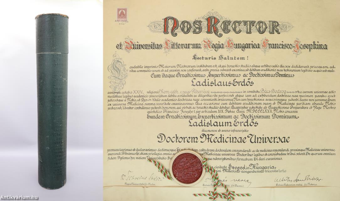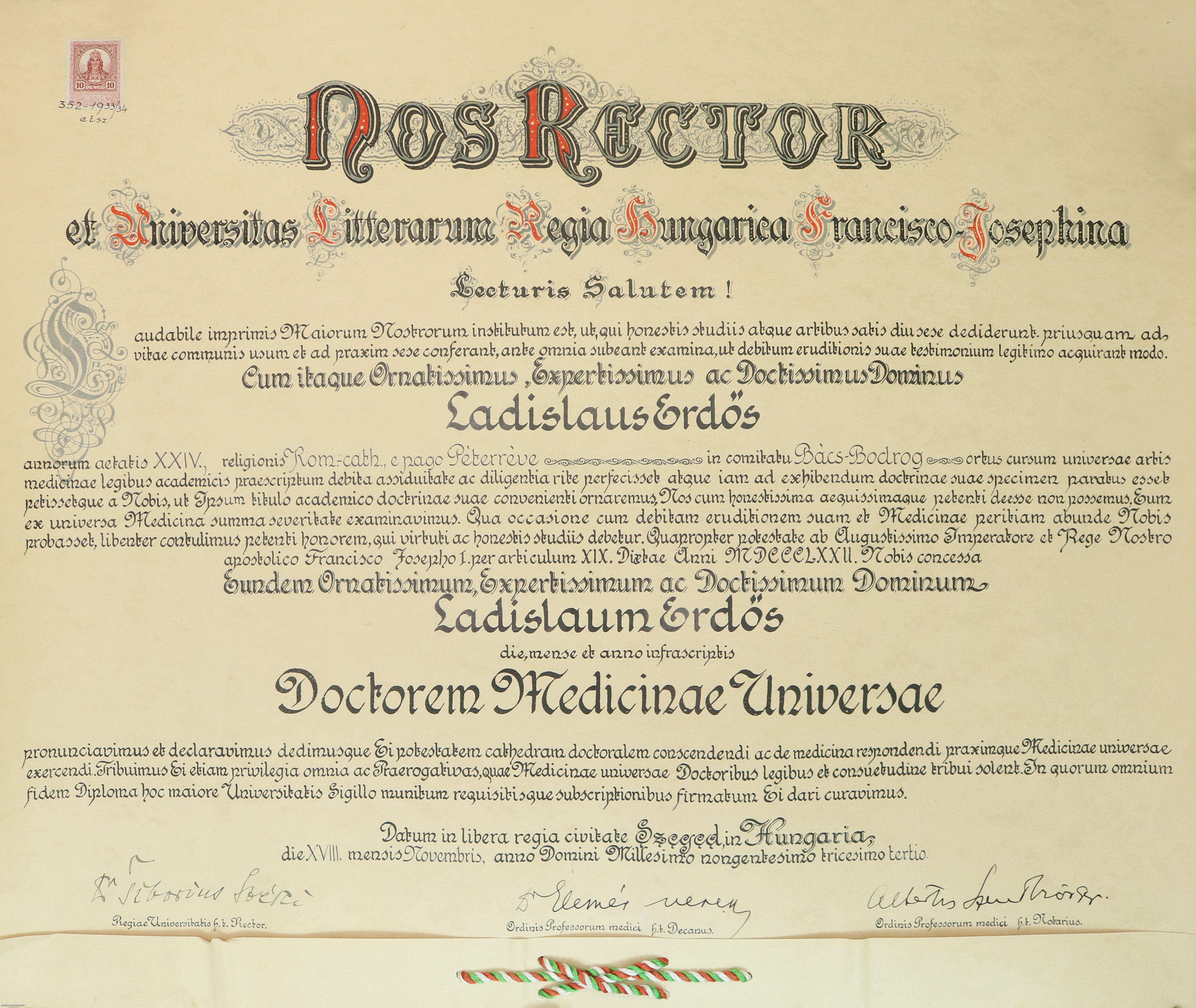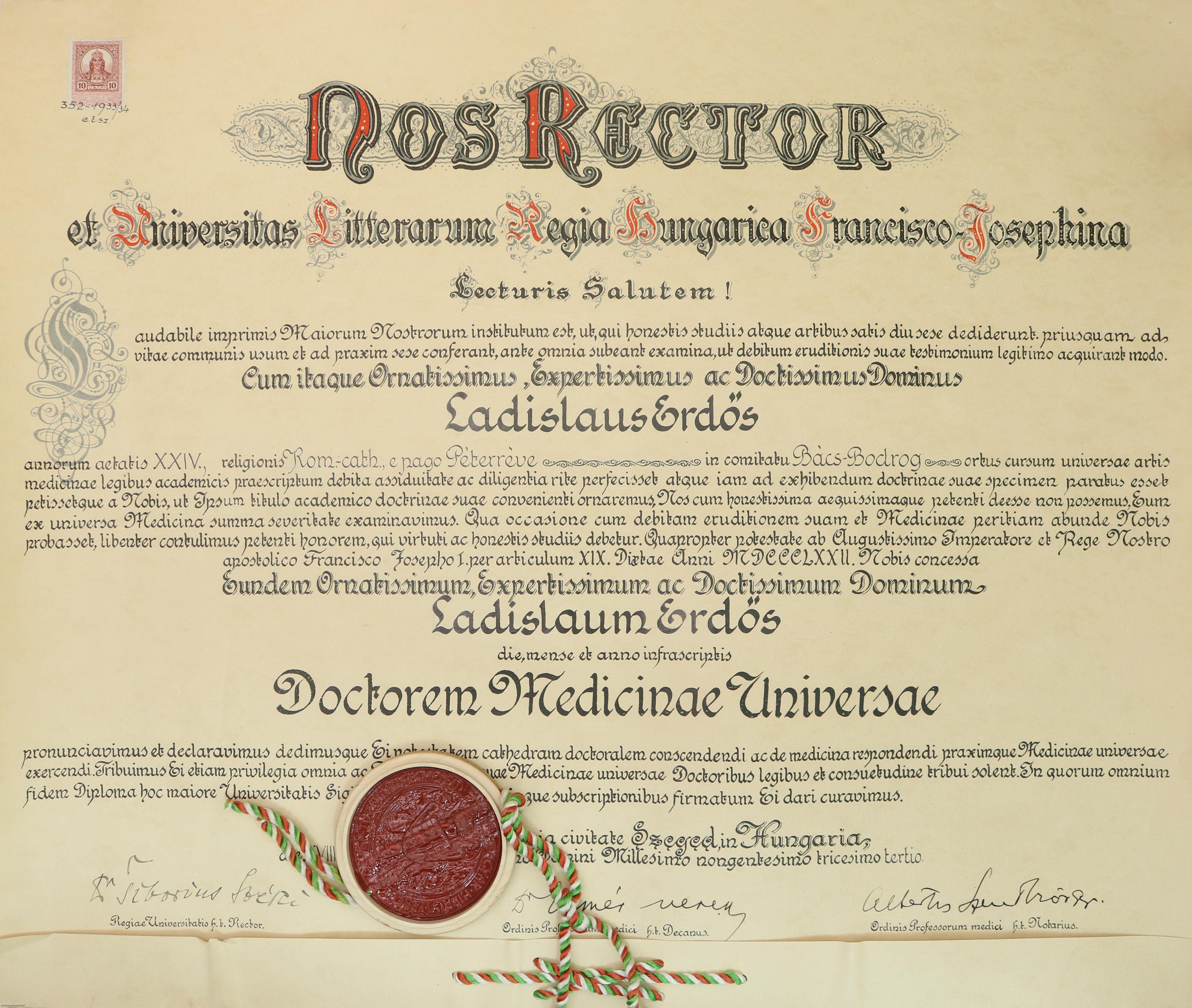 Az orvosi végzettséget igazoló kinevezést Erdős László [Ladislaus Erdős], a Magyar Kir. Ferenc József Tudományegyetem [a mai Szegedi Tudományegyetem] 24 éves orvostanhallgatója kapta. Az oklevél ünnepélyes formulában fejezi ki a végzett hallgató orvosi doktori címszerzését [Doctorem Medicinae Universae], valamint felhatalmazást arra vonatkozólag, hogy a végzett a továbbiakban doktori széket elfoglaljon, az orvostudományi kérdésekben megnyilatkozhasson, és orvostudományi gyakorlatokat végezzen.