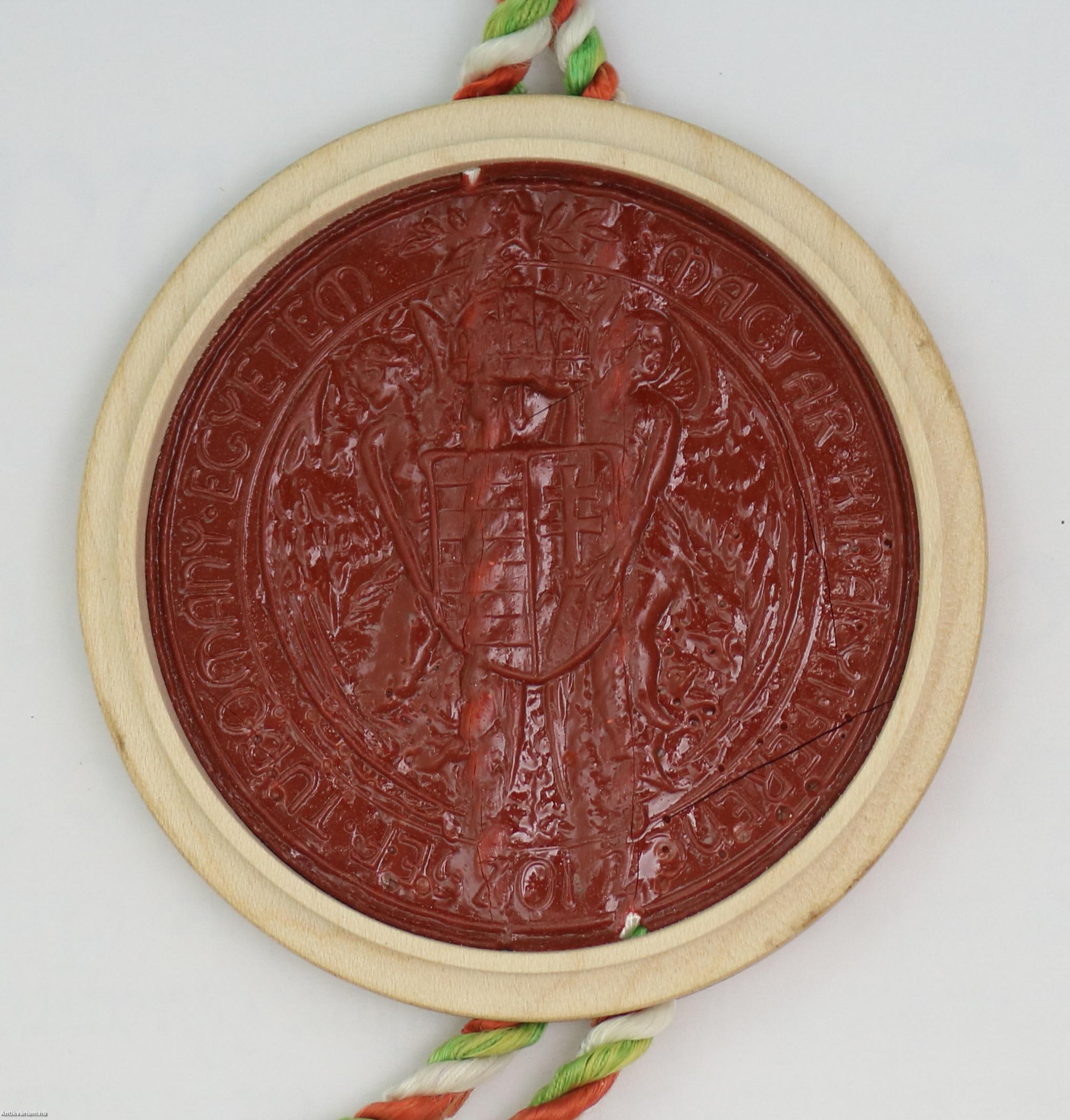nemzetiszín zsinórral felfüggesztett, esztergált fatokban helyet kapó függőpecsét, melynek vörös pecsétviaszában a szegedi Magyar Kir. Ferenc József Tudományegyetem címer látható.