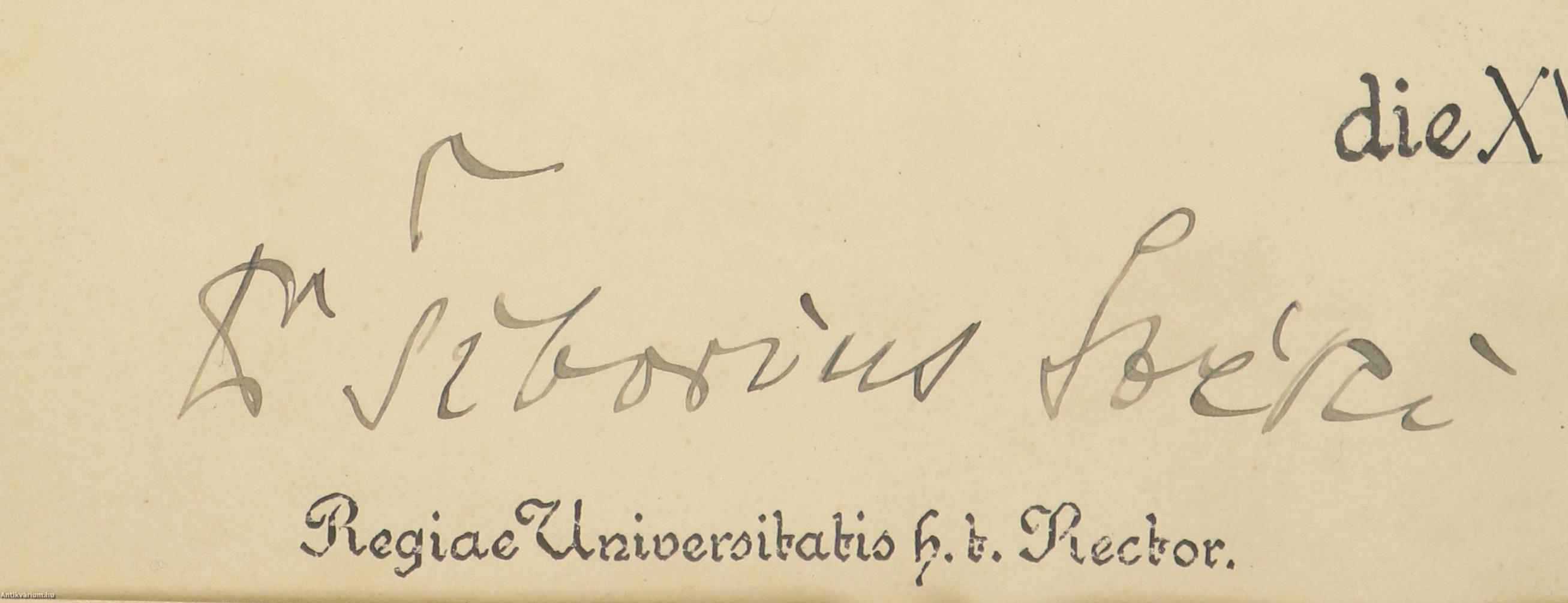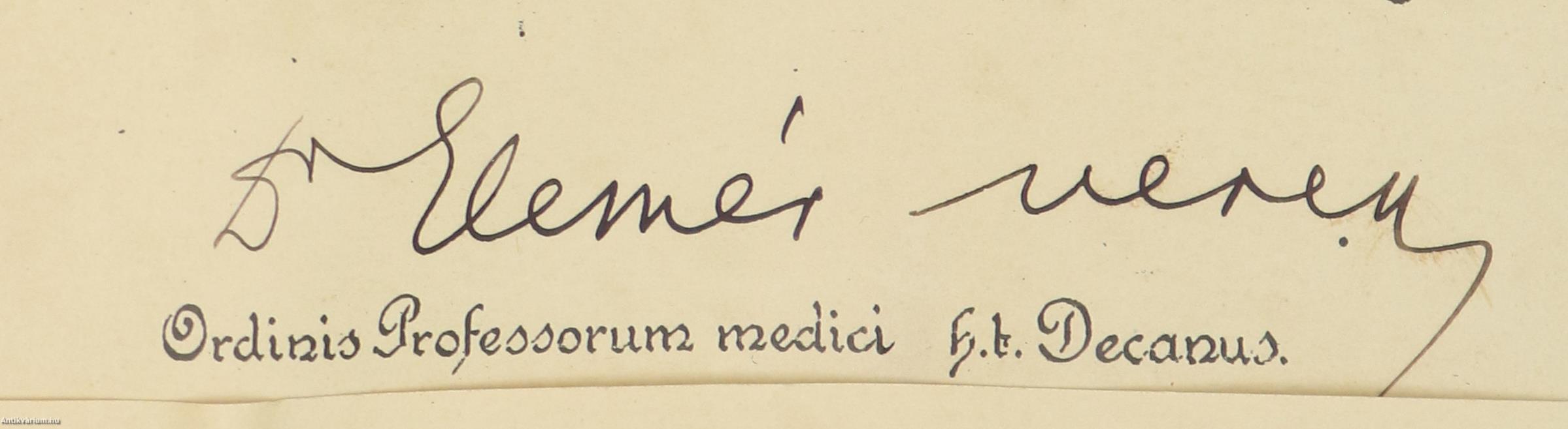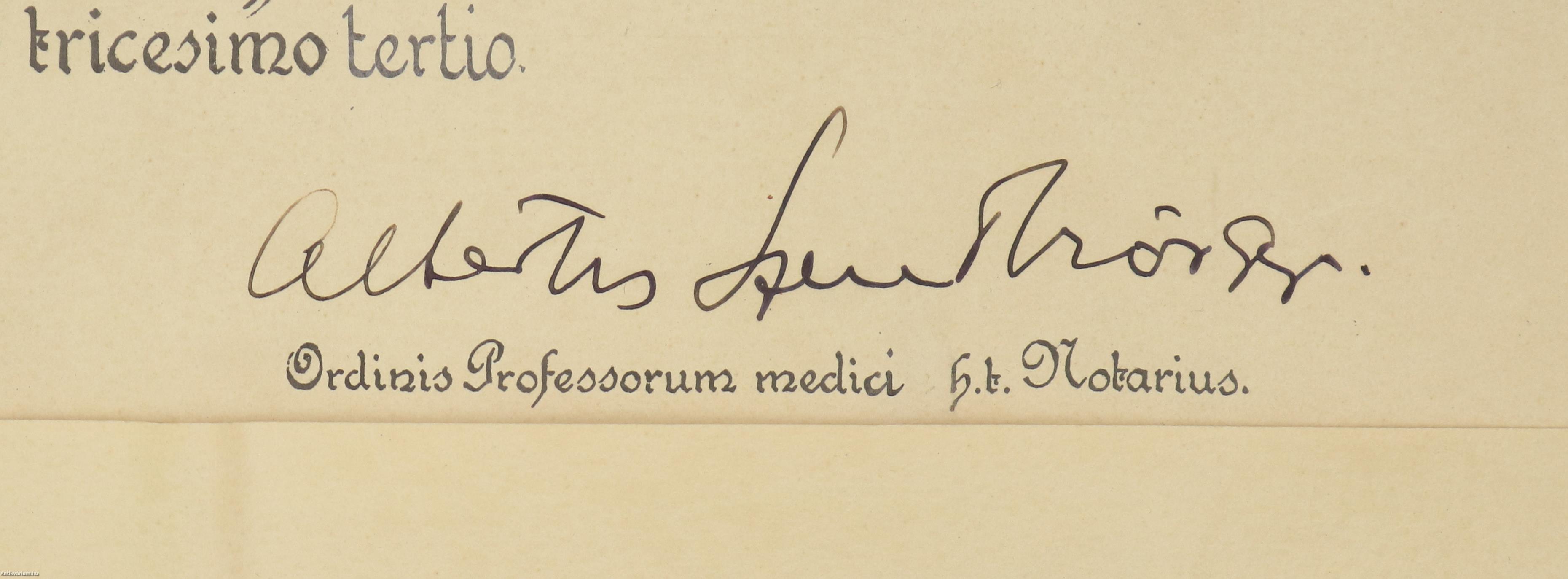 Dr. Széki Tibor a szegedi Ferenc József Tudományegyetem rektora, Dr. Veress Elemér az orvostudományi kar dékánja, valamint Szent-Györgyi Albert az orvostudományi kar jegyzője által aláírt példány.Nos Rector et Universitas Litterarum Regia Hungarica Francisco-Josephina - Latin nyelvű orvosi diploma, 1933.