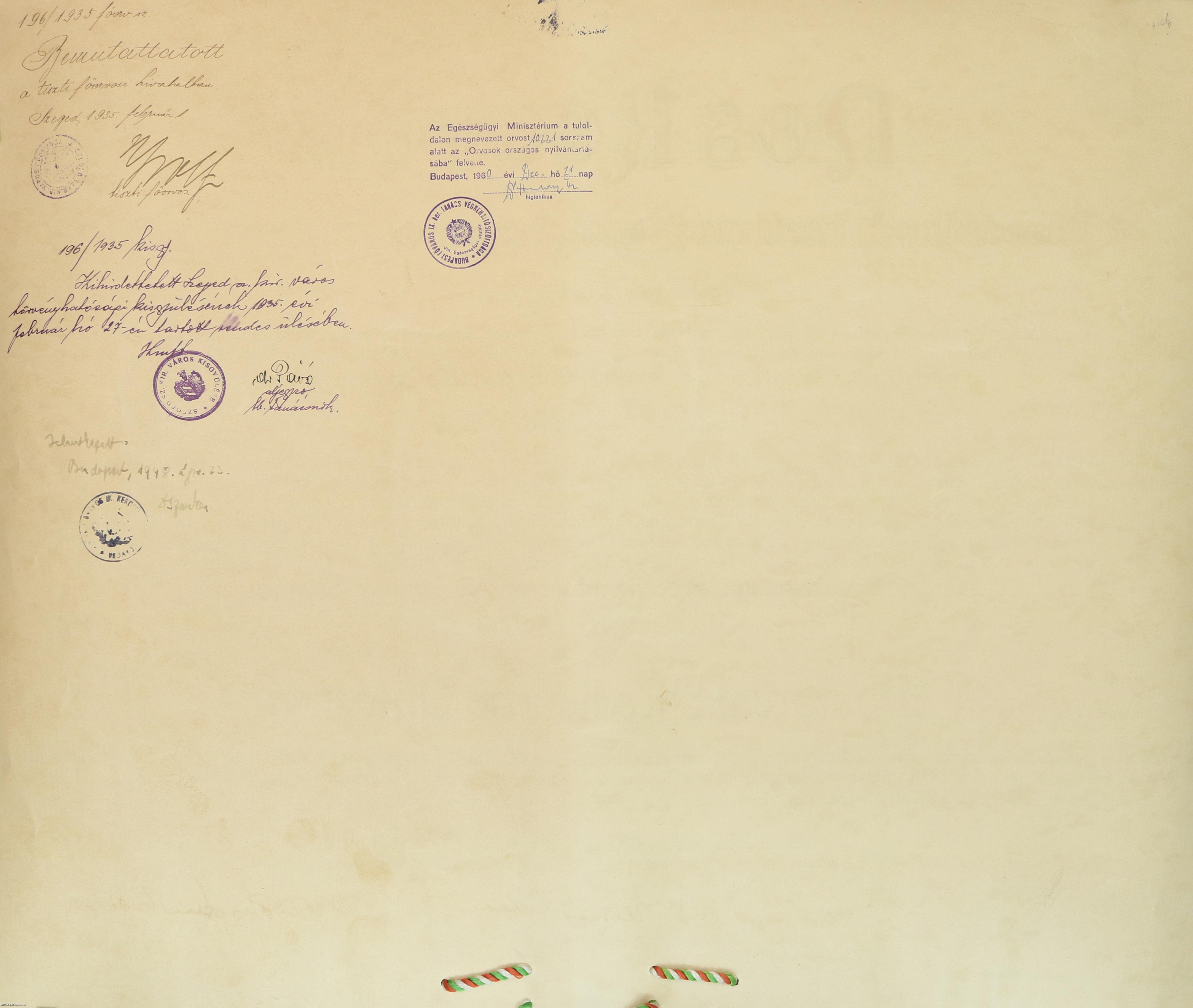 1933. november 18-i keltezésű, Szegeden kiállított, latin nyelvű orvosi diploma. A pergamenre nyomott, díszes, iniciálékkal és díszítő motívumokkal ékesített okiratot kézzel írt szövegrészek egészítik ki. A dokumentum a bal felső részén tartalmaz egy felragasztott, korabeli, 10 pengős illetékbélyeget, továbbá az okirathoz az alsó szélén csatlakozik egy