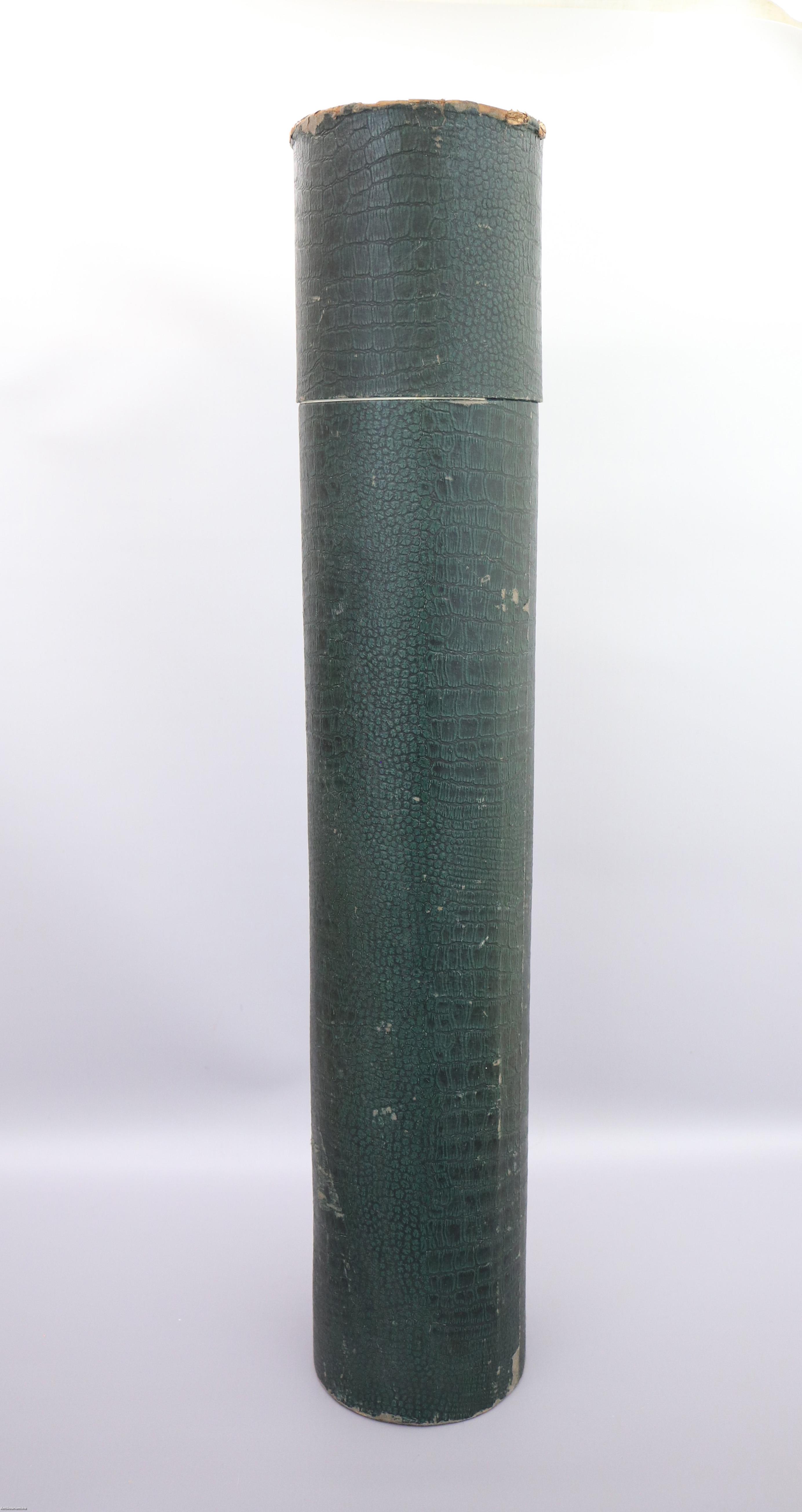 Hiánytalan, feltekert pergamen dokumentum, a hátlapon tollal írt feljegyzésekkel és bélyegzésekkel, eredeti, henger formájú, korabeli papír védődobozban.