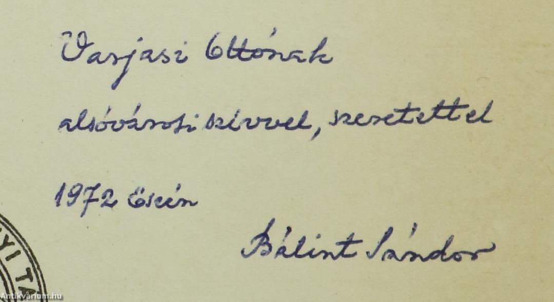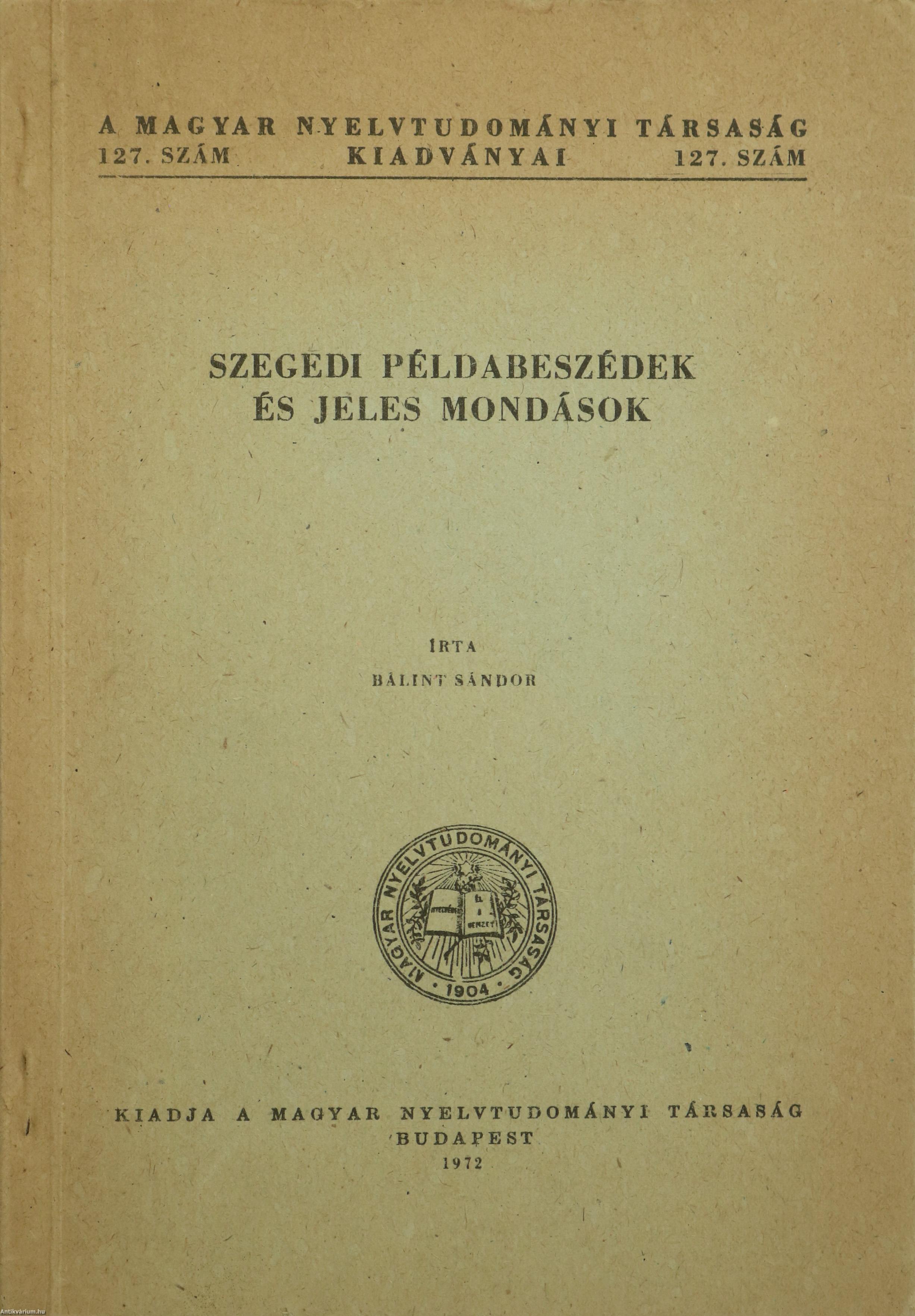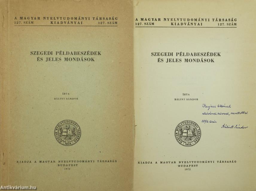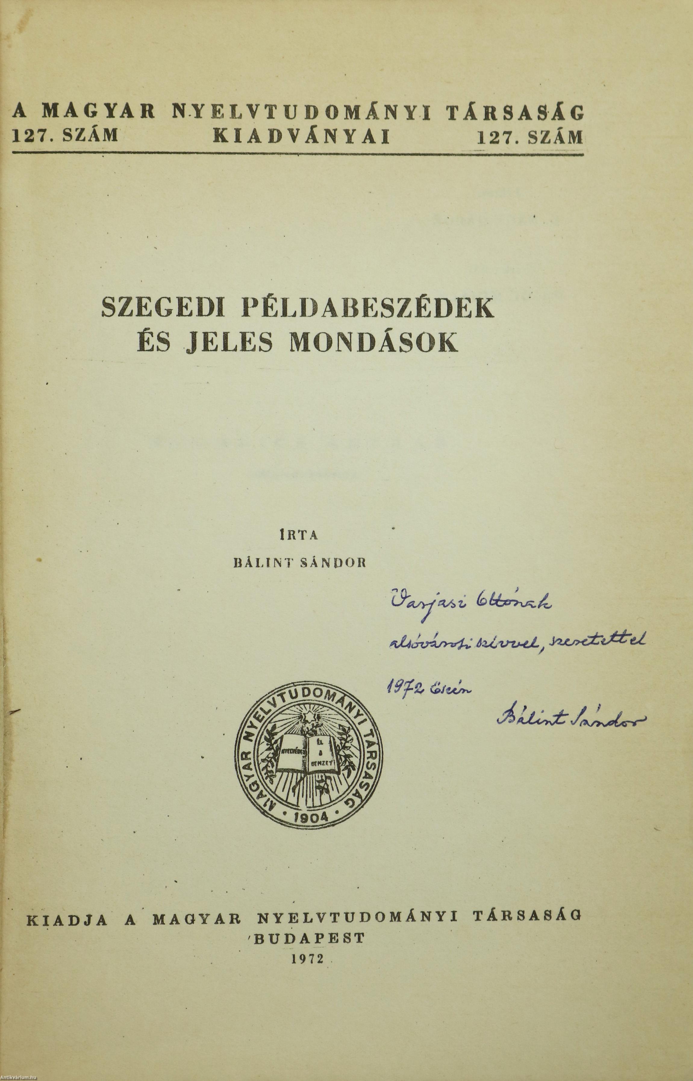 Szerző által dedikált példány. Első kiadás. A Magyar Nyelvtudományi Társaság kiadványai. No.: 127. szám. Szegedi példabeszédek és jeles mondások. Írta: Bálint Sándor. Szerkesztő: Hajdú Mihály. A címlapon a szerző, Bálint Sándor tollal beírt, névre szóló dedikációja olvasható: "V. O.-nak alsóvárosi szívvel, szeretettel 1972 őszén Bálint Sándor". Irodalom- és tartalomjegyzékkel kiegészített kötet. Készült a Könnyűipari Gépi Adatfeldolgozó Vállalat Sokszorosító részlegében. Kiadói tűzött papírkötésben lévő példány feliratozott címfedéllel, feliratozatlan könyvgerinccel és hátlappal, tiszta belívekkel, hiánytalan, jó állapotban. A kötet szerzője, Bálint Sándor (Szeged, 1904. augusztus 1. – Budapest, 1980. május 10.) magyar néprajzkutató, művészettörténész. A 20. századi magyar vallásos néprajz és folklorisztika egyik legnagyobb alakja. Rövid ideig nemzetgyűlési képviselő is volt. Fő kutatási területei: az Alföld néprajza, a vallási néphagyományok, Szeged néprajza.