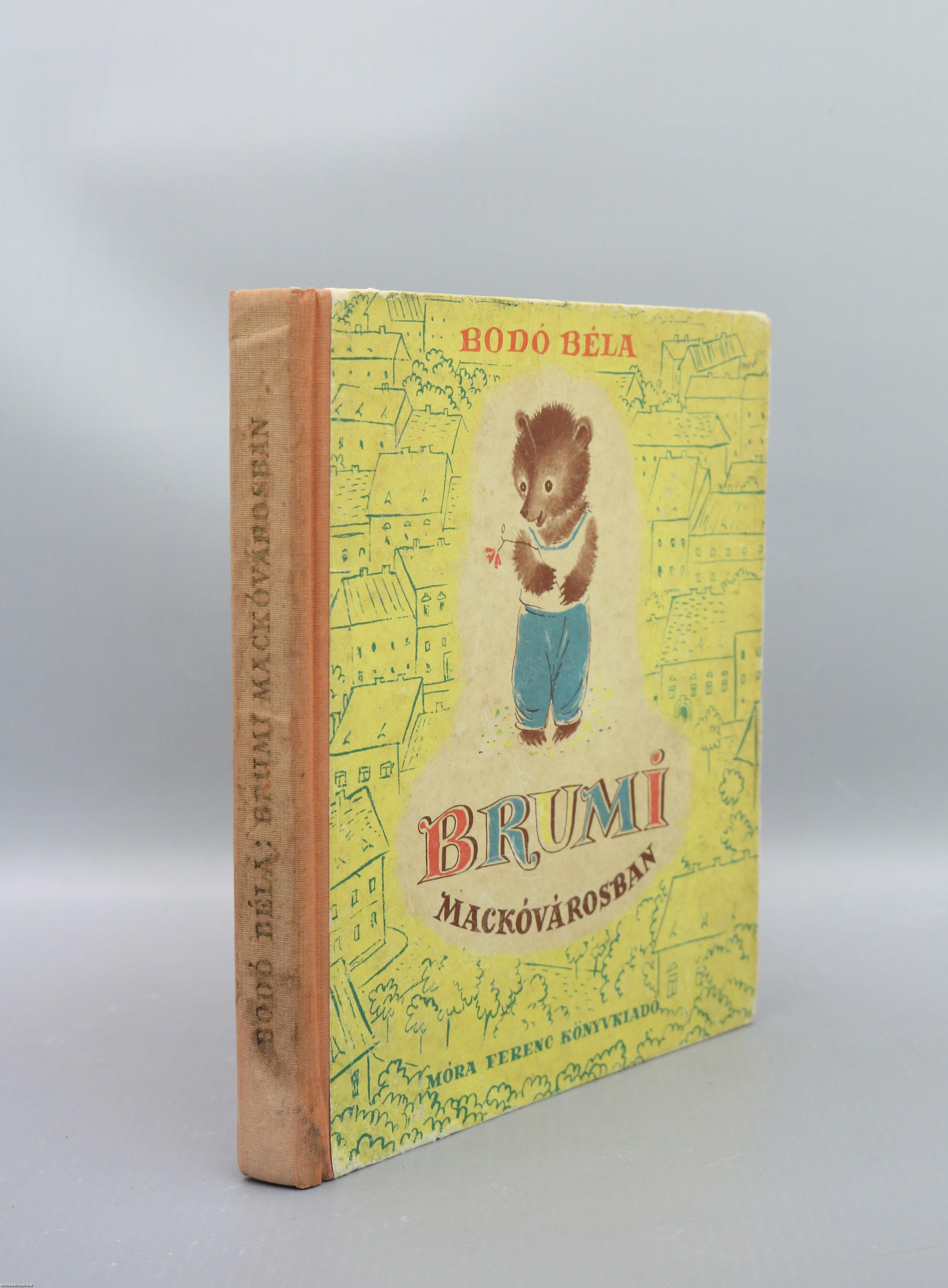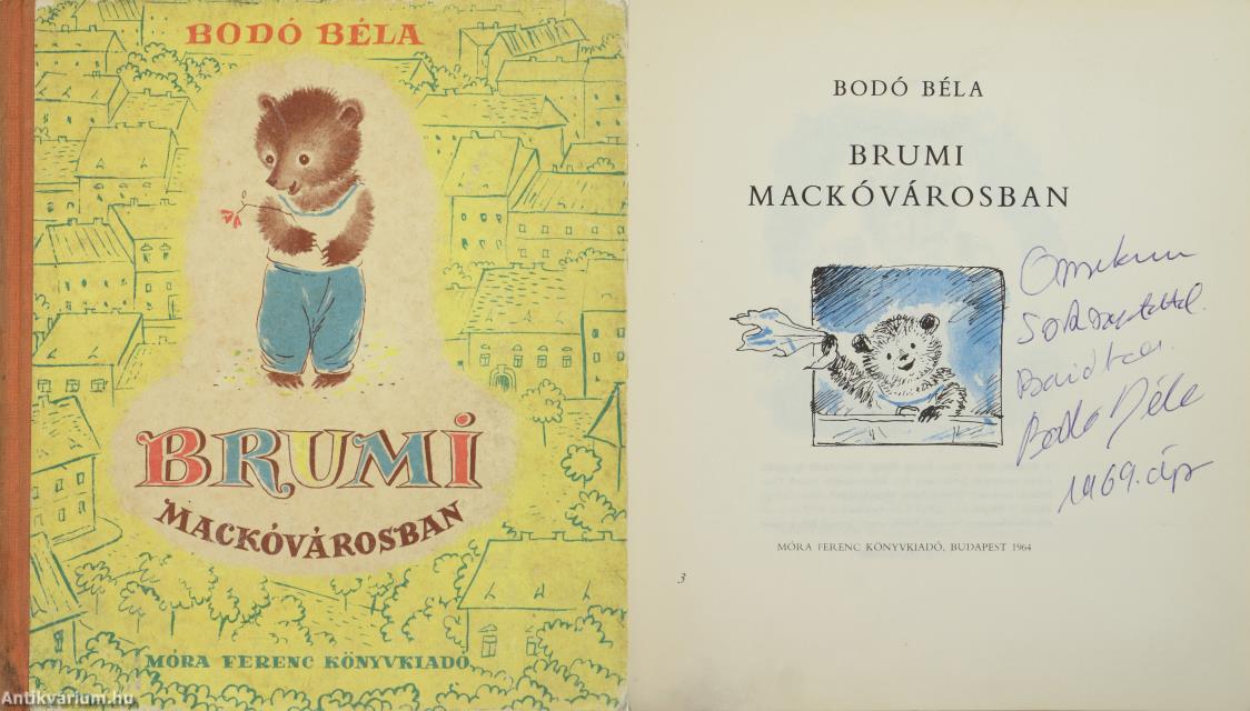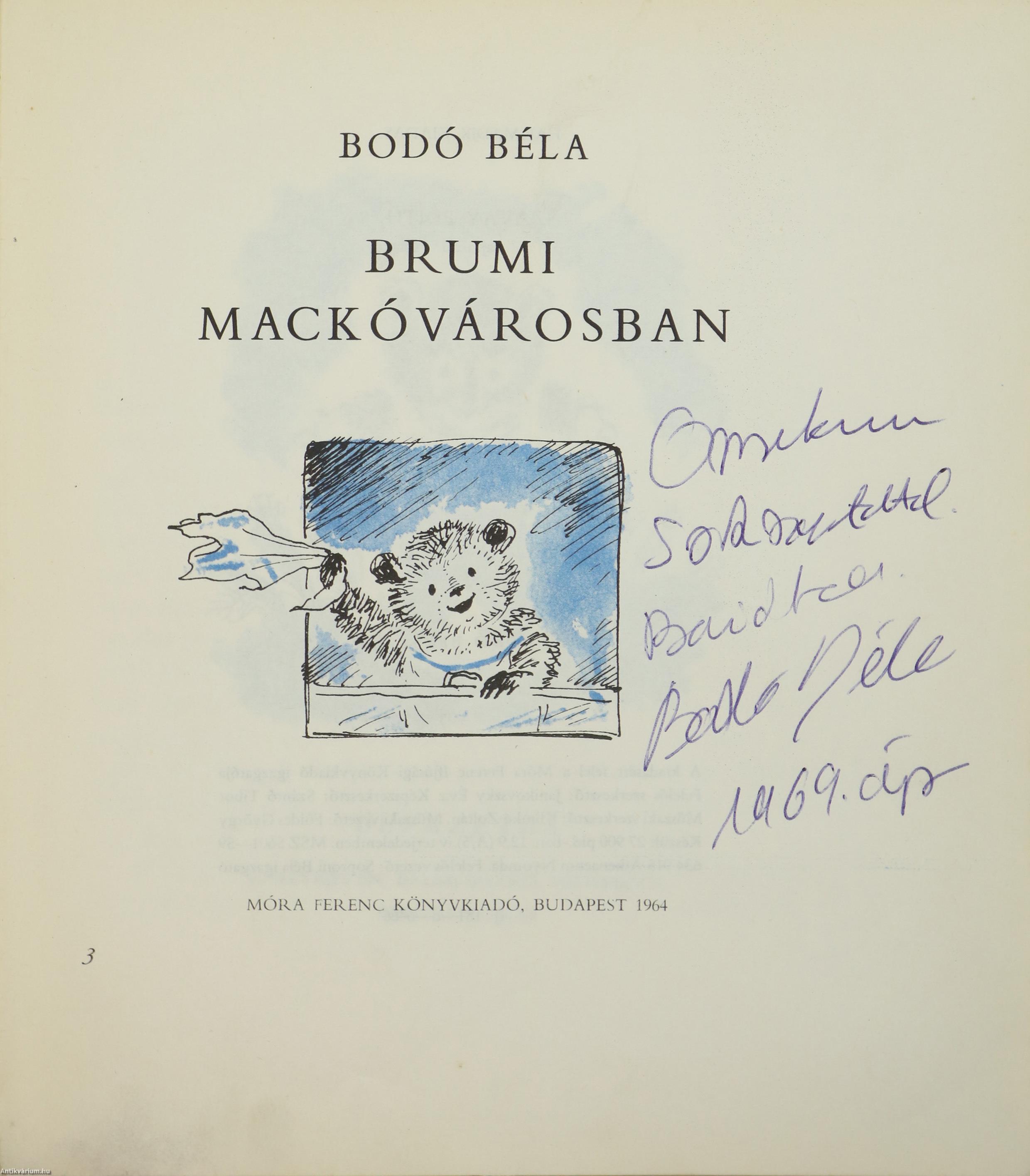 Szerző által dedikált példány. Brumi Mackóvárosban. Írta: Bodó Béla. A címlapon a szerző, Bodó Béla tollal beírt dedikációja olvasható: "O. sok szeretettel ... Bodó Béla. 1969. ápr." Harmadik kiadás. Szávay Edith szöveg közti, egy színnel színezett rajzaival illusztrált kötet. Nyomtatta az Athenaeum Nyomda. Kiadói félvászon kötésben lévő példány feliratozott, színes illusztrációval ellátott címfedéllel, aranyozott feliratozású könyvgerinccel, illusztrált hátlappal, hátlap felől nedvességtől foltos előzéklappal, hiánytalan állapotban. "Brumi kedves mackó-alakja volt a hatvanas évek magyar mesebirodalmának. És Brumi amire képes volt, azt meg is tette, ezzel örökre belopta magát a gyermeklélek rózsaszín világába" - fogalmazott a kötetről Lázár Ervin. A kötet szerzője, Bodó Béla (1903-1970) újságíró, író, a népszerű Brumi-könyvek szerzője. 1926-ban a Pesti Naplónál kezdte pályáját, majd 1945-től a Szabad Nép és a Népbírósági Közlöny munkatársa, 1950-től pedig a Népszava nyomdai szerkesztője volt. 1953-ban több hónapra bebörtönözték, amiért a Sztálin súlyos betegségéről szóló cikk szövegében a „mélységes megrendülést”-t véletlenül „mélységes megrendelés”-nek szedte. Később a Nők Lapjánál és az Esti Hírlapnál dolgozott.