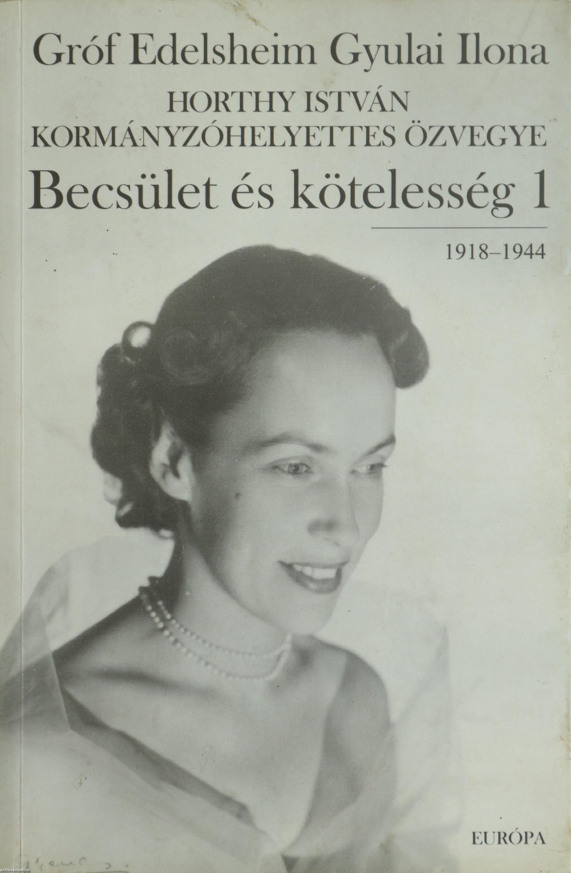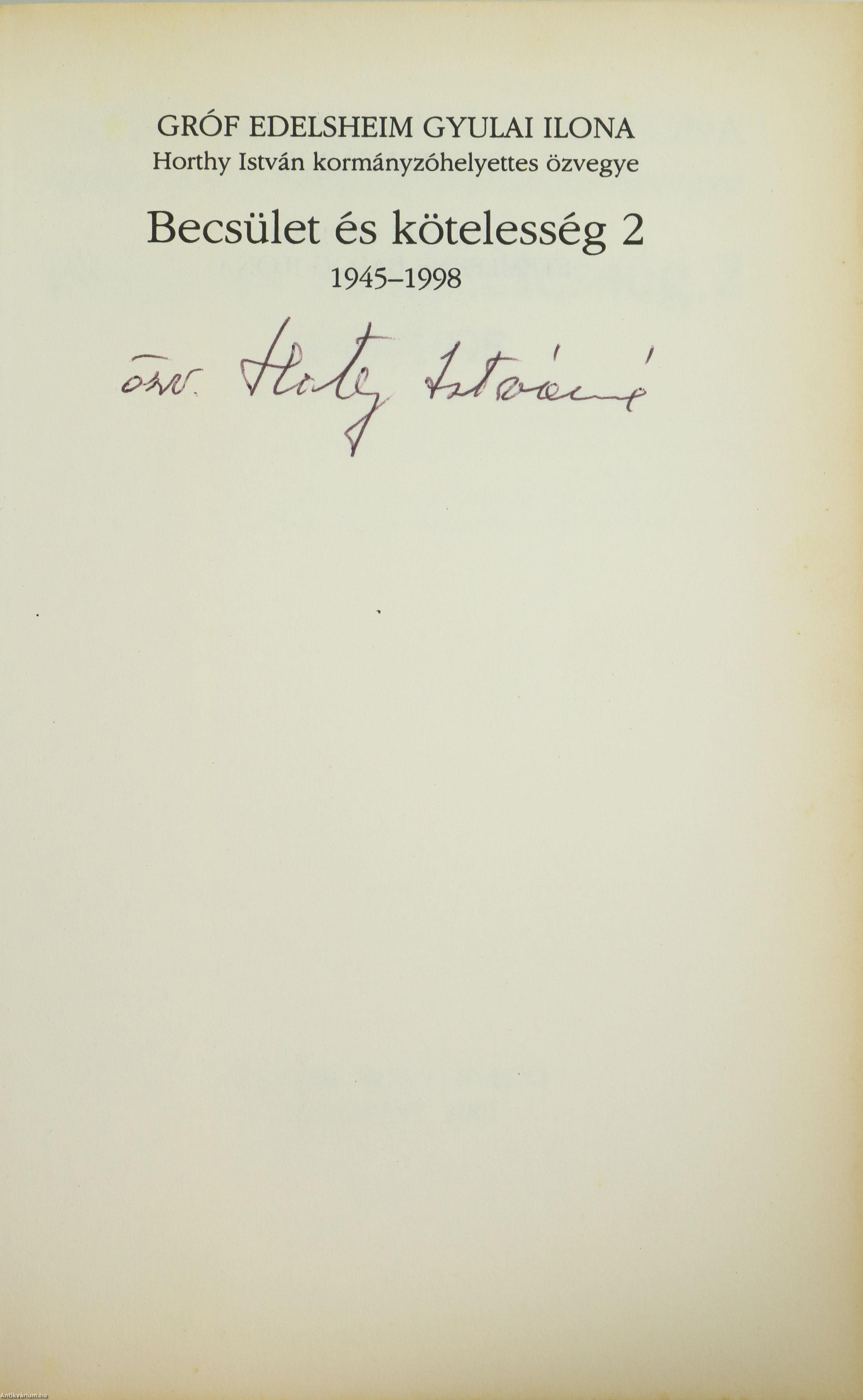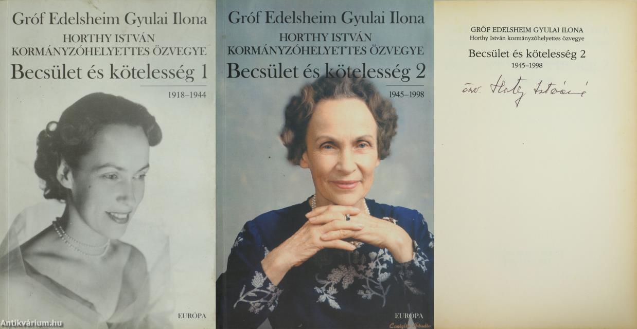 Szerző által aláírt példányok. Becsület és kötelesség 1-2. 1918-1944. – 1945-1998. (Egységes külön kötetekben.) Írta: gróf Edelsheim Gyulai Ilona (Horthy István kormányzóhelyettes özvegye). Szerkesztette: Ocsovai Gábor. A második kötet előlapján a szerző, gróf Edelsheim Gyulai Ilona tollal beírt, jól olvasható aláírása látható. A képeket válogatta: Stemlerné Balog Ilona. A kötetet tervezte: Kállay Judit. Az angol nyelvű részeket fordította: Gaál Csaba és Magyarics Tamás. Számos fekete-fehér, feliratos fényképpel illusztrált, valamint névmutatóval és tartalomjegyzékkel ellátott kötetek. A könyveket az Alföldi Nyomda Rt. nyomtatta Debrecenben. Kiadói ragasztott papírkötésben lévő kötetek feliratos, a szerző fekete-fehér és színes fotójával illusztrált címfedéllel, feliratos könyvgerinccel, fülszöveggel, tiszta belívekkel, hiánytalan, jó állapotban. A kötet szerzője, gróf marosnémethi és nádaskai Edelsheim-Gyulai Ilona Mária Andrea Gabriella (Budapest, 1918. január 14. – Lewes, 2013. április 18.) Horthy István kormányzóhelyettes felesége, a második világháborúban önkéntes ápolónő. Gróf Edelsheim-Gyulai Lipót és verőczei gróf Pejacsevich Gabriella harmadik lányaként született. Gyermekkorát családja felvidéki birtokán, az akkor már Csehszlovákiához tartozó Felsőelefánton töltötte. 1940. február 1-jén ismerkedett meg jövendőbeli férjével, majd 1940. április 27-én feleségül ment vitéz nagybányai Horthy Istvánhoz, Horthy Miklós kormányzó fiához, aki 1942. augusztus 20-án repülőszerencsétlenségben életét vesztette. Szerteágazó közéleti, majd megözvegyülése után reprezentatív szerepet játszott. A II. világháború során vöröskeresztes nővérként dolgozott. Szerepet vállalt a zsidók megmentésében: ő juttatta el Horthy Miklóshoz az Auschwitz-jegyzőkönyvet, amiből világossá vált, hogy a magyarországi zsidókat nem munkaszolgálatra, hanem koncentrációs táborokba viszik. A jegyzőkönyv hatására szüntette be a deportálásokat a kormányzó. Követte a kormányzót a német fogságba, az amerikai hadifogságba, majd a portugáliai emigrációba is, ahol a volt kormányzó levelezését intézte. Emlékiratai "Becsület és kötelesség" címen jelentek meg. A rendszerváltozást követően többször járt Magyarországon, ahol Horthy Miklós végakaratának megfelelően intézte a kormányzó és felesége kenderesi újratemetését. 2013. április 18-án hunyt el angliai otthonában. Földi maradványait 2013. május 2-án a Horthy család mauzóleumában, a kenderesi temetőben helyezték örök nyugalomra.
