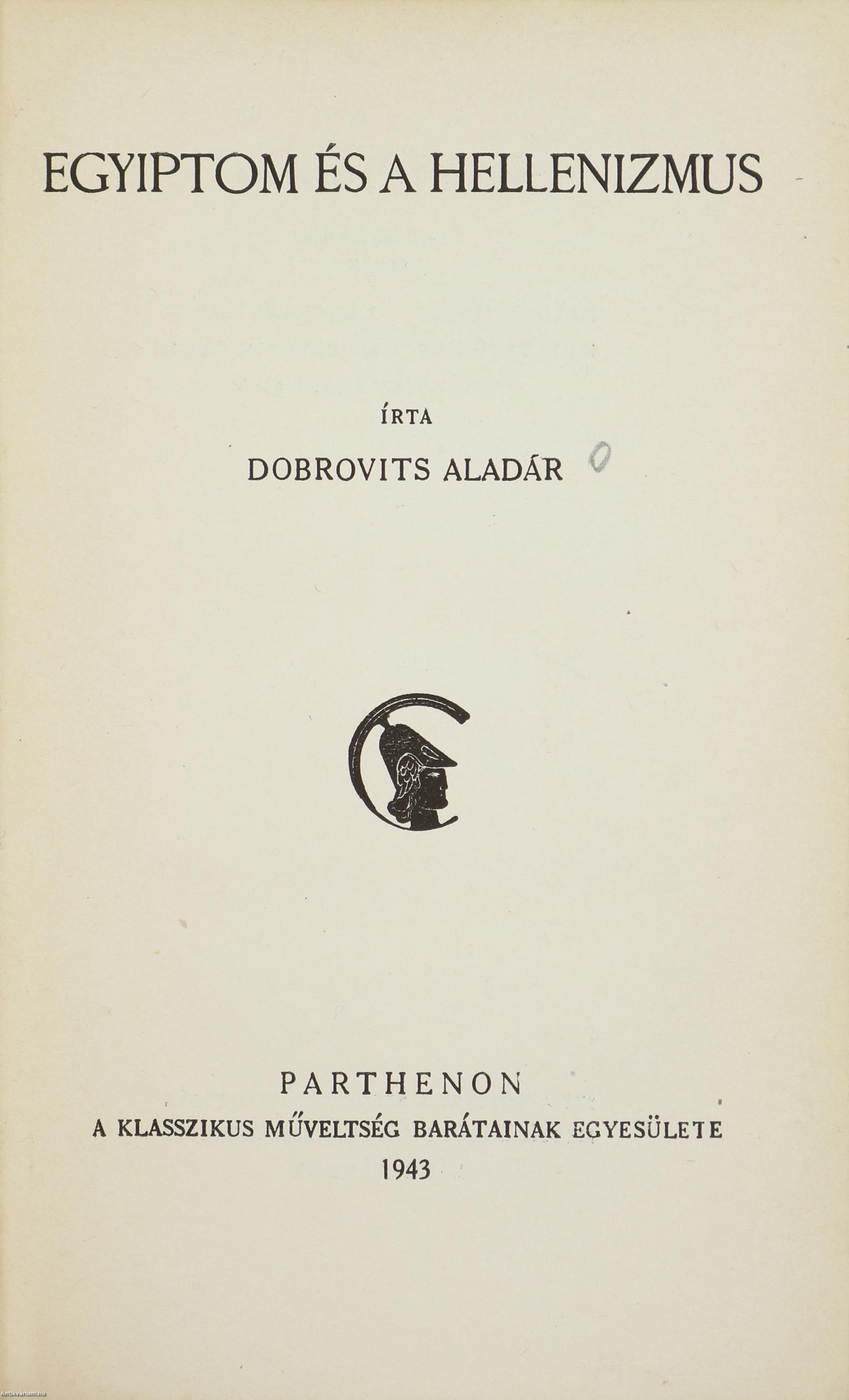 Szerző által dedikált példány. Parthenon-tanulmányok. No.: 9. sz. Az előlapon a szerző, Dobrovits Aladár tollal beírt, névre szóló dedikációja olvasható: "Dr. K. I. úrnak tisztelettel Dobrovits Aladár". Egyiptom és a hellenizmus. Írta: Dobrovits Aladár. Ezt a kötetet a szerkesztőbizottság megbízásából bírálta és szerkesztette: Láng Nándor. Három szöveg közti, fekete-fehér képtáblával (ebből kettő kétoldalas) illusztrált, valamint irodalmi tájékoztatóval, tartalomjegyzékkel és a kiadó könyvhirdetésével kiegészített kötet. Kiadói egészvászon kötésben lévő példány feliratozatlan aranyozott díszítéssel ellátott címfedéllel, aranyozott feliratozású könyvgerinccel, több oldalon ceruzás aláhúzásokkal, jelölésekkel, hiánytalan állapotban. A szerző, Dobrovits Aladár (Budapest, 1909. október 15. – Budapest, 1970. április 3.) művészettörténész, egyiptológus, muzeológus, egyetemi tanár, az ókori Kelet kutatásának kiemelkedő képviselője. A budapesti tudományegyetemen végezte tanulmányait és az ókori keleti népek történetéből doktorált. Kezdetben a Szépművészeti Múzeumban, mint gyakornok, utána a Modern Képtárban, mint alkalmazott tevékenykedett. A második világháború alatt az ellenállási mozgalomban vett részt, majd katonaként szolgált, 1945-ben amerikai, majd francia hadifogságba került, ahonnan 1946-ban tért haza. 1949-ben kinevezték a Szépművészeti Múzeum Antik Osztályának vezetőjévé, valamint ugyan ebben az évben az Iparművészeti Múzeum főigazgatójának is megválasztották, ezt követően bekerült az MNM Elnöki Tanácsába, aminek később főtitkára lett. 1957-től a Művelődésügyi Minisztérium főosztályvezetőjeként, 1958-tól az ELTE Ókori tanszéknek tanáraként dolgozott, valamint egyik alapítója volt az Ókortudományi Társaságnak.