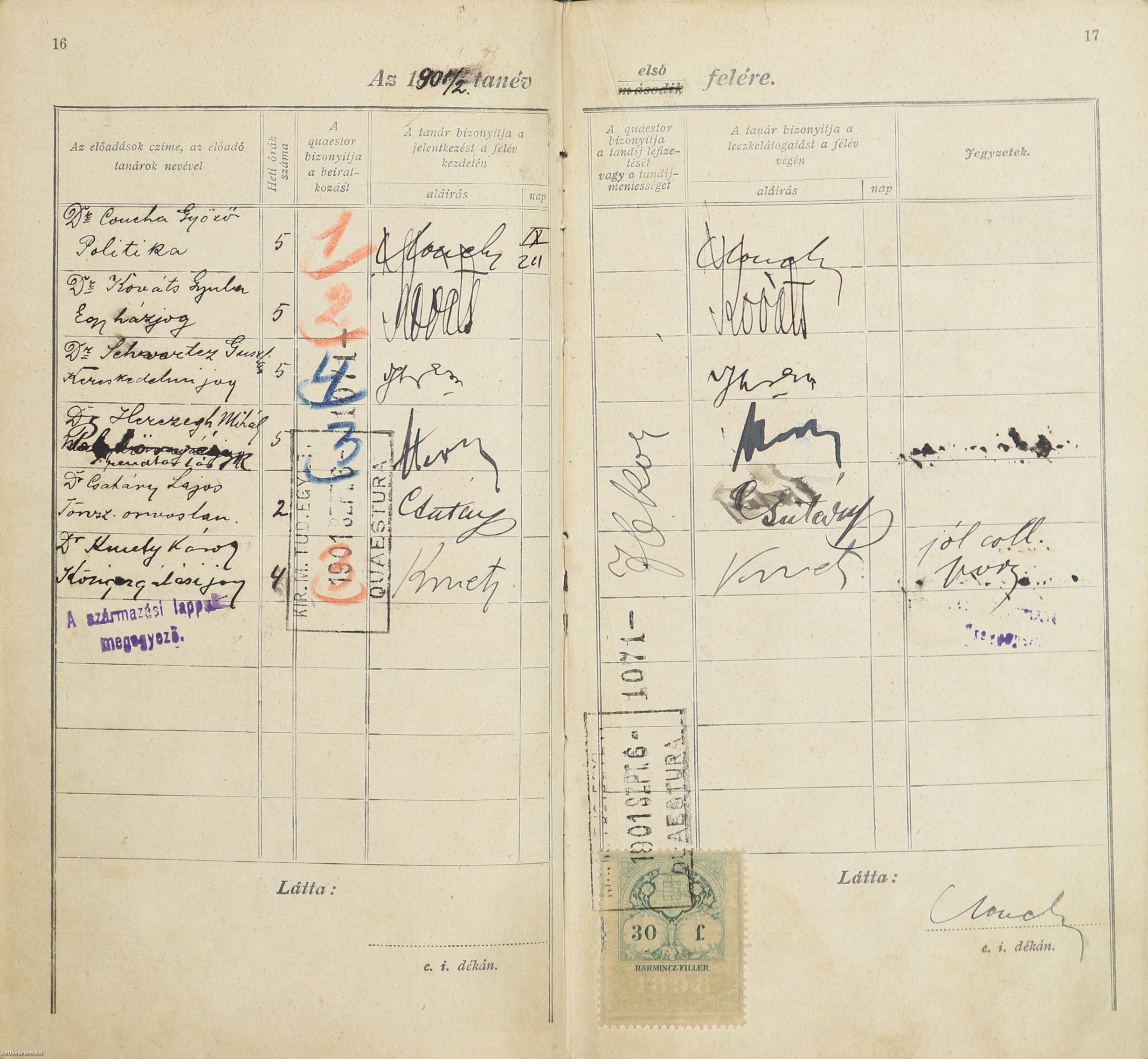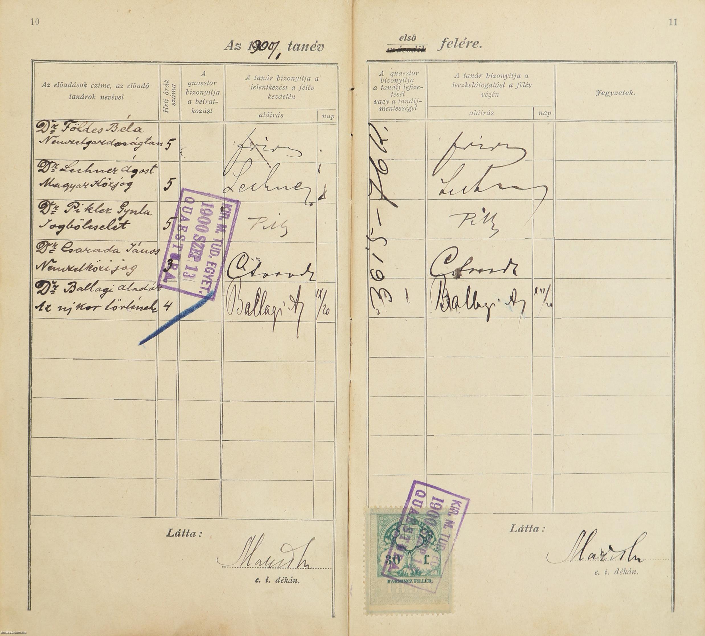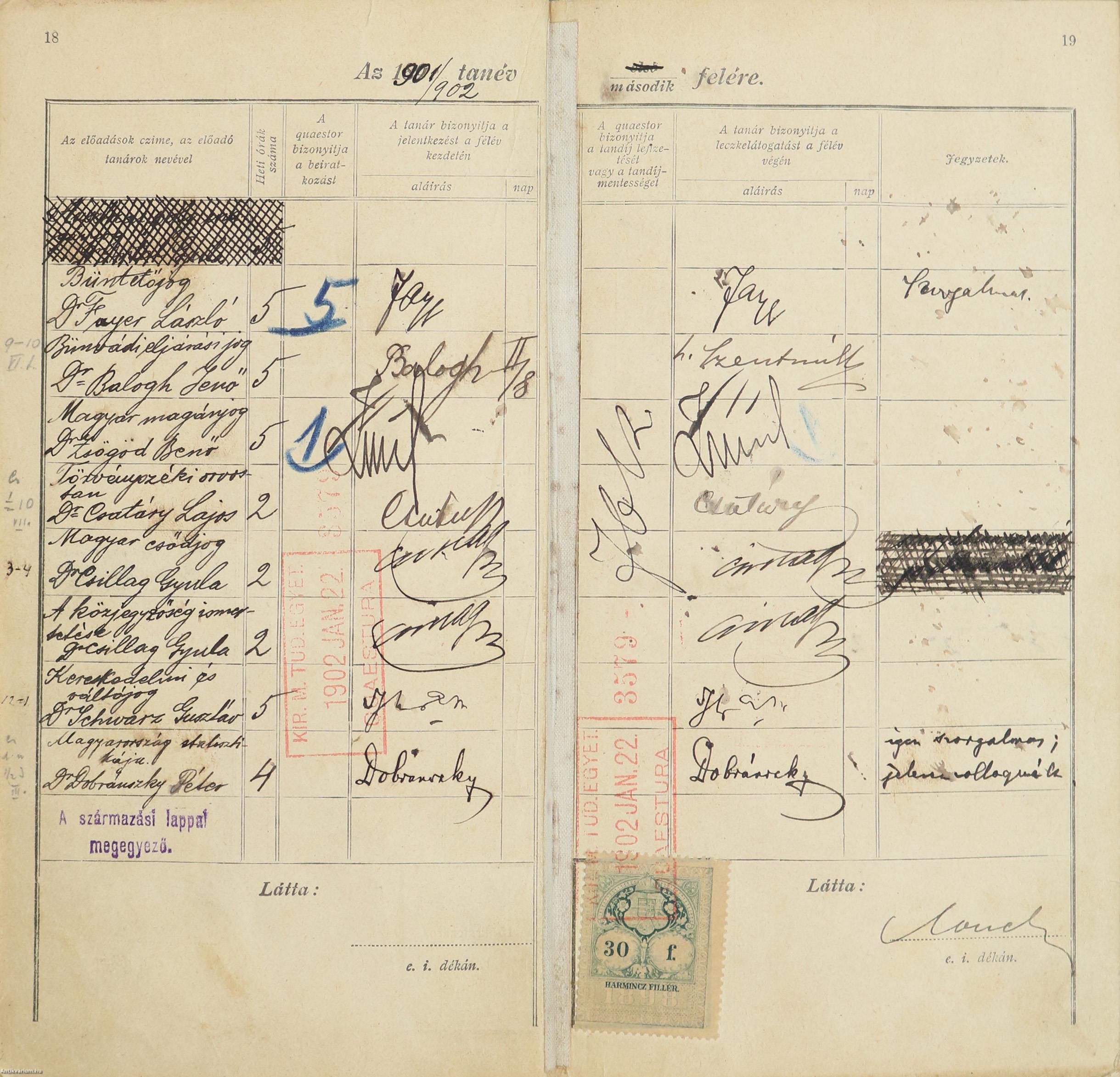 A kiadvány – tulajdonosának 1899. évi szeptember 19-iki beiktatásától az 1903. évi június 27-iki végbizonyítványáig tartó egyetemi tanulmányait dokumentálva – a Budapesti Tudományegyetem 28 tanárának és vezető tisztségviselőjének (dékán, rektor, stb.) saját kezű aláírását őrzi, köztük többekét többszörösen is: