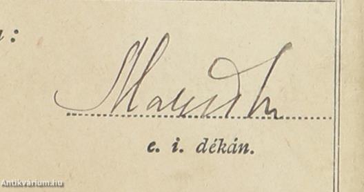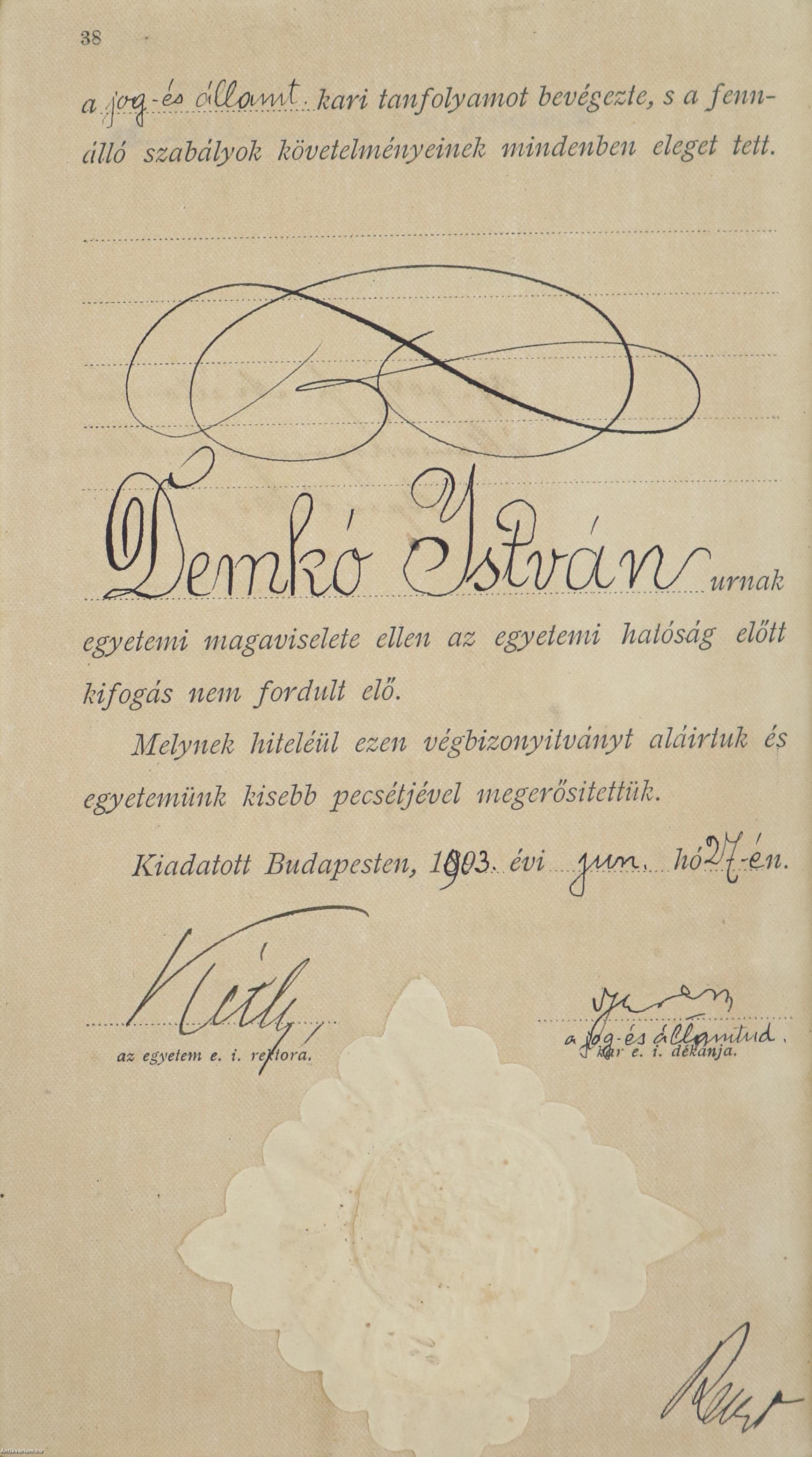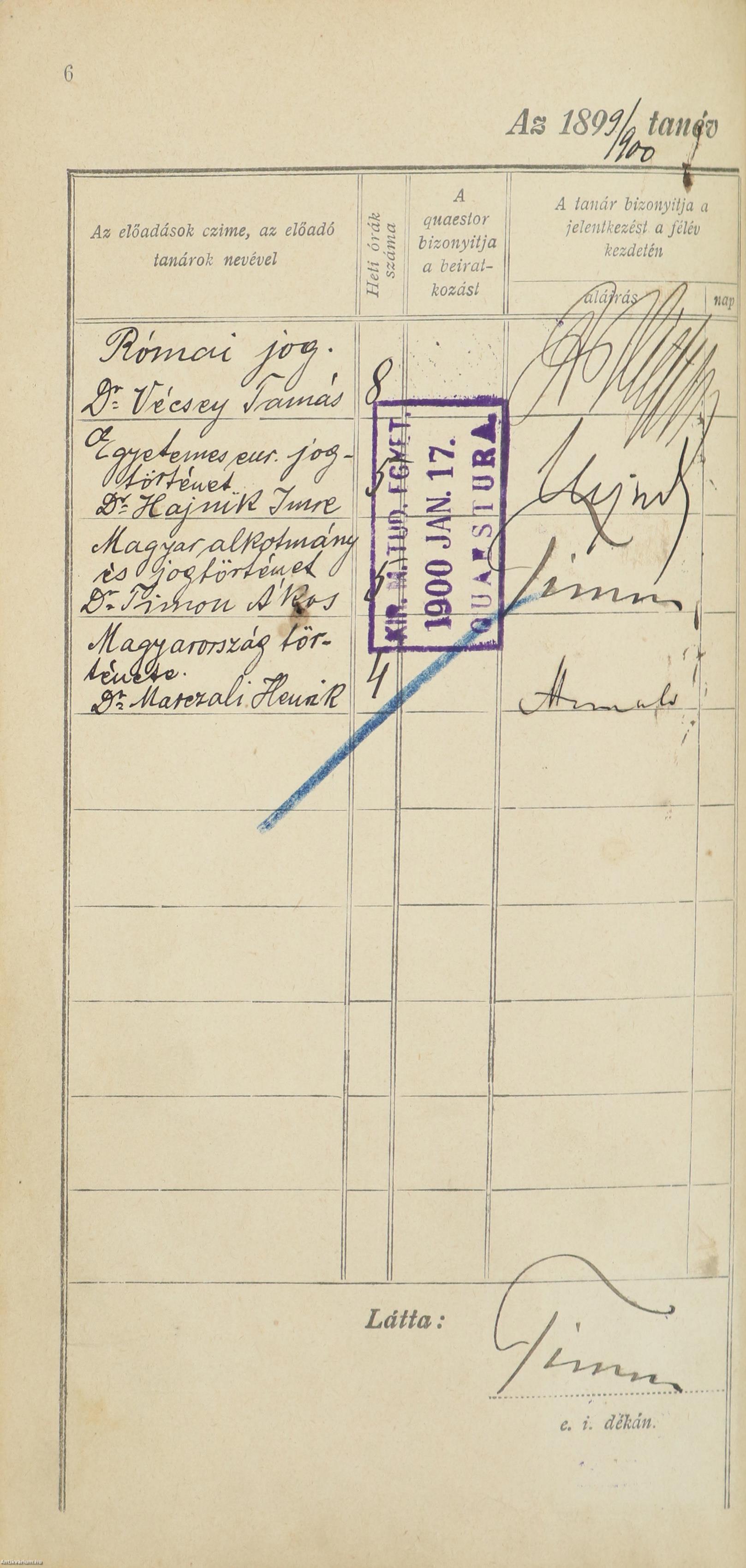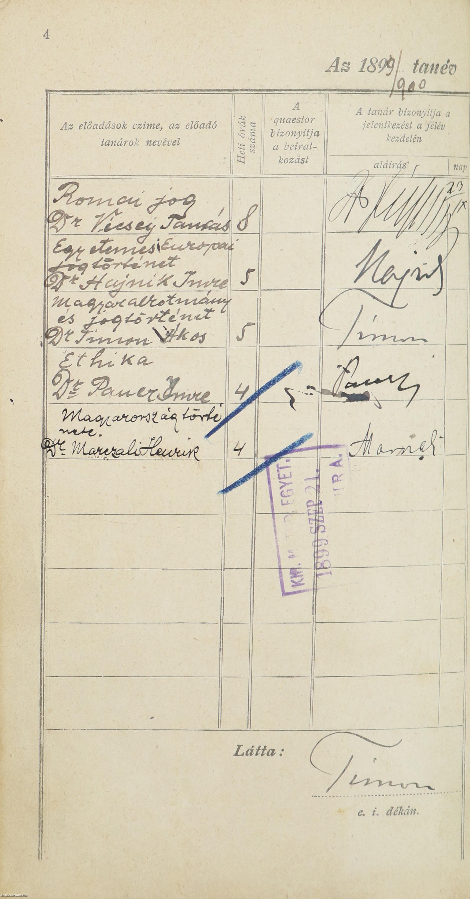 A kiadvány – tulajdonosának 1899. évi szeptember 19-iki beiktatásától az 1903. évi június 27-iki végbizonyítványáig tartó egyetemi tanulmányait dokumentálva – a Budapesti Tudományegyetem 28 tanárának és vezető tisztségviselőjének (dékán, rektor, stb.) saját kezű aláírását őrzi, köztük többekét többszörösen is: