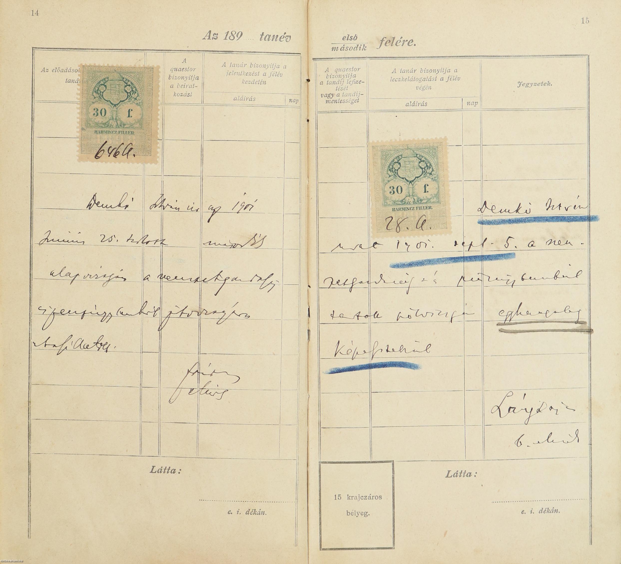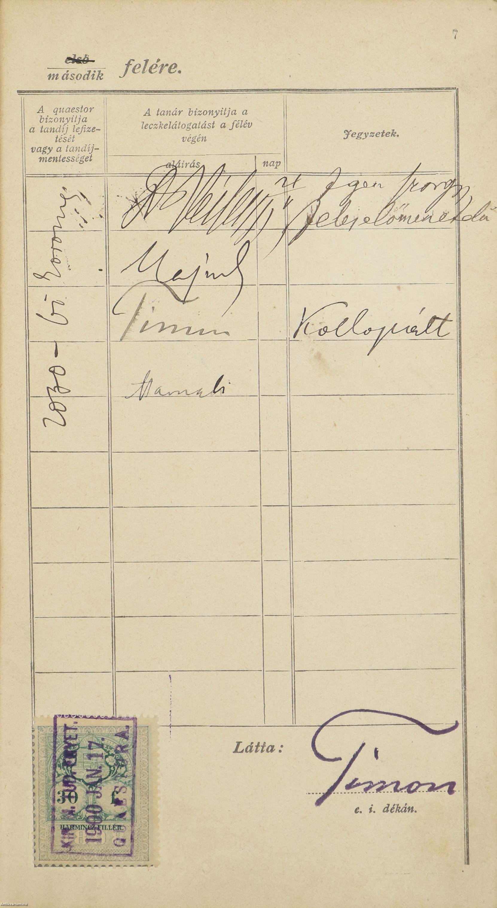 A címfedél belső oldalán a leckekönyv tulajdonosának beragasztott fekete-fehér fényképével, a Budapesti Királyi Magyar Tudomány-Egyetem ostyapecsétjével. A leckekönyv egyes oldalain további 1 ostyapecsét, számos hivatalos egyetemi bélyegzések, valamint összesen 14 beragasztott illetékbélyeg látható.