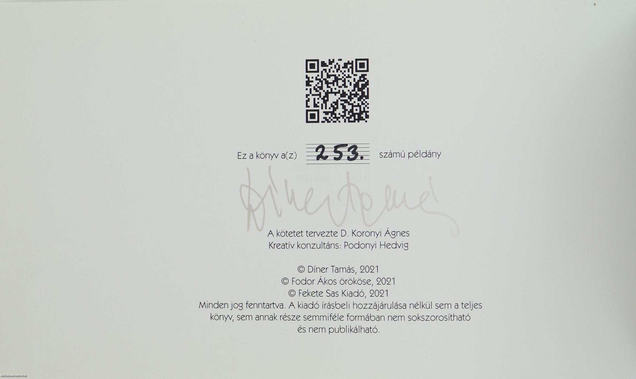 Díner Tamás fényképész által aláírt példány. Első, exkluzív kiadás. Beszédes kép/képes beszéd. Írta: Fodor Ákos. Fényképezte: Díner Tamás. Az előlap verzóján, a számozás alatt, a fotográfus, Díner Tamás tollal beírt, jól olvasható aláírása látható. Ez a könyv a 253. számú [kézzel számozott] példány. A kötetet tervezte D. Korányi Ágnes. Szöveg közti, színes és fekete-fehér fényképekkel gazdagon illusztrált, valamint tartalomjegyzékkel ellátott kötet. Készült a Séd Nyomda Kft. üzemében. Kiadói varrott kemény papírkötésben lévő példány feliratozott, a fotós és a szerző fekete-fehér portréjával ellátott címfedéllel, feliratos könyvgerinccel, szöveges, illusztrált hátlappal, hiánytalan állapotban. A fotográfus, Díner Tamás (Kisvárda, 1946. július 17. –) magyar fényképész, reklámfotós. A budapesti fotó-optikai szakközépiskolában érettségizett. Ezt követően az Ofotért és a Látszerész Ktsz. munkatársaként működött. Portréit elsősorban zenészekről, énekesekről és színészekről készíti. Több hanglemezborítóhoz és kazettafedélhez készített sztárportrékat. Külső munkatársa több újságnak is. 1979-től a "Szabadidő Magazin" riportereként, 1981-től képszerkesztőjeként dolgozik. Több mint 150 lemez, CD borítót, könyvet és plakátot tervezett és fotózott. A Magyar Fesztivál Balett plakátjait éveken át készítette.