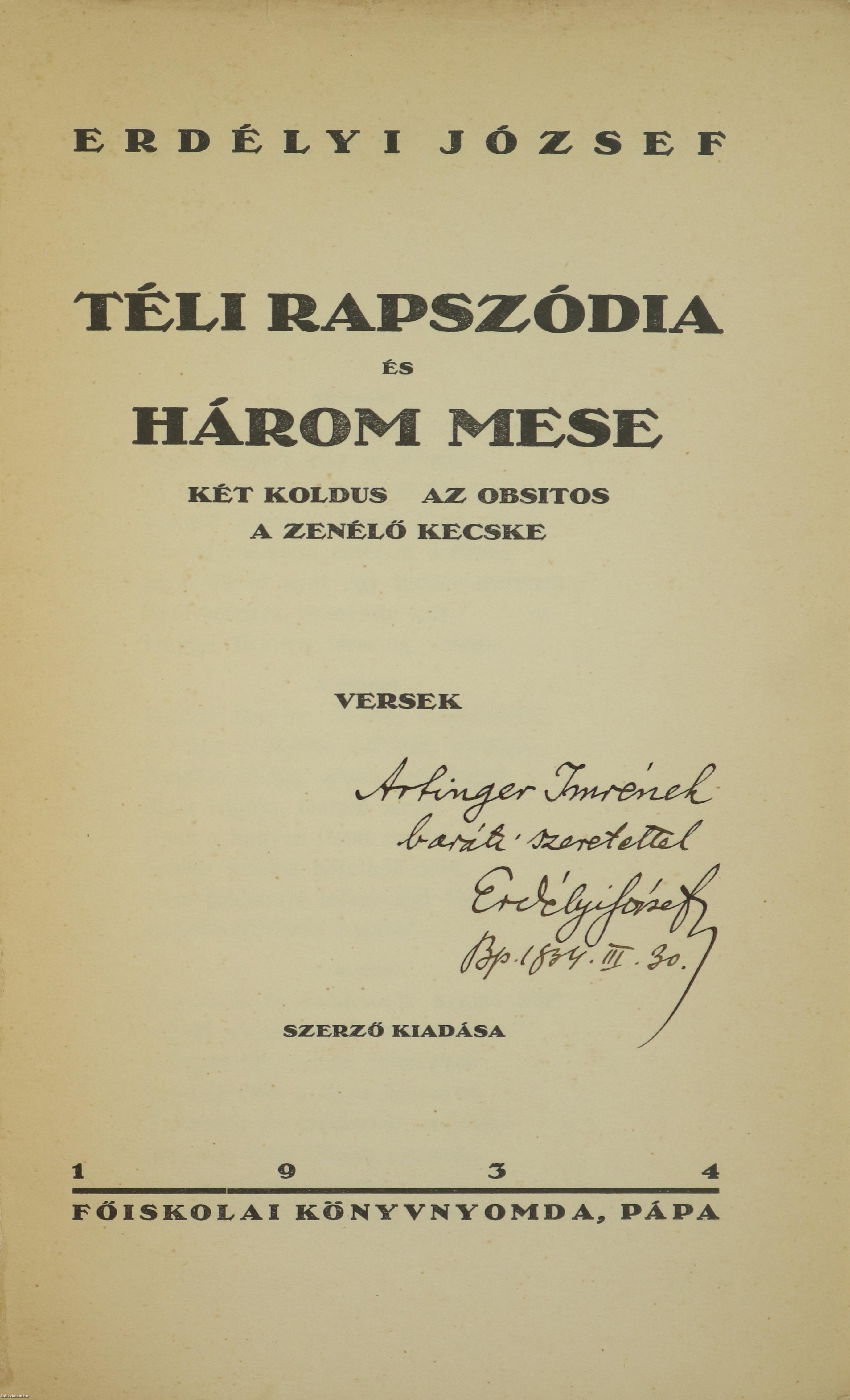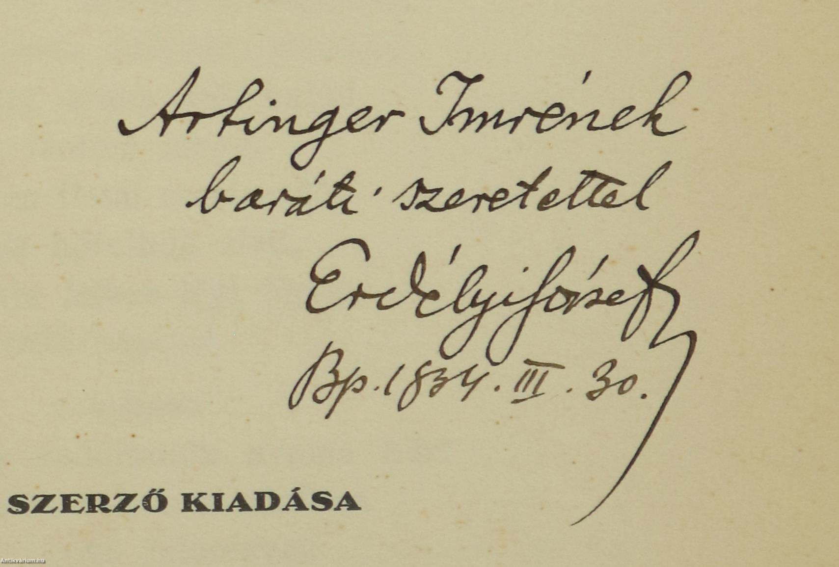 A címlapon a szerző, Erdélyi József tollal beírt, névre szóló dedikációja olvasható: "Artinger Imrének baráti szeretettel Erdélyi József. Bp. 1934. III. 30."