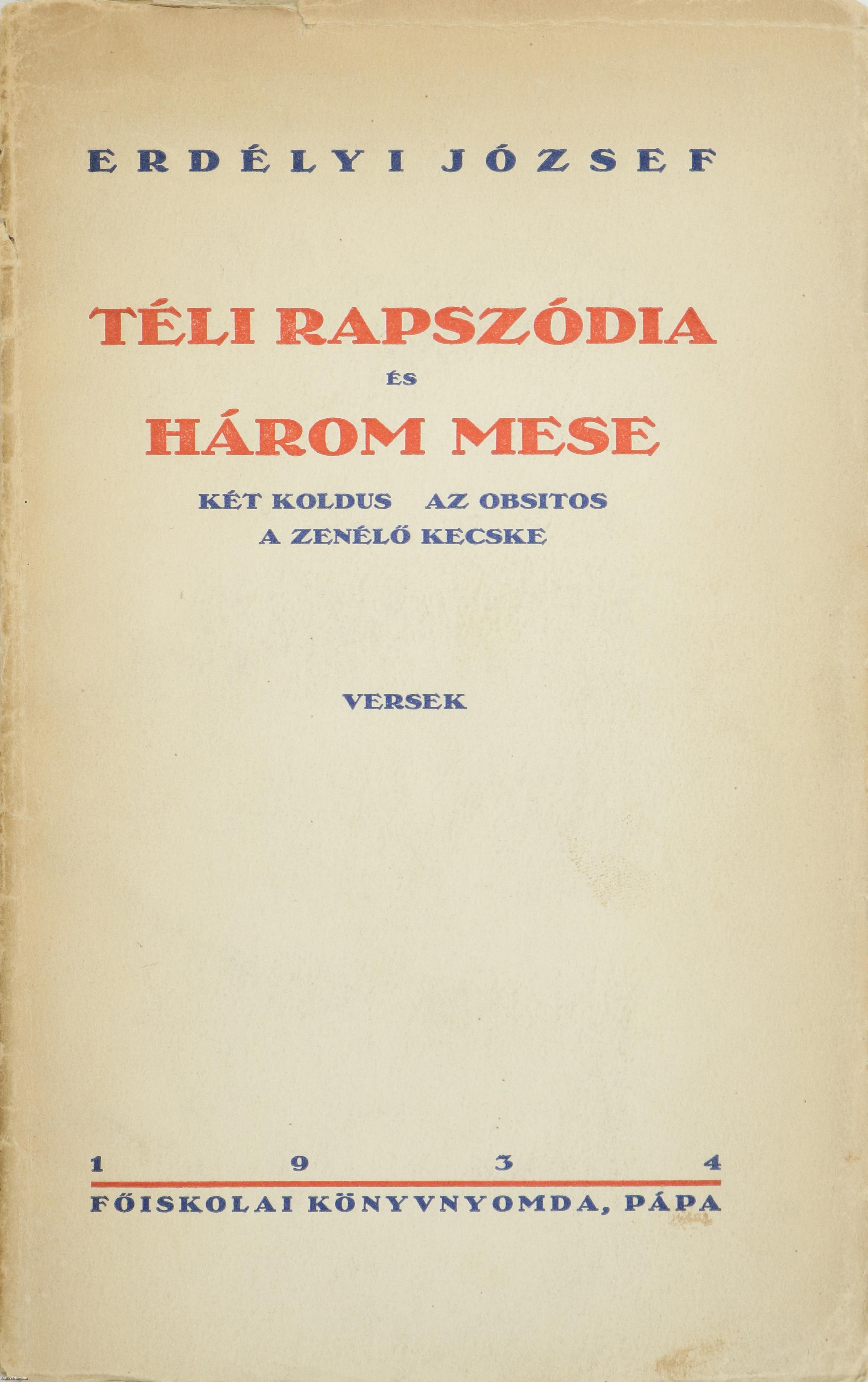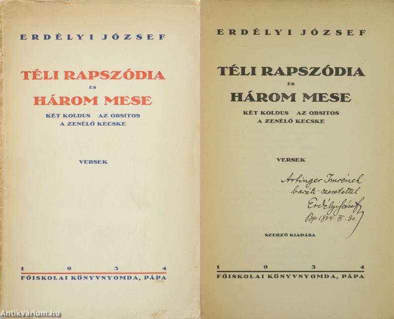 Szerző által dedikált példány. Első kiadás. Téli rapszódia és három mese. Két koldus. - Az obsitos. - A zenélő kecske. Versek. Írta: Erdélyi József.