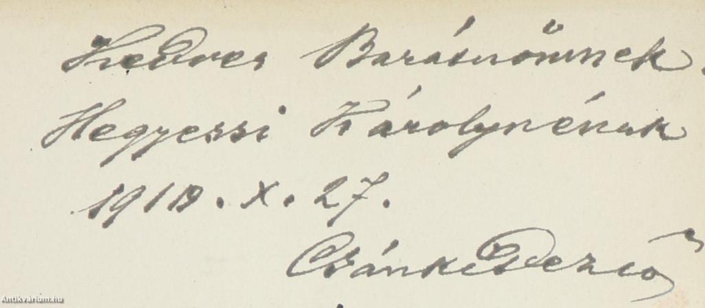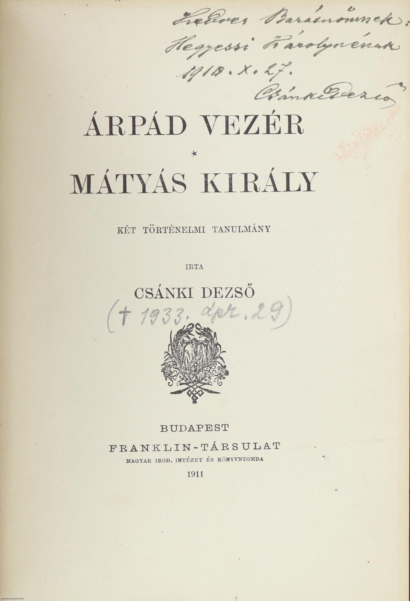 Szerző által dedikált példány. Árpád vezér. / Mátyás király. Két történelmi tanulmány. Írta: Csánki Dezső. A címlapon a szerző, Csánki Dezső tollal beírt, névre szóló dedikációja olvasható: "Kedves Barátnőmnek: H. K.-nénak 1919. X. 27. Csánki Dezső". A címlap előtt a szerző utólagosan beragasztott portréja látható. Előszóval kiegészített kötet. Nyomtatta a Franklin-Társulat Nyomdája. Kiadói egészvászon kötésben lévő példány feliratozott címfedéllel és könyvgerinccel, feliratozatlan hátlappal, színes, mintázott, kiadói előzéklapokkal, mintázott lapélekkel, hiánytalan állapotban. A kötet szerzője, Csánki Dezső (1857-1933) történész, levéltáros, politikus, a Magyar Tudományos Akadémia tagja. Fiatalon először a Magyar Nemzeti Múzeum munkatársa, majd a Magyar Országos Levéltárhoz került. 1912-től 1932-ig a levéltár igazgatói tisztségét is betöltötte. Tagja volt Magyar Történelmi Társulat és a Magyar Heraldikai és Genealógiai Társulat igazgató-választmányának, továbbá a lengyel-magyar kapcsolatok ápolását célul tűző, elsősorban irodalommal foglalkozó Magyar Mickiewicz Társaságnak.