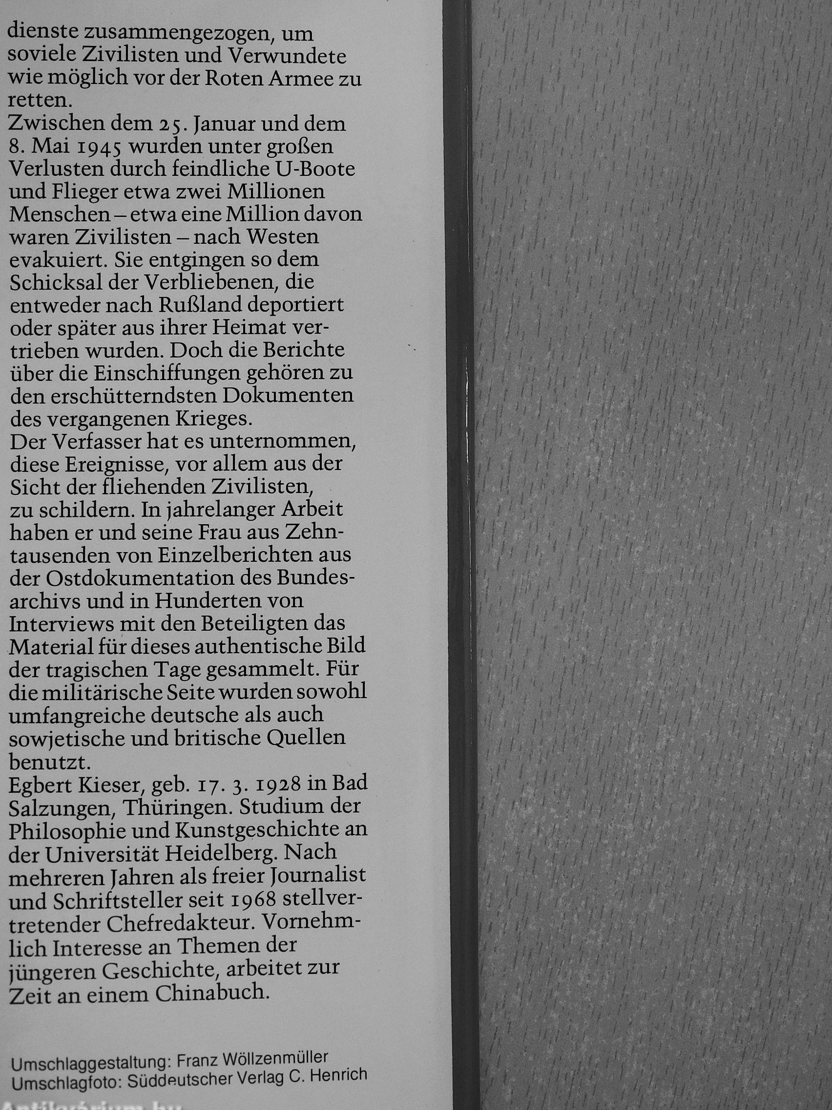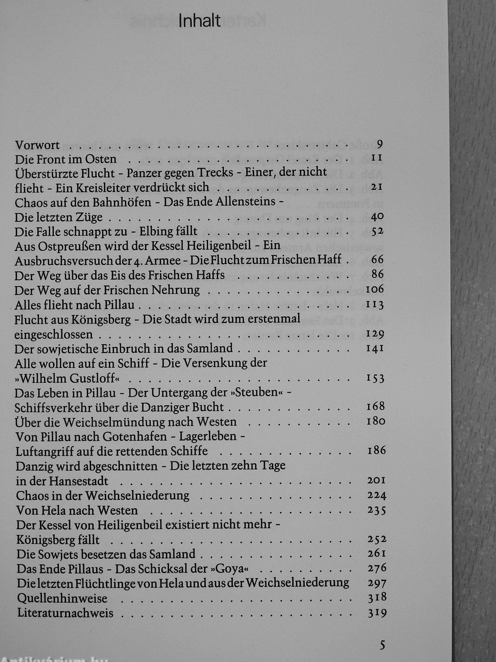 Zwischen dem 25. Januar und dem 8. Mai 1945 wurden unter großen Verlusten durch feindliche U-Boote und Flieger etwa zwei Millionen Menschen - etwa eine Million davon waren Zivilisten - nach Westen evakuiert. Sie entgingen so dem Schicksal der Verbliebenen, die entweder nach Rußland deportiert oder später aus ihrer Heimat vertrieben wurden. Doch die Berichte über die Einschiffungen gehören zu den erschütterndsten Dokumenten des vergangenen Krieges. Der Verfasser hat es unternommen, diese Ereignisse, vor allem aus der Sicht der fliehenden Zivilisten, zu schildern. In jahrelanger Arbeit haben er und seine Frau aus Zehntausenden von Einzelberichten aus der Ostdokumentation des Bundesarchivs imd in Hunderten von Interviews mit den Beteiligten das Material für dieses authentische Bild der tragischen Tage gesammelt. Für die militärische Seite wurden sowohl umfangreiche deutsche als auch sowjetische und britische Quellen benutzt.
