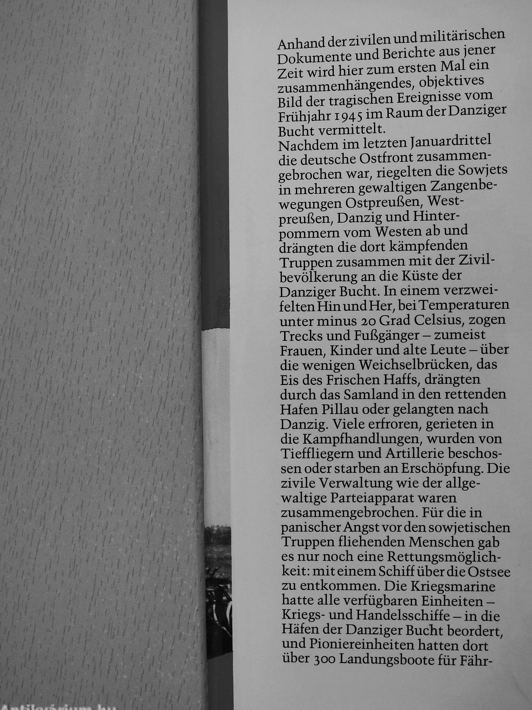 zusammenhängendes, objektives Bild der tragischen Ereignisse vom Frühjahr 1945 im Raum der Danziger Bucht vermittelt. Nachdem im letzten Januardrittel die deutsche Ostfront zusammengebrochen Mrar, riegelten die Sov^jets in mehreren gewaltigen Zangenbewegungen Ostpreußen, Westpreußen, Danzig und Hinter-pommem vom Westen ab und drängten die dort kämpfenden Truppen zusammen mit der Zivilbevölkerung an die Küste der Danziger Bucht. In einem verzvvrei-f elten Hin und Her, bei Temperaturen unter minus 20 Grad Celsius, zogen Trecks und Fußgänger - zumeist Frauen, Kinder tmd alte Leute - über die wenigen Weichselbrücken, das Eis des Frischen Haffs, drängten durch das Samland in den rettenden Hafen Pillau oder gelangten nach Danzig. Viele erfroren, gerieten in die Kampfhandlungen, vmrden von Tieffliegem und Artillerie beschossen oder starben an Erschöpfung. Die zivile Verwaltung wie der allge-w^altige Parteiapparat waren zusammengebrochen. Für die in panischer Angst vor den sowjetischen Truppen fhehenden Menschen gab es nur noch eine Rettungsmöglichkeit: mit einem Schiff über die Ostsee zu entkommen. Die Kriegsmarine hatte alle verfügbaren Einheiten -Kriegs- und Handelsschiffe - in die Häfen der Danziger Bucht beordert, und Pioniereinheiten hatten dort über 300 Landungsboote für Fähr-