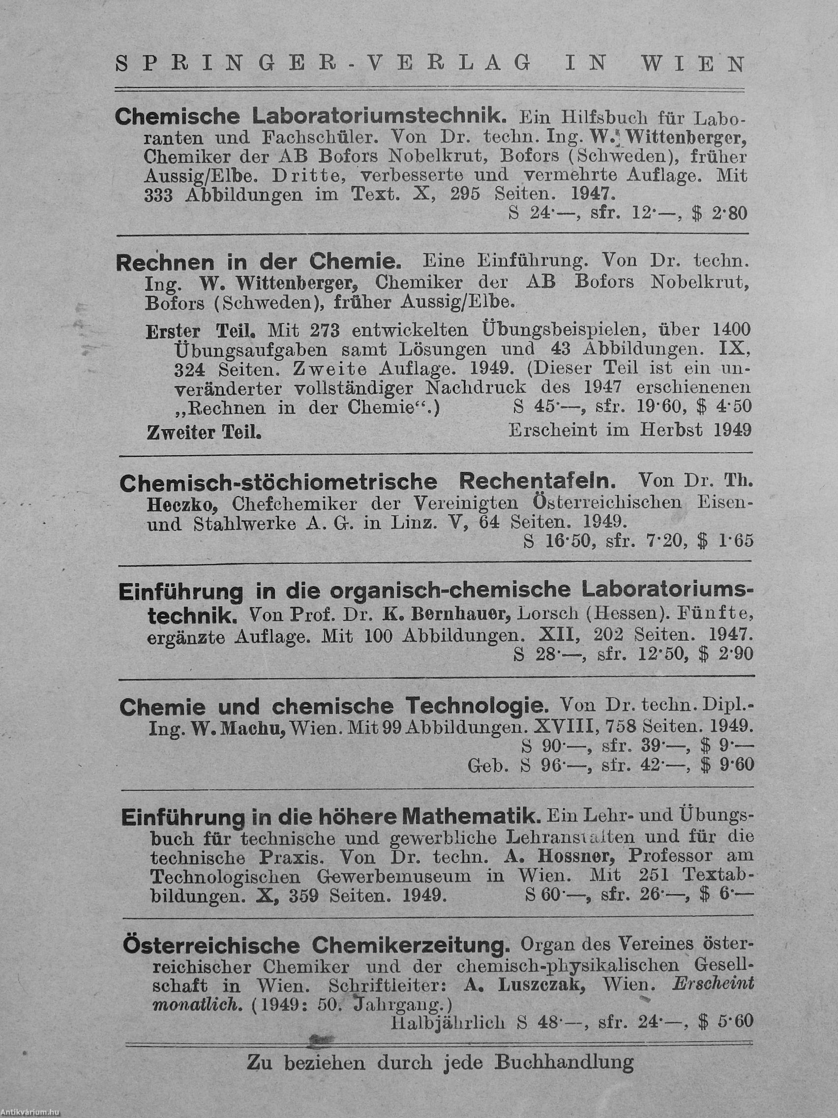 Österreichische Chemikerzeitung. Organ des Vereines österreichischer Chemiker und der cliemisch-pLysikalischen Gesellschaft in Wien. Schriftleiter: A. Luszczak, Wien. Erscheint monatlich. (1949: 50. tialugang.)