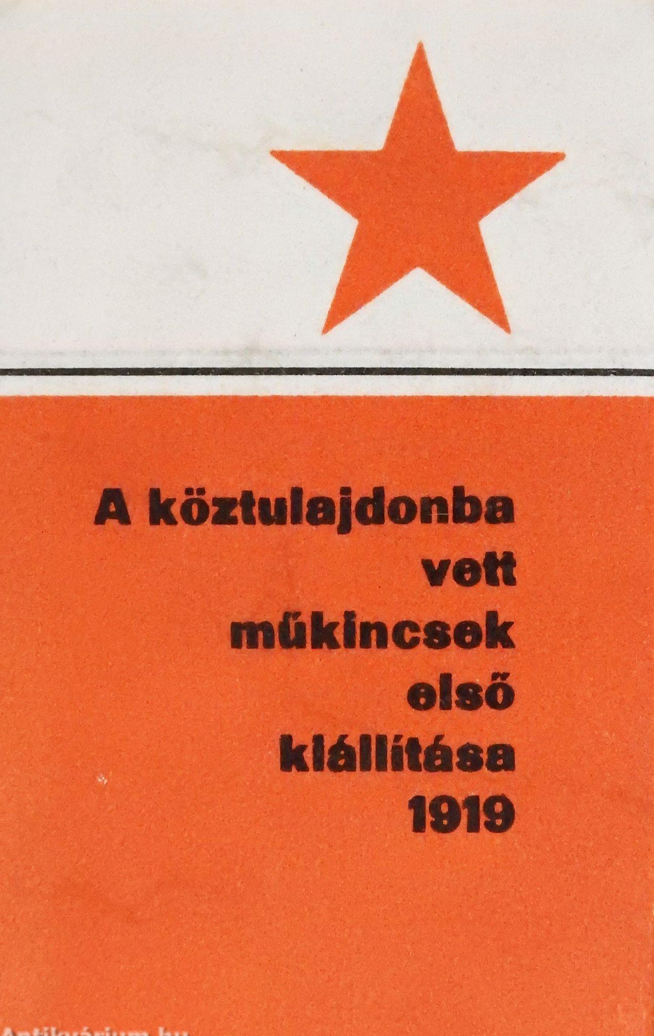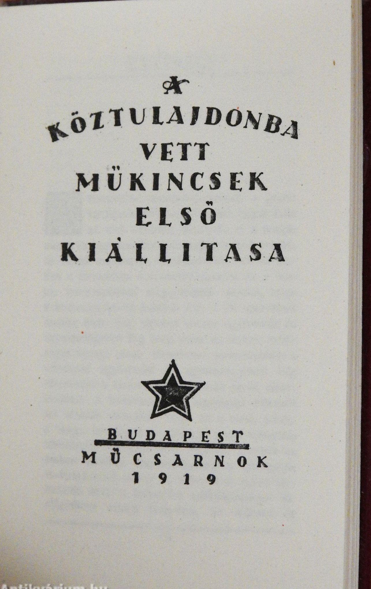1919 június havában, amikor a Tanácsköztársaság fegyverrel küzdött hazánk fennmaradásáért, rendezte meg A köztulajdonba vett műkincsek első kiállítását a budapesti Műcsarnok 12 termében a Műtárgyak Társadalmasító Bizottság. "A forradalom vihara most összehordta késői igazságszolgáltatással mindenki számára azokat a kincseket, amelyek mindenki számára teremtődtek" - olvasható a kiállításról az Új Idők 1919. július 10-i számában.