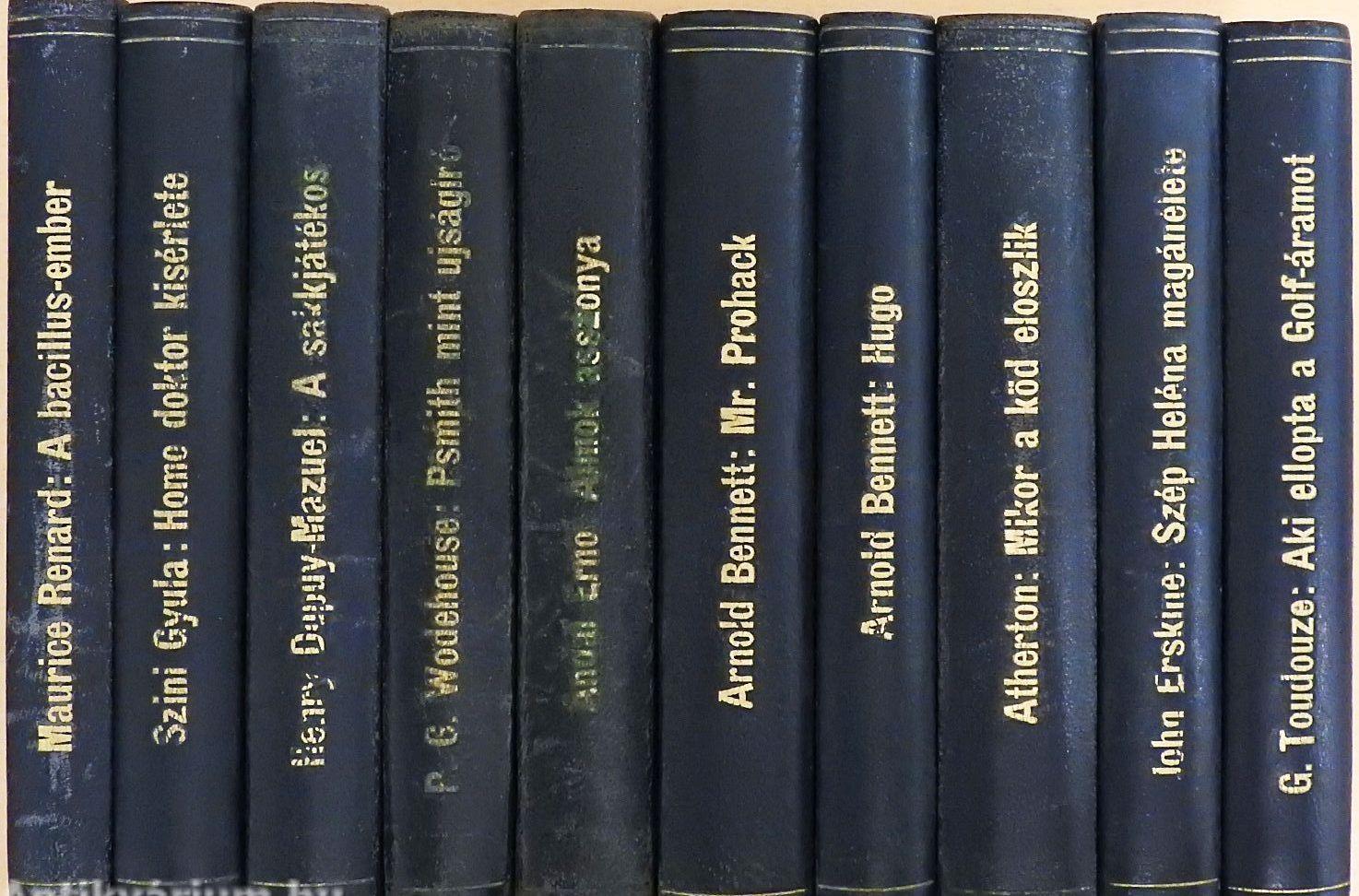 | Megjegyzés: | 10 kötet háború előtt megjelent szépirodalmi mű egységes félbőr könyvkötői kötésben. A művek felsorolása a tartalomjegyzékben olvasható. Nyomtatta a Budapesti Hirlap nyomdája és a Globus, Budapest. |