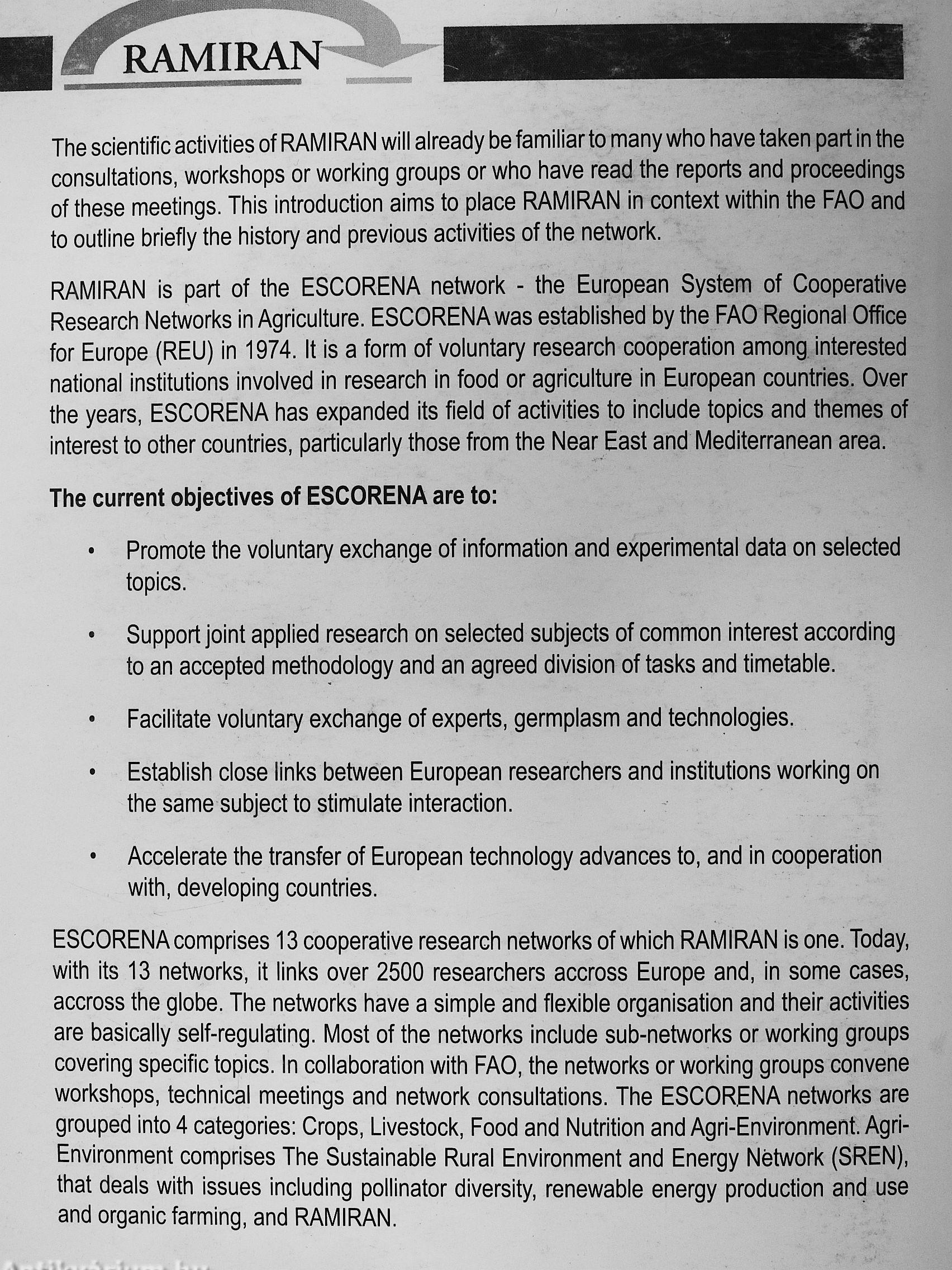 RAMIRAN is part of the ESCORENA network - the European System of Cooperative Research Networks in Agriculture. ESCORENA was established by the FAO Regional Office for Europe (REU) in 1974. It is a form of voluntary research cooperation among interested national institutions involved in research in food or agriculture in European countries. Over the years, ESCORENA has expanded its field of activities to include topics and themes of interest to other countries, particularly those from the Near East and Mediterranean area.