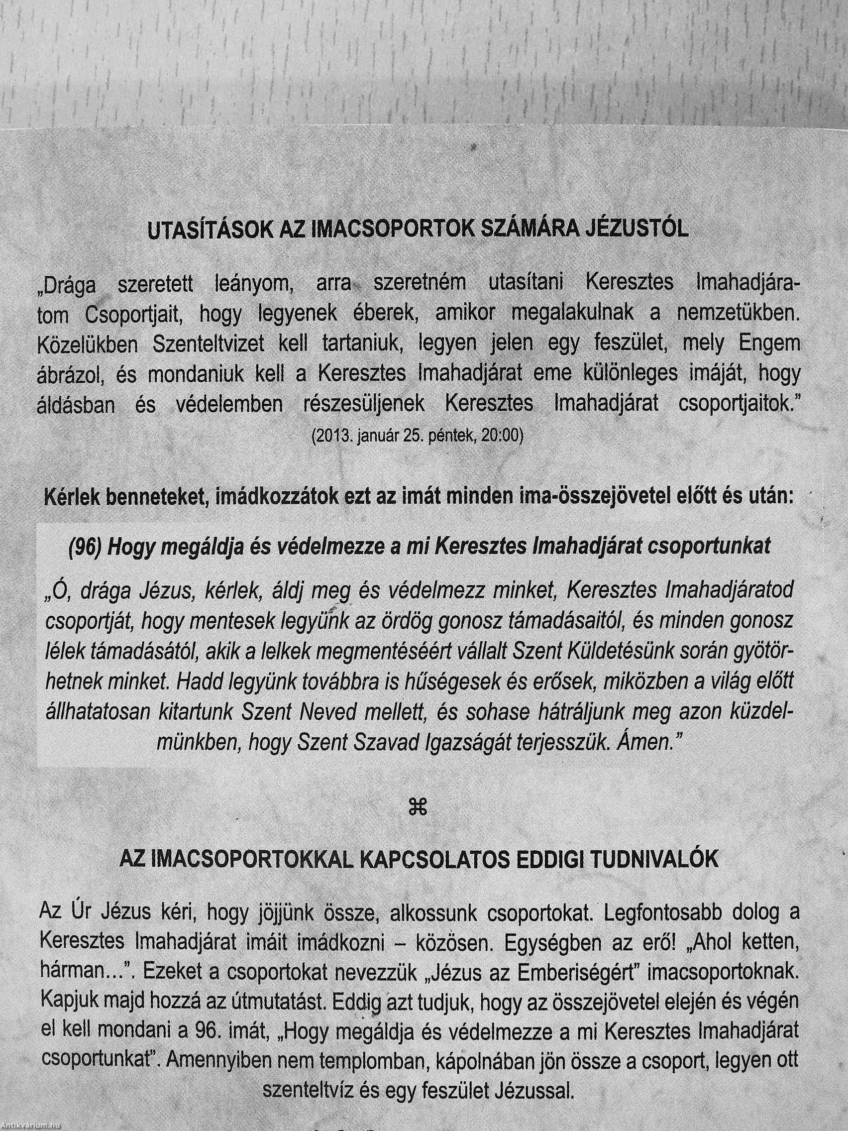 „Drága szeretett leányom, arra szeretném utasítani Keresztes Imahadjáratom Csoportjait, hogy legyenek éberek, amikor megalakulnak a nemzetükben. Közelükben Szenteltvizet kell tartaniuk, legyen jelen egy feszület, mely Engem ábrázol, és mondaniuk kell a Keresztes Imahadjárat eme különleges imáját, hogy áldásban és védelemben részesüljenek Keresztes Imahadjárat csoportjaitok."