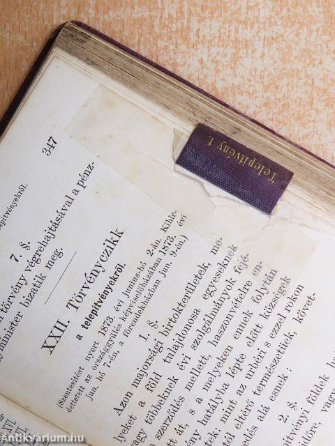 | Megjegyzés: | Regiszteres kiadás. Nyomatta Wigand F. K. nyomdája Pozsonyban. A "Törvényczikk a Németországgal 1872. évi május 7-én kötött postaszerződésről" német nyelven is megtalálható a könyvben. |