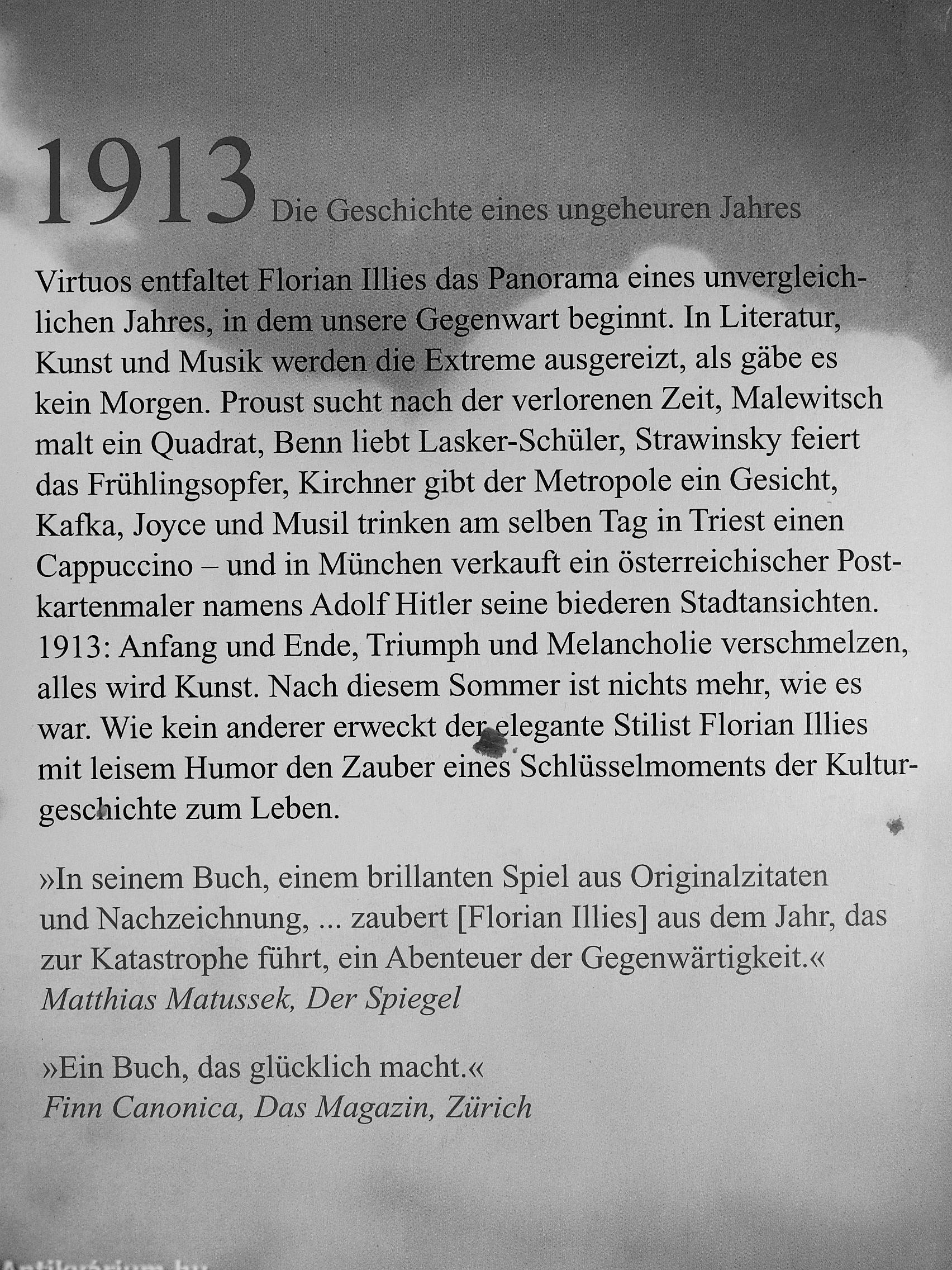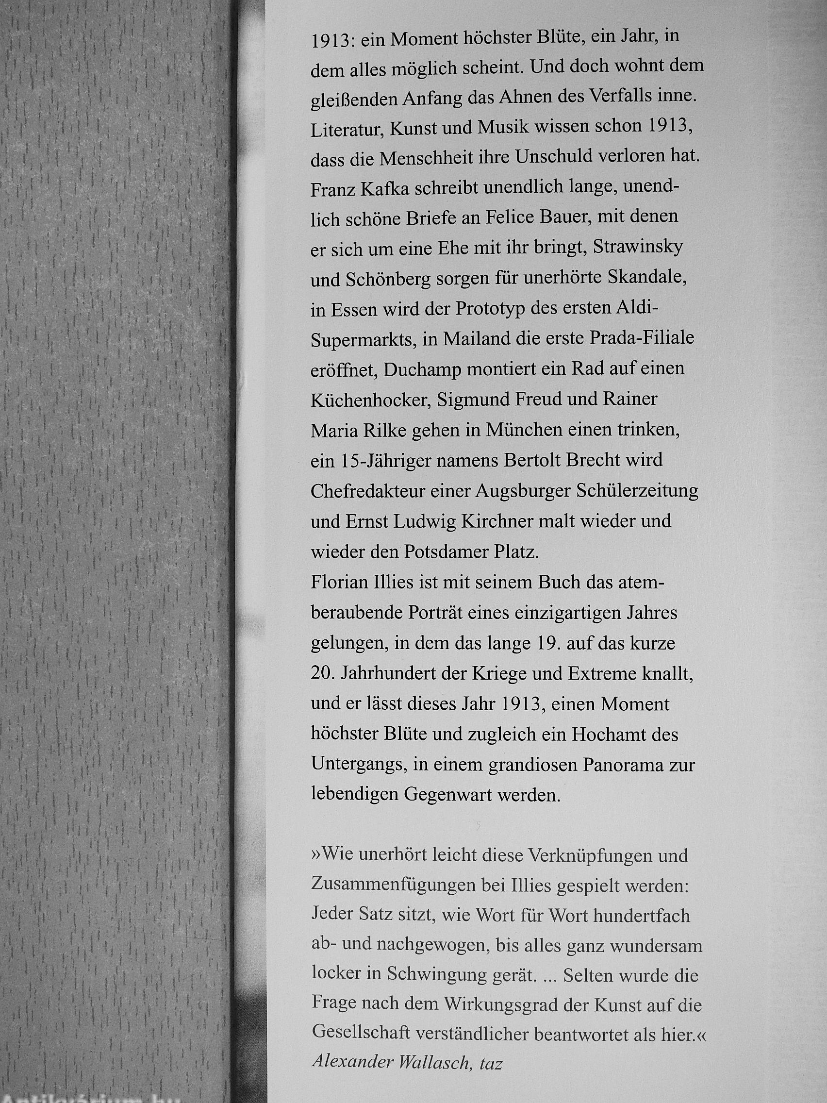 1913: ein Moment höchster Blüte, ein Jahr, in dem alles möglich scheint. Und doch wohnt dem gleißenden Anfang das Ahnen des Verfalls inne. Literatur, Kunst und Musik wissen schon 1913, dass die Menschheit ihre Unschuld verloren hat. Franz Kafka schreibt unendlich lange, unendlich schöne Briefe an Feiice Bauer, mit denen er sich um eine Ehe mit ihr bringt, Strawinsky und Schönberg sorgen für unerhörte Skandale, in Essen wird der Prototyp des ersten Aldi-Supermarkts, in Mailand die erste Prada-Filiale eröffnet, Duchamp montiert ein Rad auf einen Küchenhocker, Sigmund Freud und Rainer Maria Rilke gehen in München einen trinken, ein 15-Jähriger namens Bertolt Brecht wird Chefredakteur einer Augsburger Schülerzeitung und Ernst Ludwig Kirchner mah wieder und wieder den Potsdamer Platz. Florian Illies ist mit seinem Buch das atemberaubende Porträt eines einzigartigen Jahres gelungen, in dem das lange 19. auf das kurze 20. Jahrhundert der Kriege und Extreme knallt, und er lässt dieses Jahr 1913, einen Moment höchster Blüte und zugleich ein Hochamt des Untergangs, in einem grandiosen Panorama zur lebendigen Gegenwart werden.