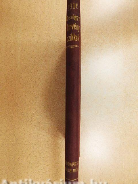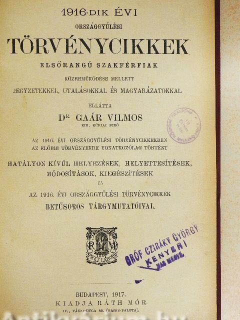 | Megjegyzés: | Elsőrangú szakférfiak közreműködése mellett jegyzetekkel, utalásokkal és magyarázatokkal ellátta Dr. Gaár Vilmos kis. kúriai biró. Az 1916. évi országgyülési törvénycikkekben az előbbi törvényeikre vonatkozólag történt hatályon kívül helyezések, helyettesítések, módosítások, kiegészítések és az 1916. évi országgyűlési törvénycikkek betűsoros tárgymutatóival. Nyomtatta a Pallas Részvénytársaság Nyomdája, Budapesten. |