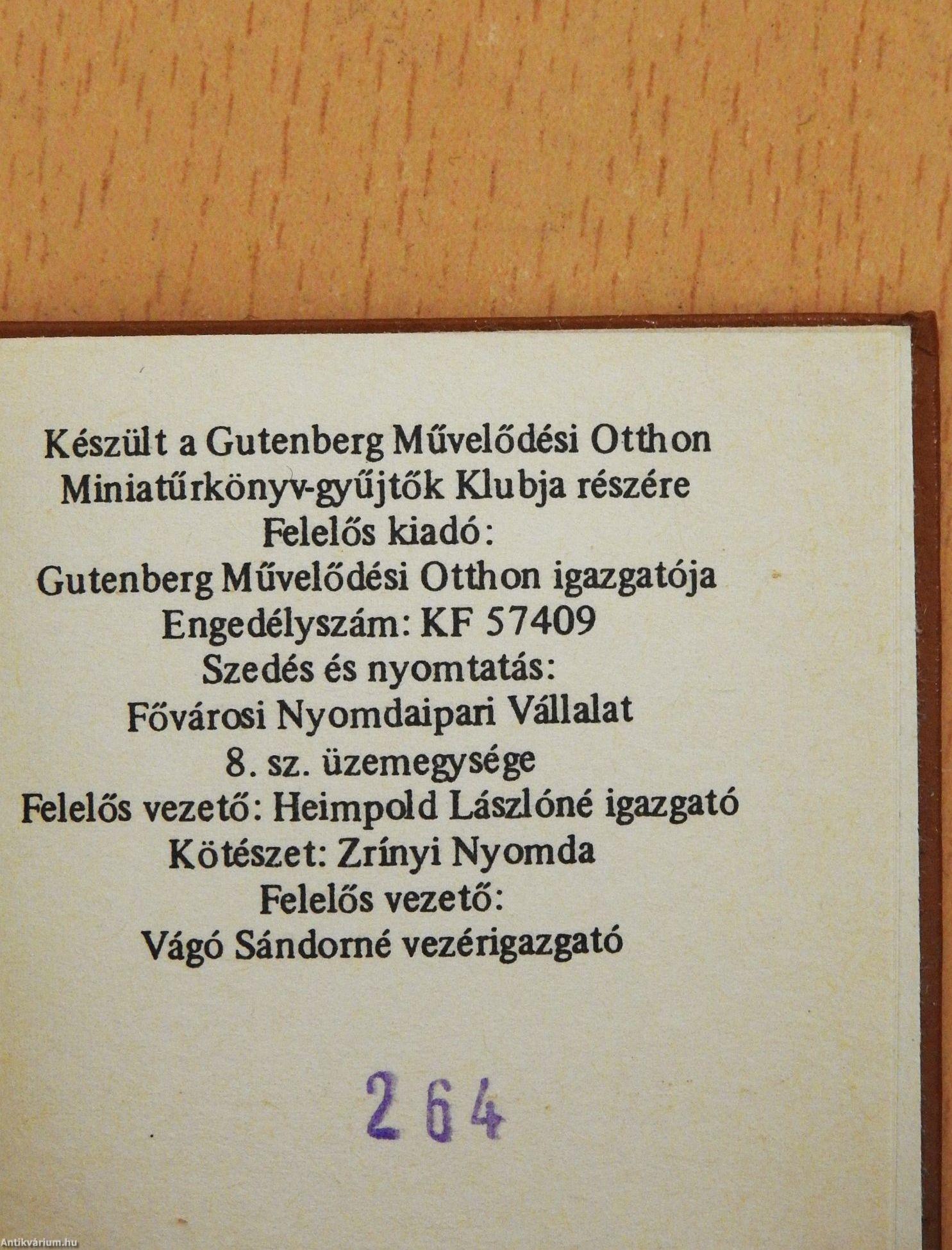 | Megjegyzés: | Számozott kiadás. Könyvtervező: Molnár László Nyomda: Fővárosi Nyomdaipari Vállalat Fekete-fehér fotókkal illusztrálva. A könyv pontos mérete: 56 x 55 mm. |