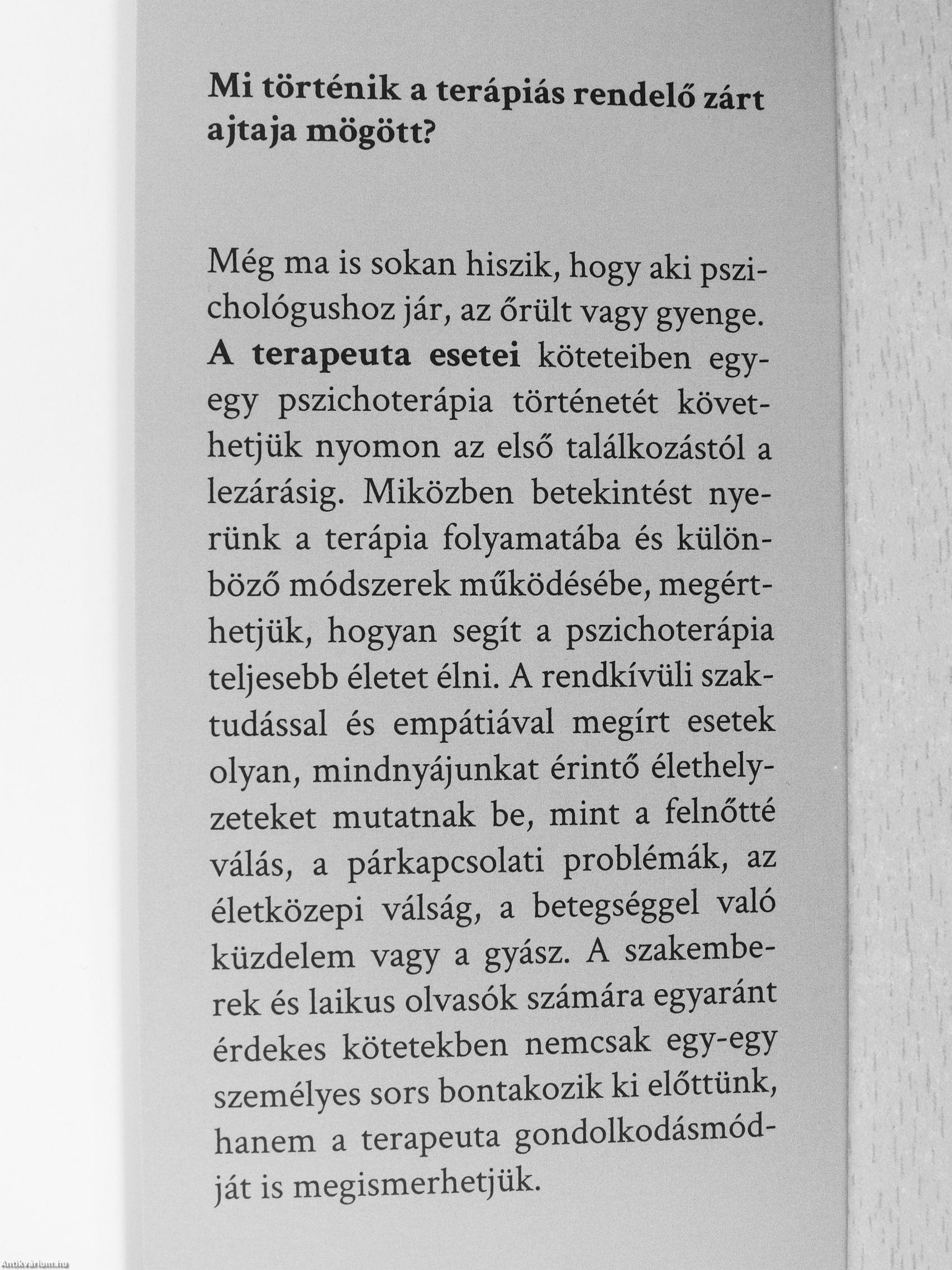 Még ma is sokan hiszik, hogy aki pszichológushoz jár, az őrült vagy gyenge. A terapeuta esetei köteteiben egy-egy pszichoterápia történetét követhetjük nyomon az első találkozástól a lezárásig. Miközben betekintést nyerünk a terápia folyamatába és különböző módszerek működésébe, megérthetjük, hogyan segít a pszichoterápia teljesebb életet élni. A rendkívüh szaktudással és empátiával megírt esetek olyan, mindnyájunkat érintő élethelyzeteket mutatnak be, mint a felnőtté válás, a párkapcsolati problémák, az életközepi válság, a betegséggel való küzdelem vagy a gyász. A szakemberek és laikus olvasók számára egyaránt érdekes kötetekben nemcsak egy-egy személyes sors bontakozik ki előttünk, hanem a terapeuta gondolkodásmódját is megismerhetjük.