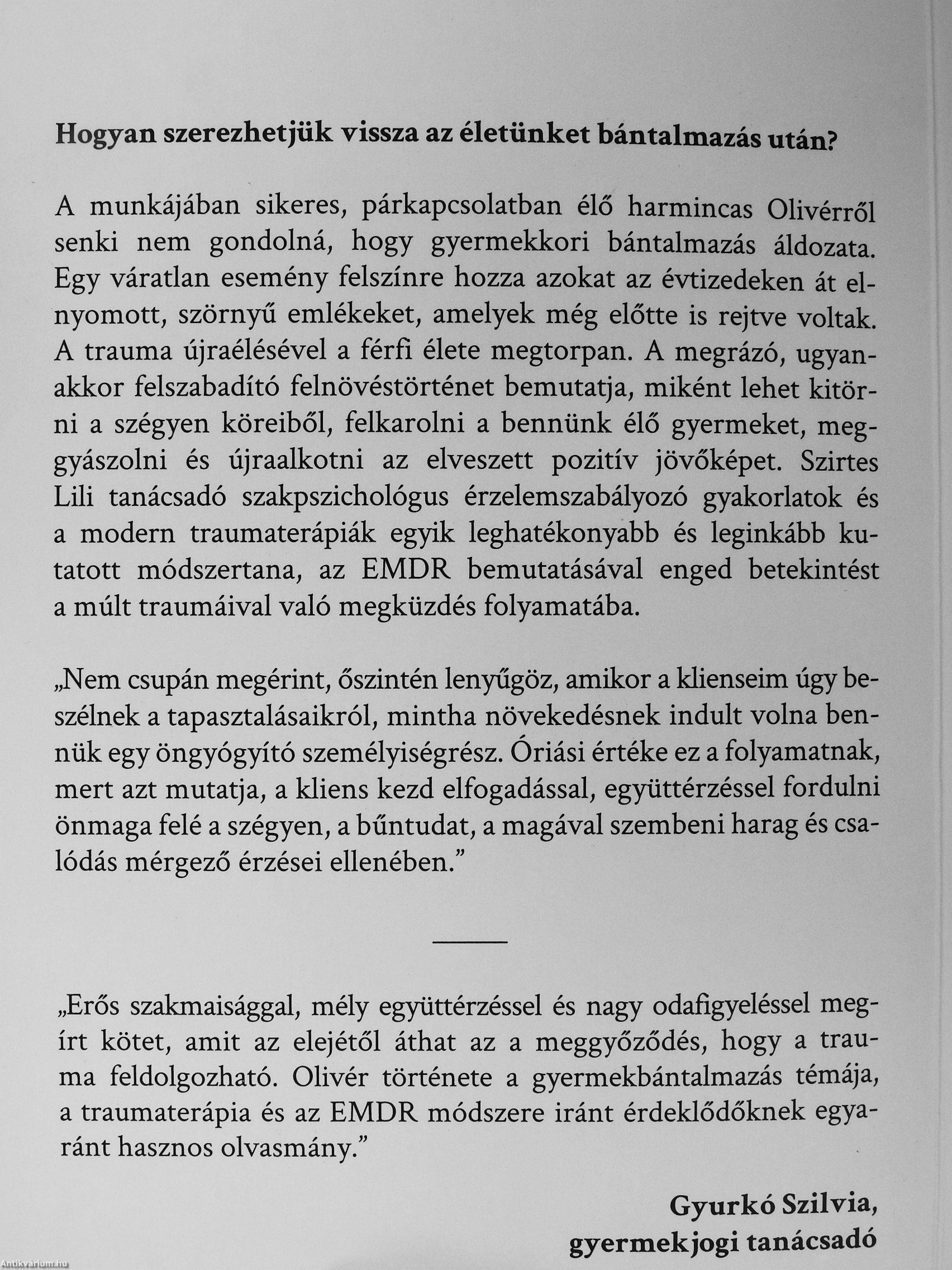A munkájában sikeres, párkapcsolatban élő harmincas Olivérről senki nem gondolná, hogy gyermekkori bántalmazás áldozata. Egy váratlan esemény felszínre hozza azokat az évtizedeken át elnyomott, szörnyű emlékeket, amelyek még előtte is rejtve voltak. A trauma újraélésével a férfi élete megtorpan. A megrázó, ugyanakkor felszabadító felnövéstörténet bemutatja, miként lehet kitörni a szégyen köreiből, felkarolni a bennünk élő gyermeket, meggyászolni és újraalkotni az elveszett pozitív jövőképet. Szirtes Lili tanácsadó szakpszichológus érzelemszabályozó gyakorlatok és a modern traumaterápiák egyik leghatékonyabb és leginkább kutatott módszertana, az EMDR bemutatásával enged betekintést a múlt traumáival való megküzdés folyamatába.