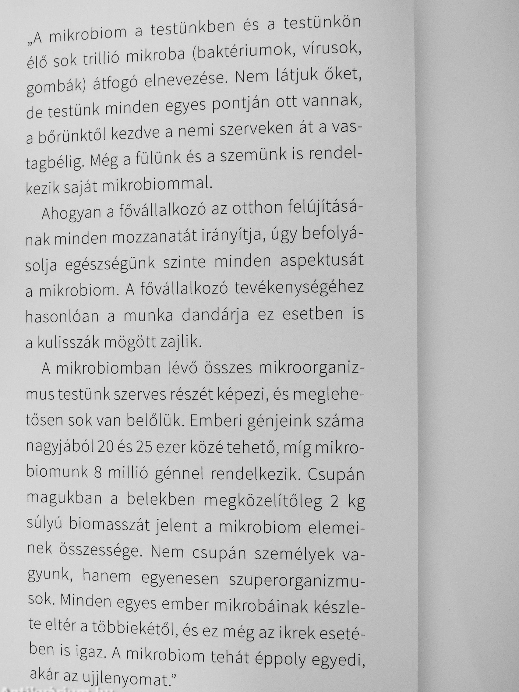 A mikrobiomban lévő összes mikroorganizmus testünk szerves részét képezi, és meglehetősen sok van belőlük. Emberi génjeink száma nagyjából 20 és 25 ezer közé tehető, míg mikro-biomunk 8 millió génnel rendelkezik. Csupán magukban a belekben megközelítőleg 2 kg súlyú biomasszát jelent a mikrobiom elemeinek összessége. Nem csupán személyek vagyunk, hanem egyenesen szuperorganizmusok. Minden egyes ember mikrobáinak készlete eltér a többiekétől, és ez még az ikrek esetében is igaz. A mikrobiom tehát éppoly egyedi, akár az uiilenyomat."