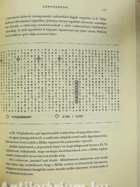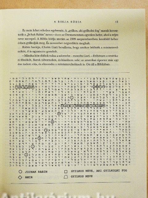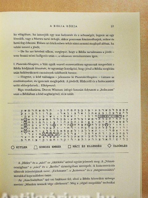 Szenzációs, lenyűgöző, hihetetlen, elképesztő! - Leggyakrabban ezekkel a jelzőkkel illették a könyvet kritikusai, amely hónapokig vezette a New York Times sikerlistáját, s állt a viták kereszttüzében. Háromezer esztendővel ezelőtt született az írás, amelyben előre kódolták az emberiség múltjának, jelenének és jövőjének eseményeit - állítja a szerző. A könyv valószínűleg ott van mindannyiunk otthonában, mert ez a könyvek könyve, a Biblia. Eli Rips, izraeli matematikus törte fel a kódot, és segítségével a szerző a Biblia rejtjelezett szövegében megtalálta mai történelmünk fordulópontjaira utaló szövegrészeket.