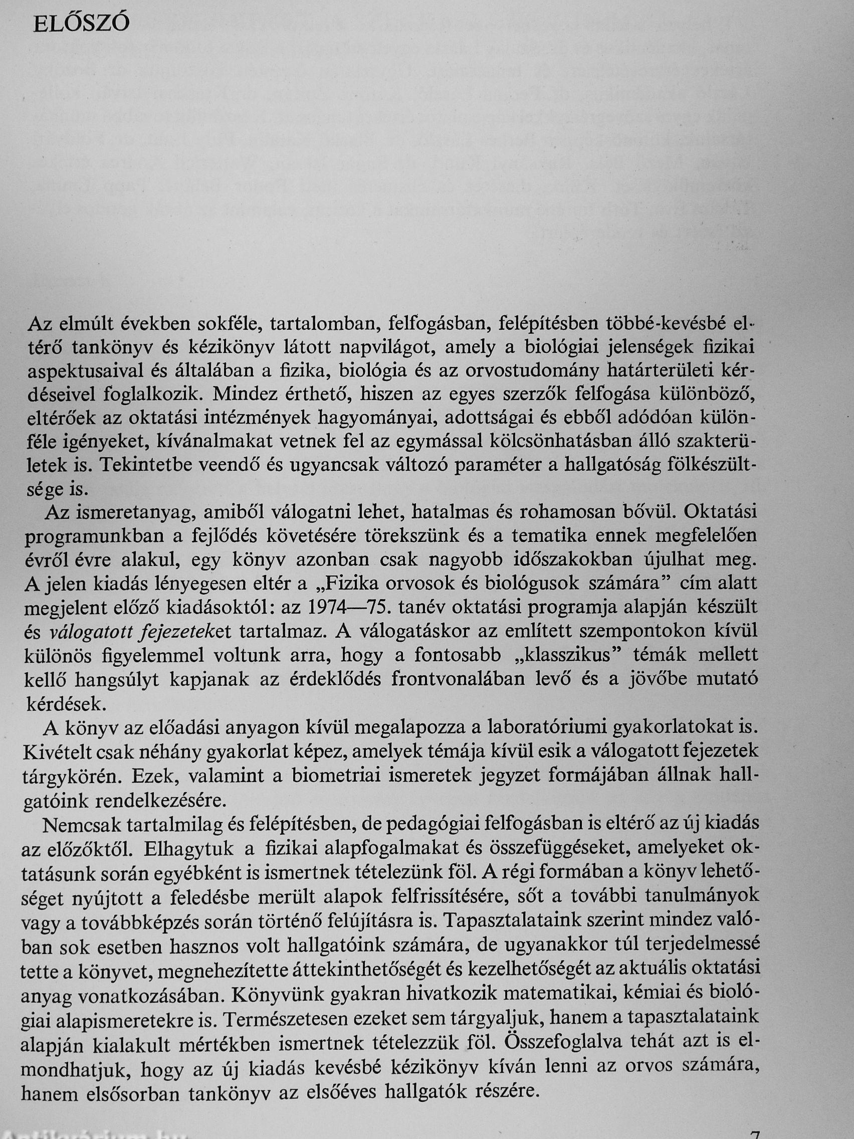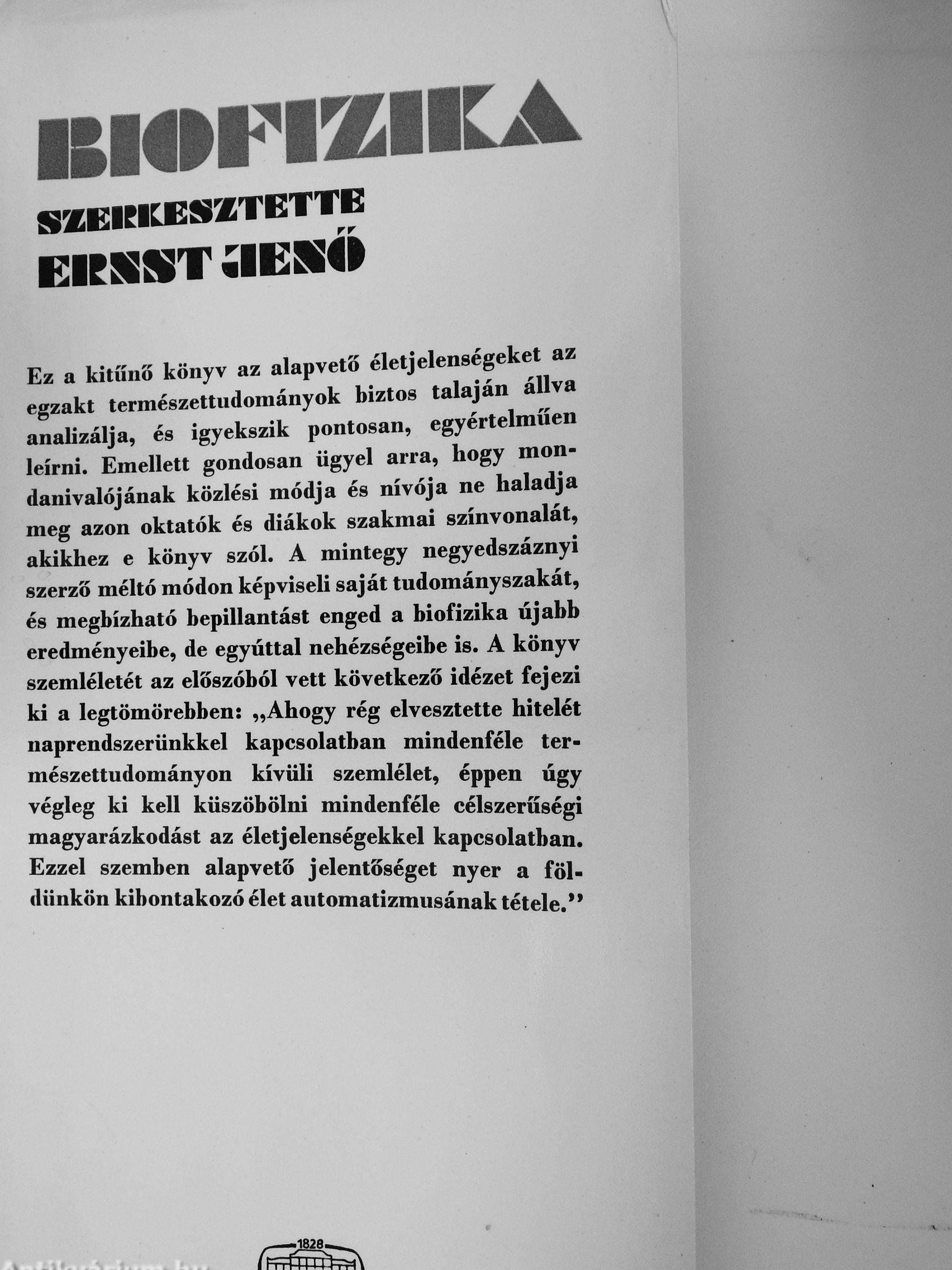 Ez a kitűnő könyv az alapvető életjelenségeket az egzakt természettudományok biztos talaján állva analizálja, és igyekszik pontosan, egyértelműen leírni. Emellett gondosan ügyel arra, hogy mondanivalójának közlési módja és nívója ne haladja meg azon oktatók és diákok szakmai színvonalát, akikhez e könyv szól. A mintegy negyedszáznyi szerző méltó módon képviseh saját tudományszakát, és megbízható bepillantást enged a biofizika újabb eredményeibe, de egyúttal nehézségeibe is. A könyv szemléletét az előszóból vett következő idézet fejezi ki a legtömörebben; „Ahogy rég elvesztette hitelét naprendszerünkkel kapcsolatban mindenféle természettudományon kívüli szemlélet, éppen úgy végleg ki kell küszöbölni mindenféle célszerűségi magyarázkodást az életjelenségekkel kapcsolatban. Ezzel szemben alapvető jelentőséget nyer a földünkön kibontakozó élet automatizmusának tétele."