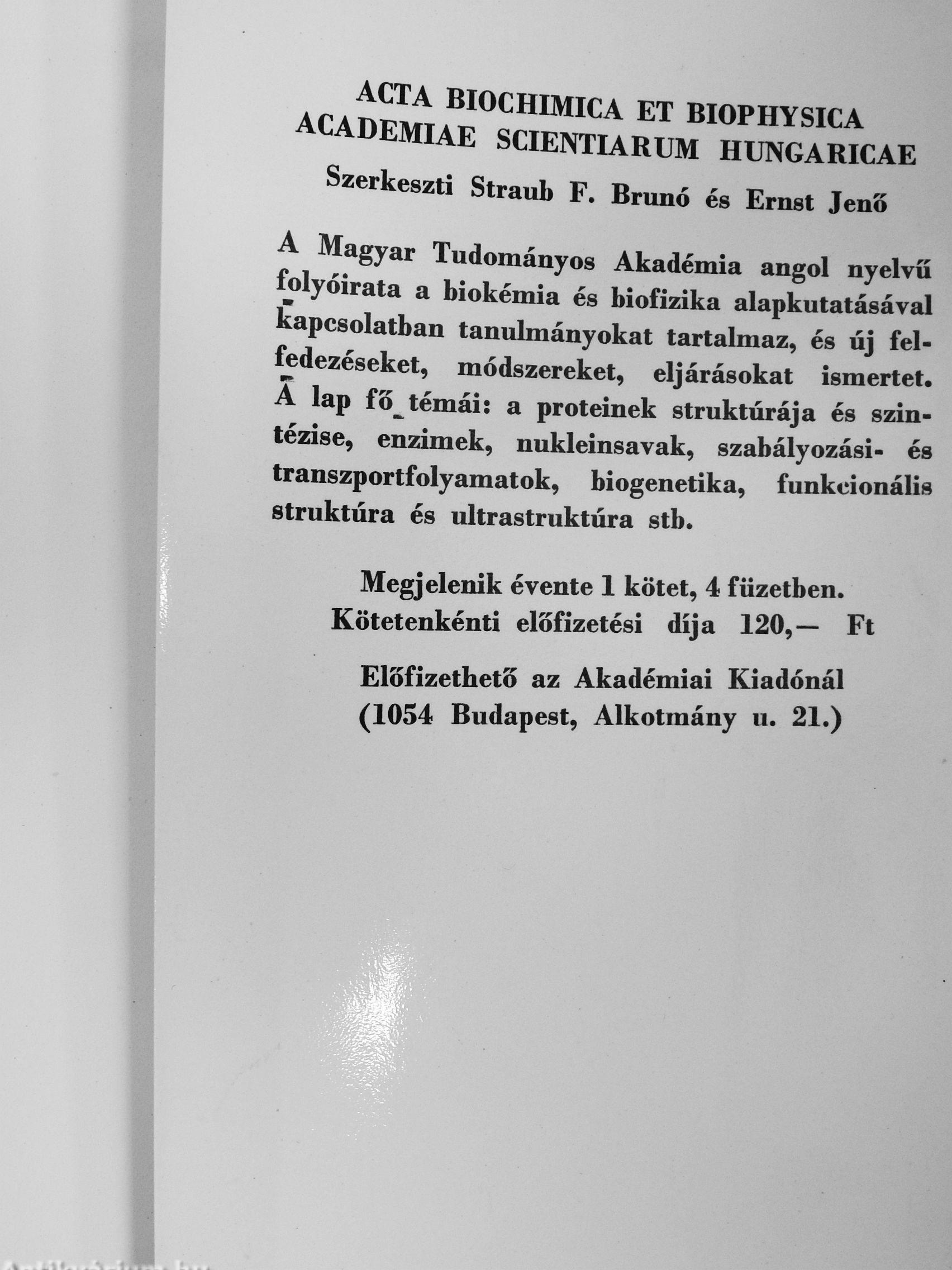 A Magyar Tudományos Akadémia angol nyelvű folyóirata a biokémia és biofizika alapkutatásával kapcsolatban tanulmányokat tartalmaz, és új felfedezéseket, módszereket, eljárásokat ismertet. A lap fö^témái: a proteinek struktúrája és szintézise, enzimek, nukleinsavak, szabályozási- és transzportfolyamatok, biogenetika, funkcionális struktúra és ultrastruktúra stb.