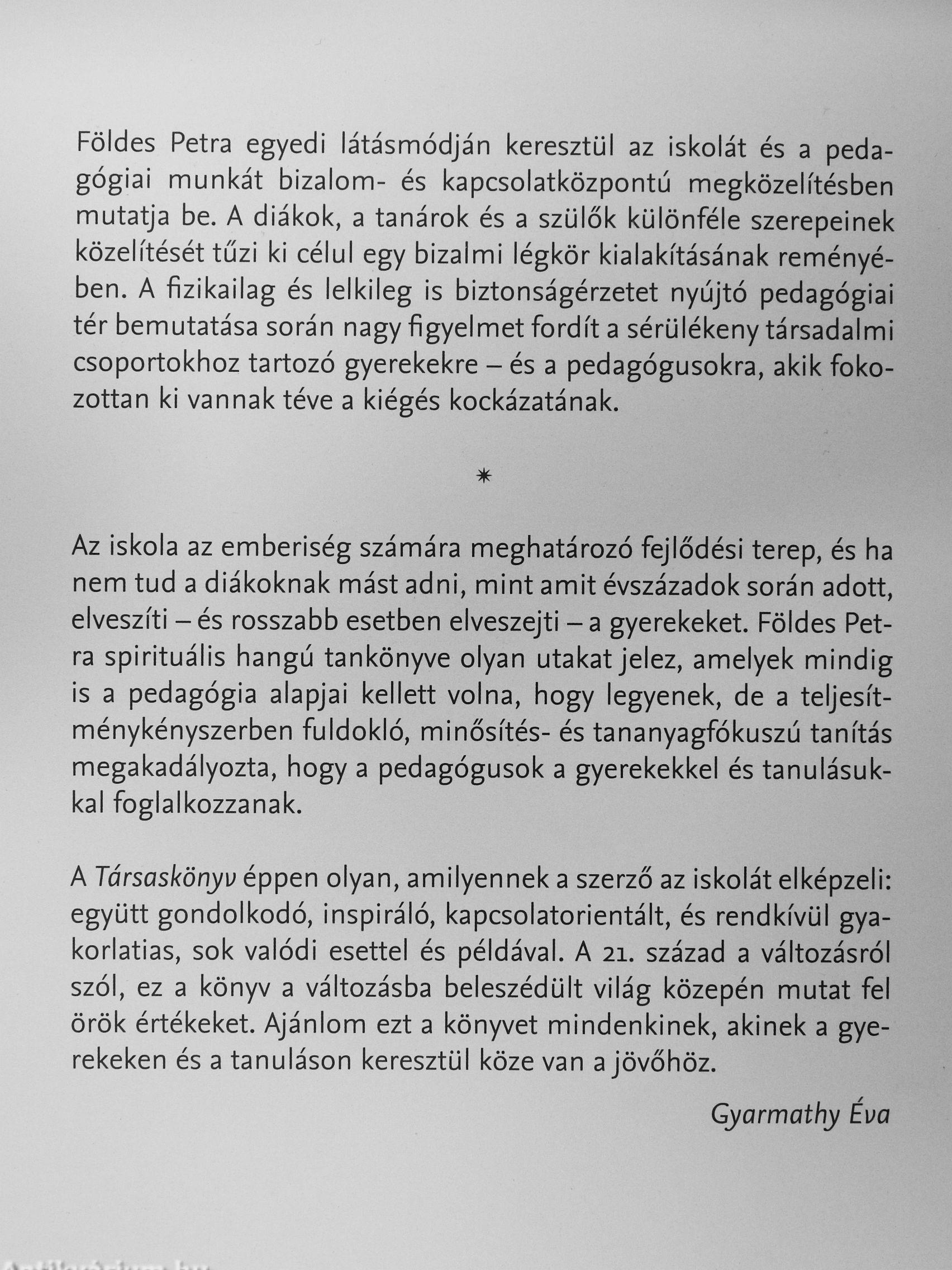 A Társaskönyv éppen olyan, amilyennek a szerző az iskolát elképzeli: együtt gondolkodó, inspiráló, kapcsolatorientált, és rendkívül gyakorlatias, sok valódi esettel és példával. A 21. század a változásról szól, ez a könyv a változásba beleszédült világ közepén mutat fel örök értékeket. Ajánlom ezt a könyvet mindenkinek, akinek a gyerekeken és a tanuláson keresztül köze van a jövőhöz.